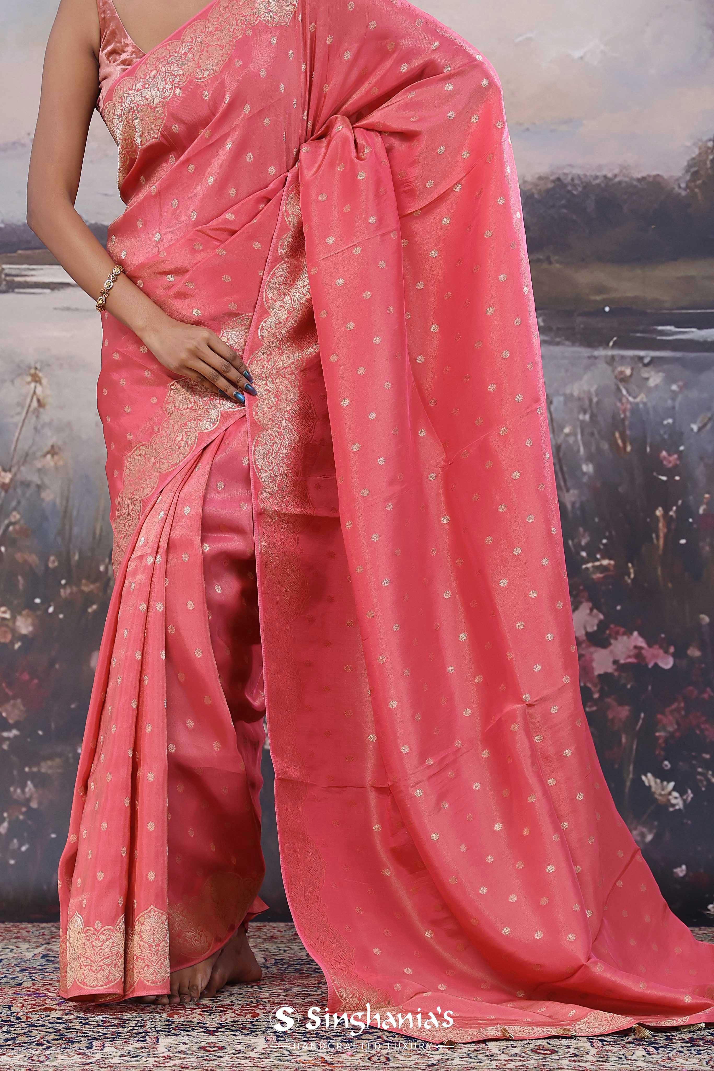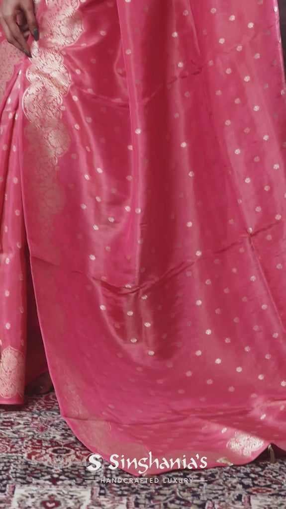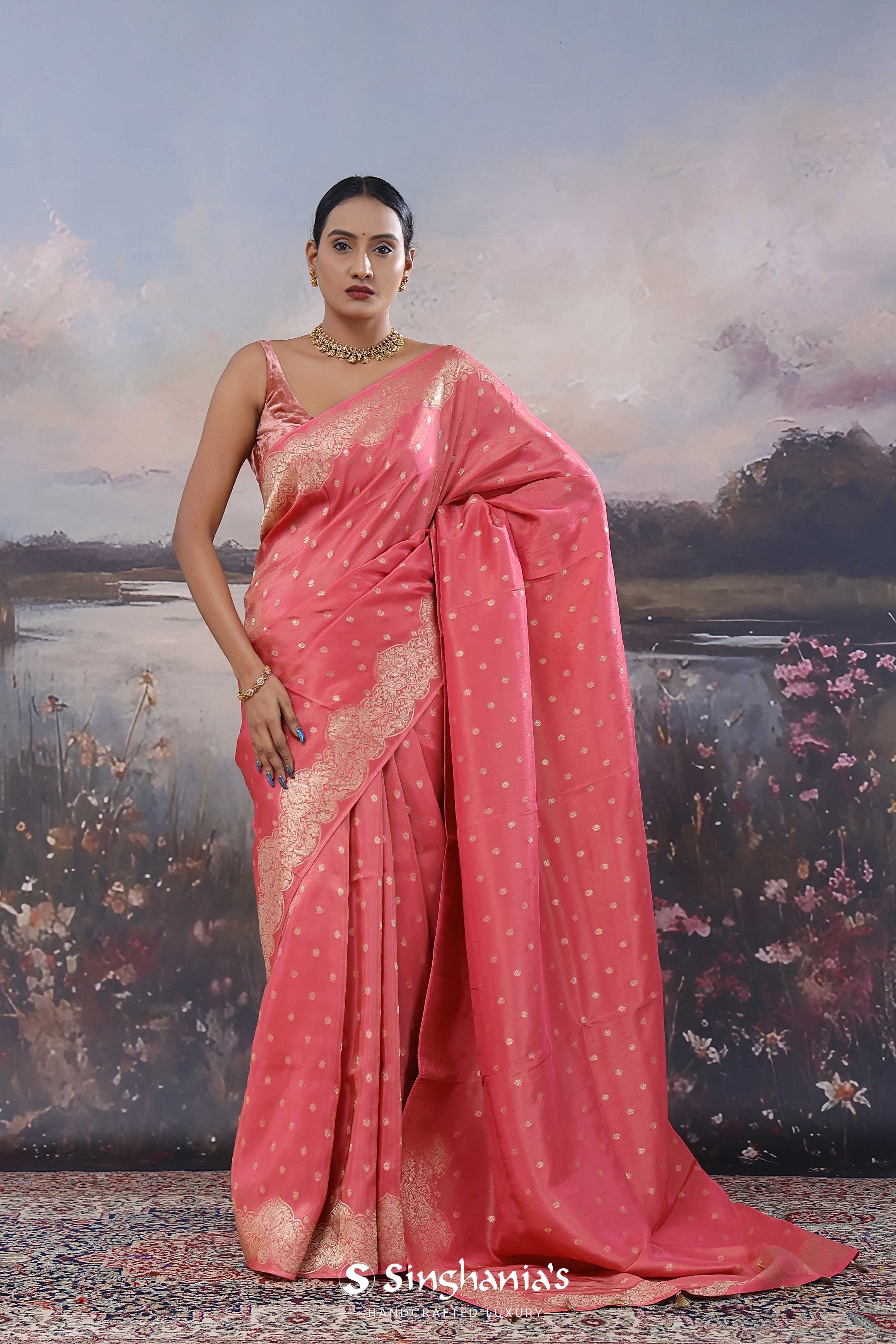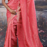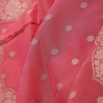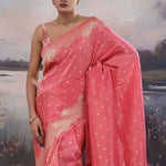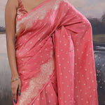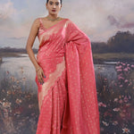 The authentic silk base of the Light carmine pink banarasi saree featuring butti's and self border adorned with floral design making every moment festive.