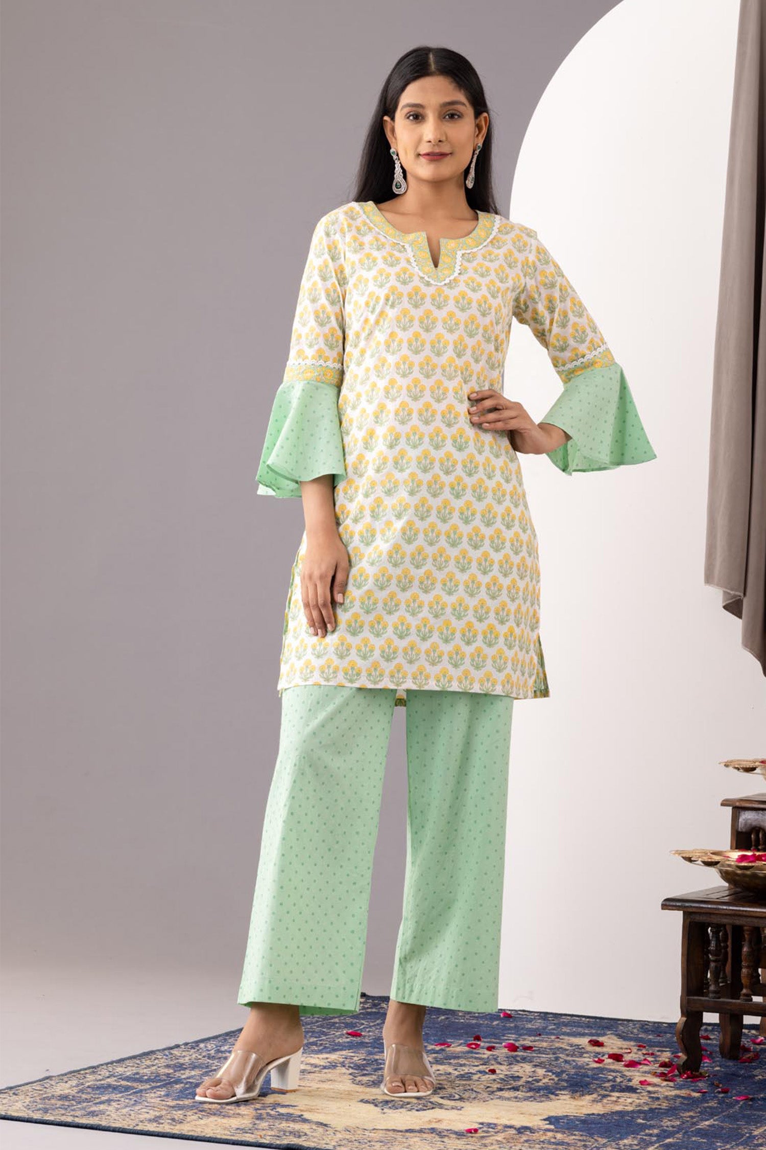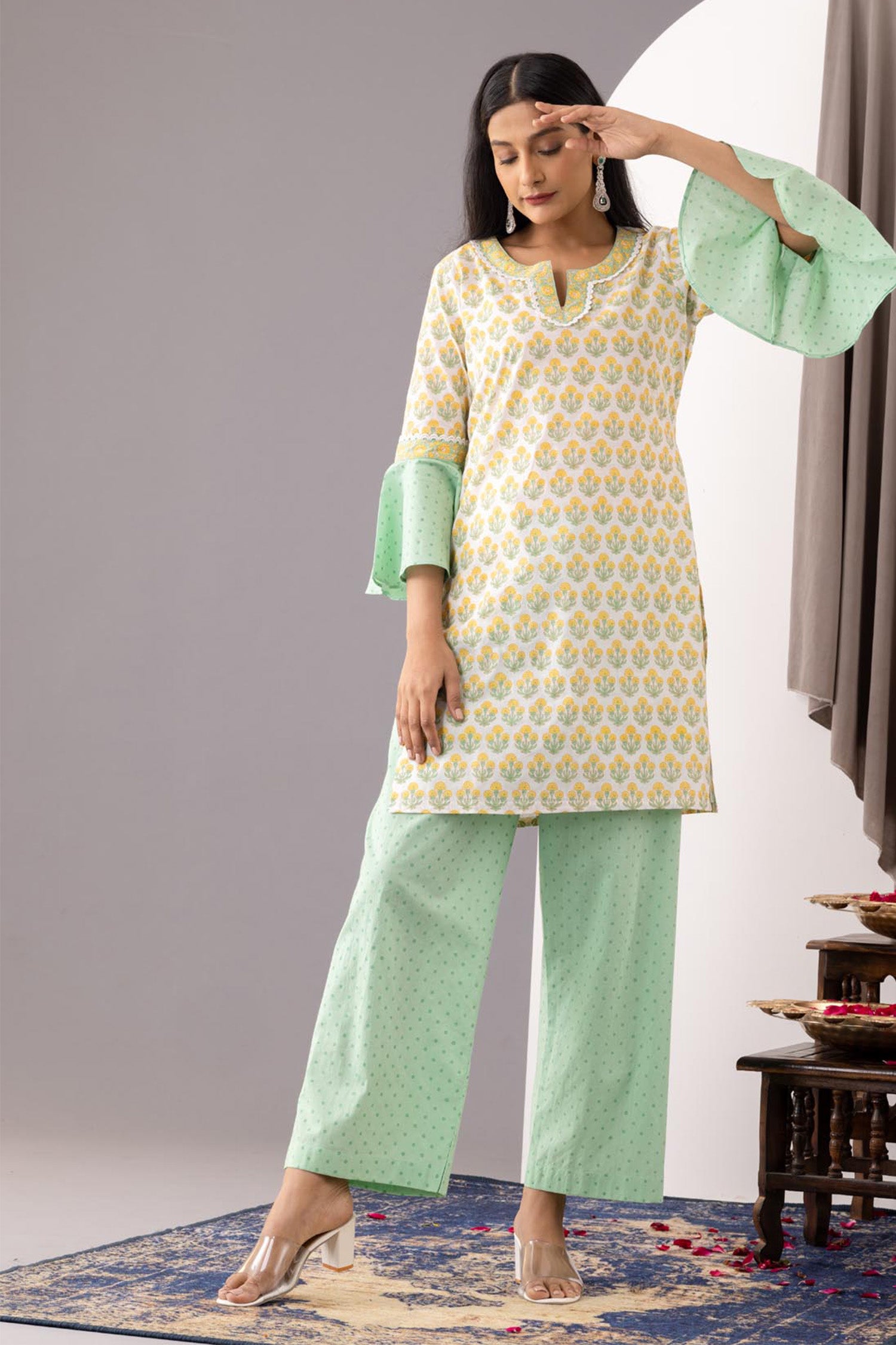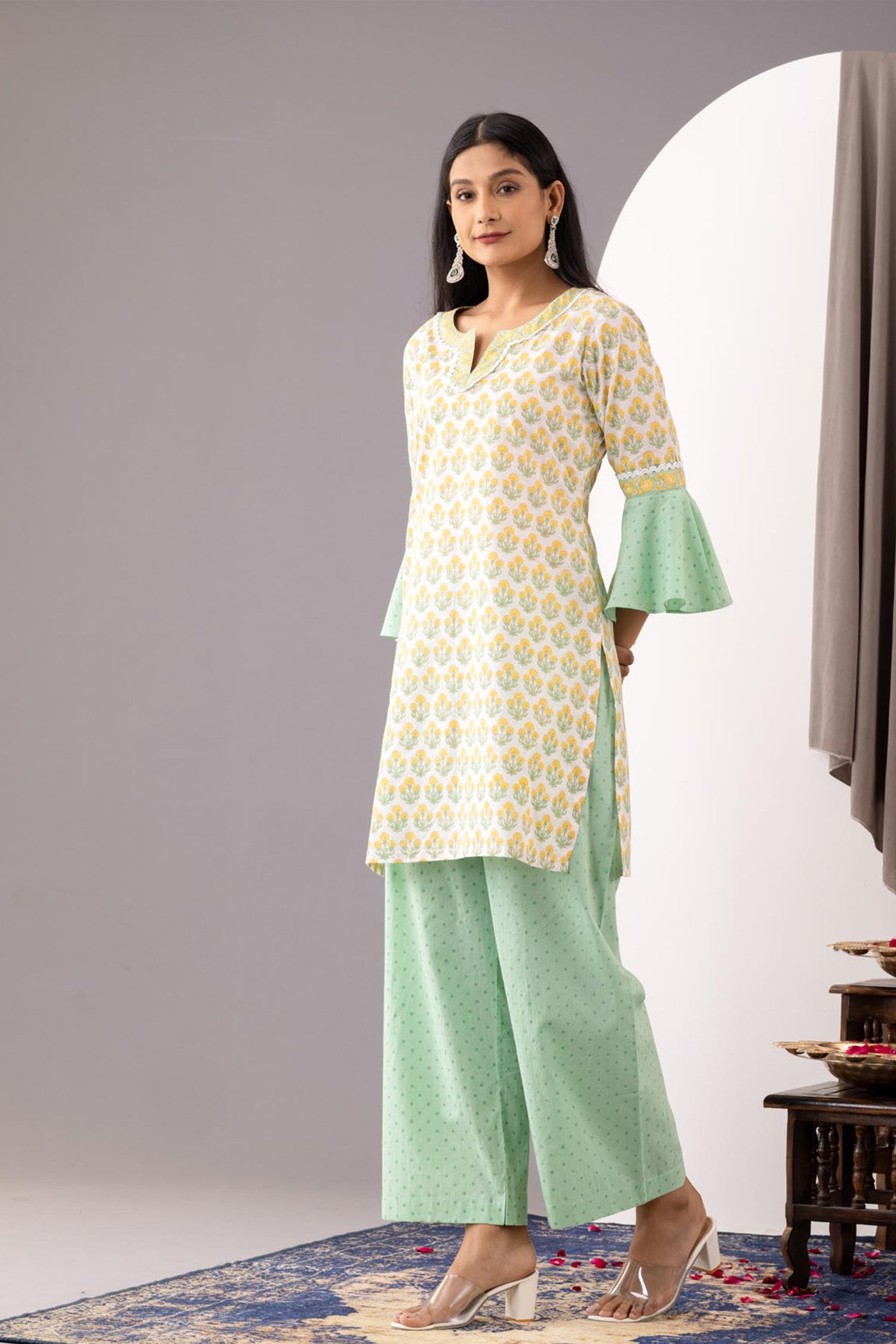 Light Green Block Printed Cotton Straight Kurta And Palazzo