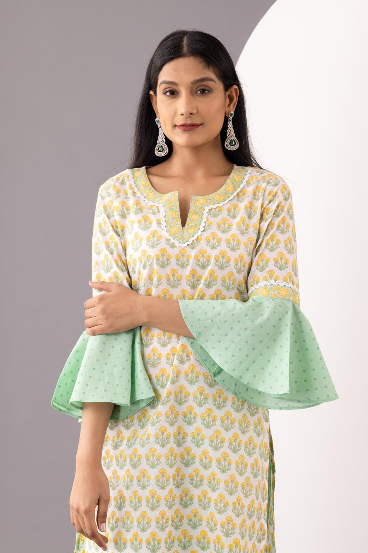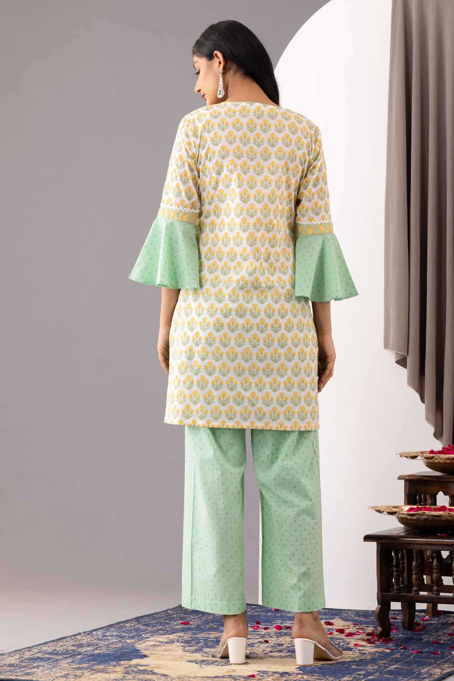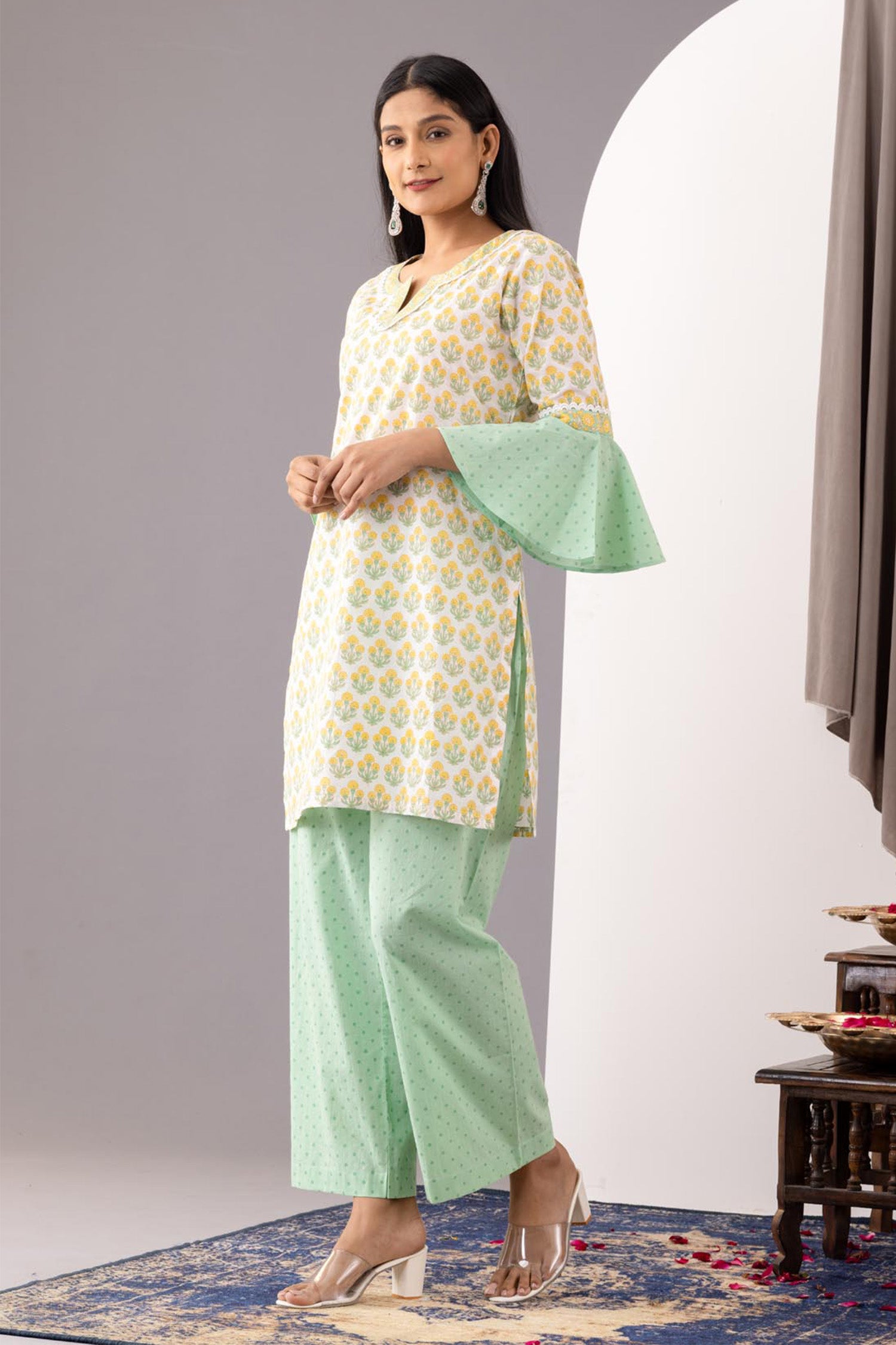 Light Green Block Printed Cotton Straight Kurta And Palazzo