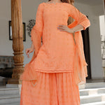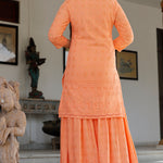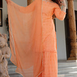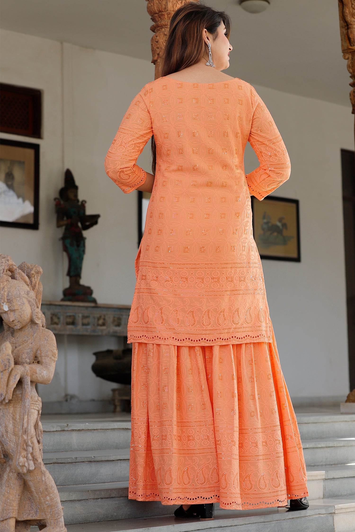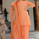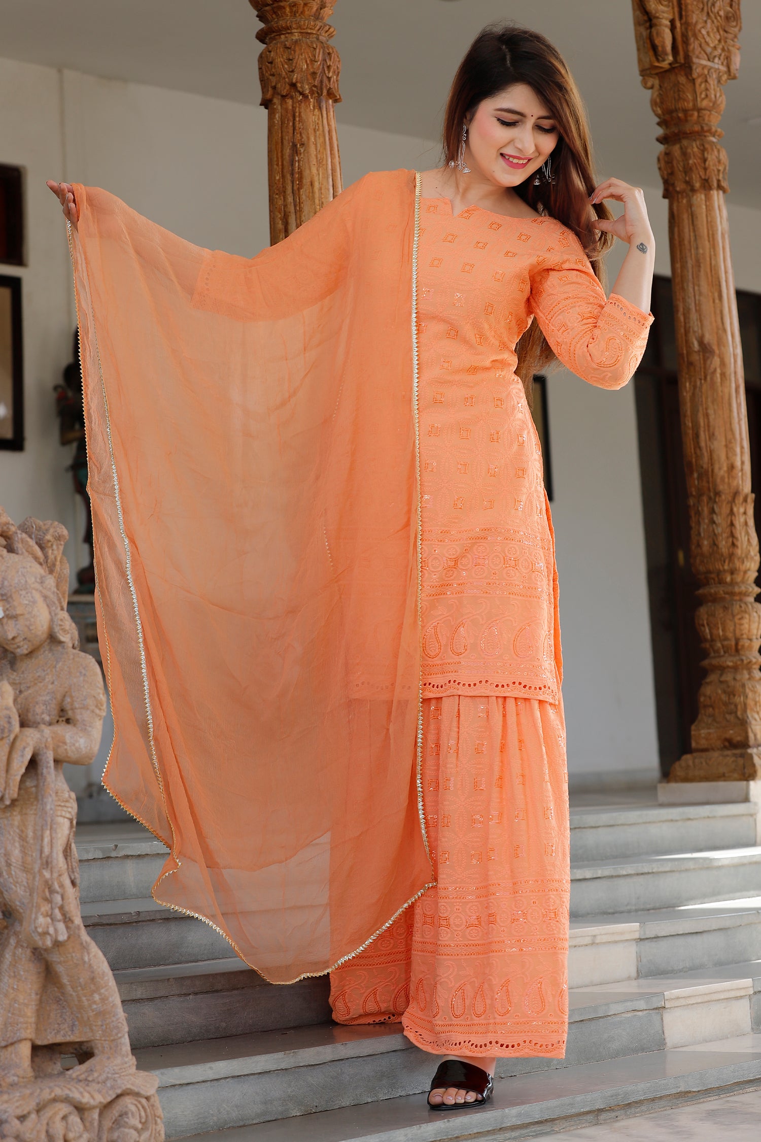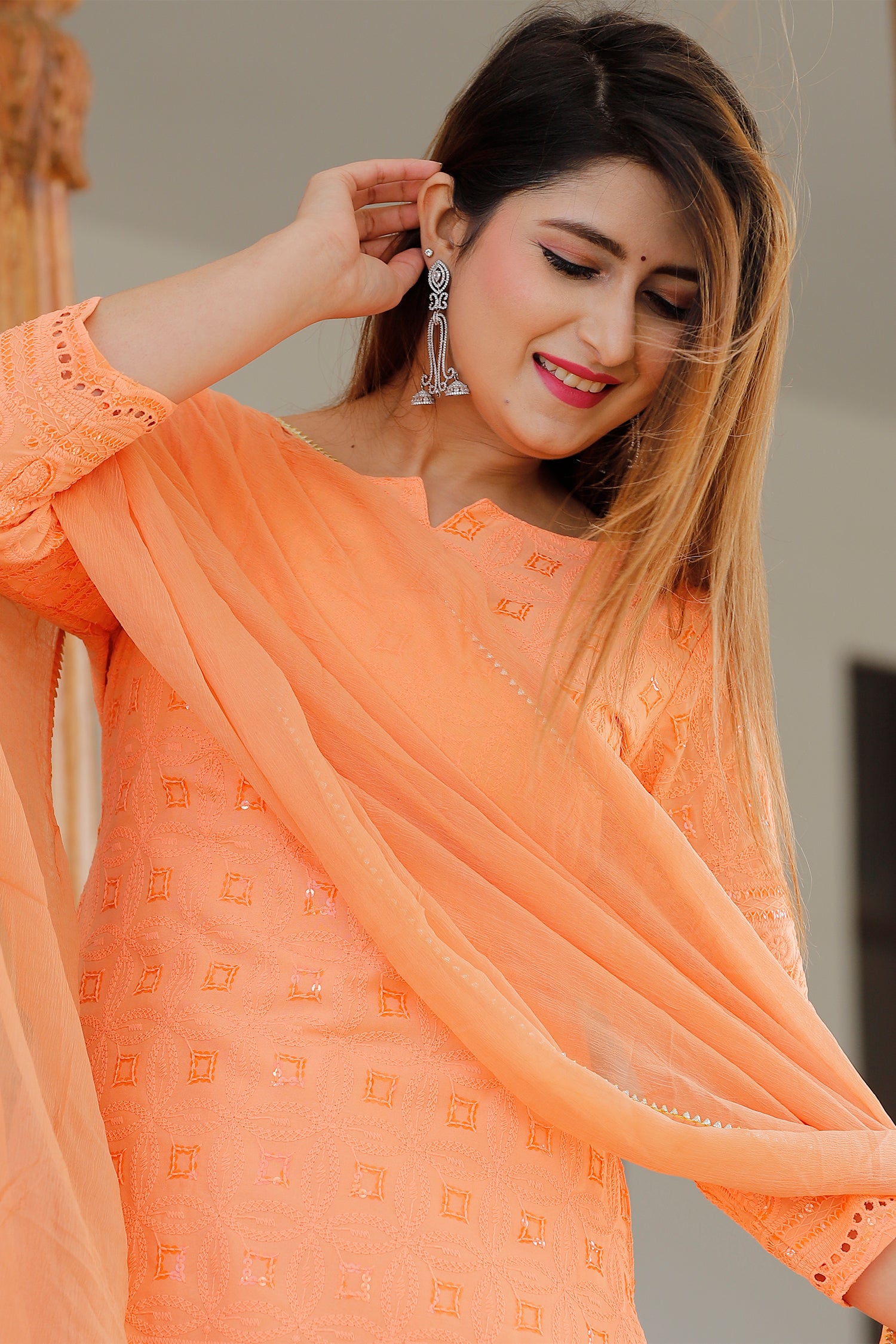 The light orange rayon traditional kurti set with chikankari work kurti and a matching palazzo with dupatta for a subtle charm and neat finish which combines tradition and comfort.