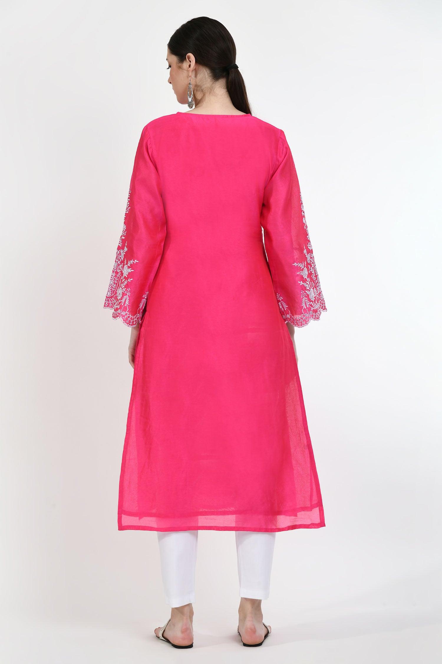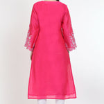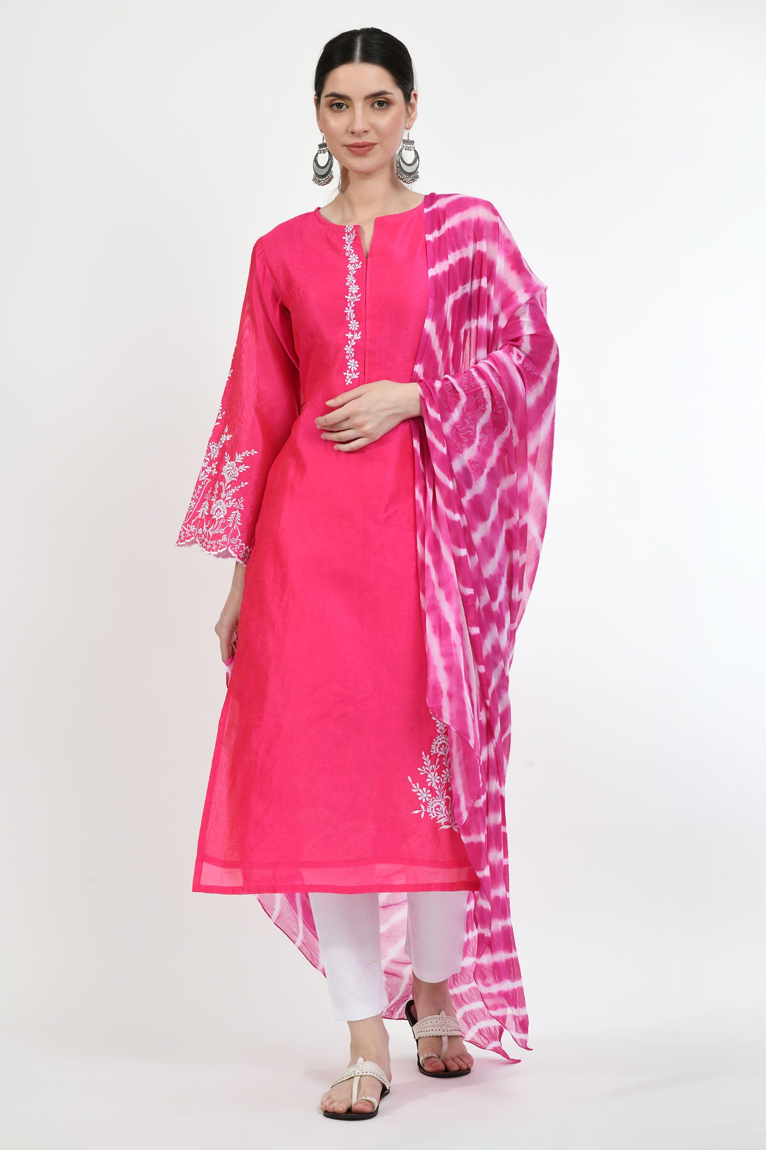 Mexican Pink Raw Silk Floral Embroidered Kurti Set