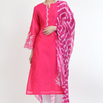 The mexican pink raw silk floral embroidered kurti with pants and dupatta for a neat and elegant look that combines trendy comfort with tradition in a classy appearance.