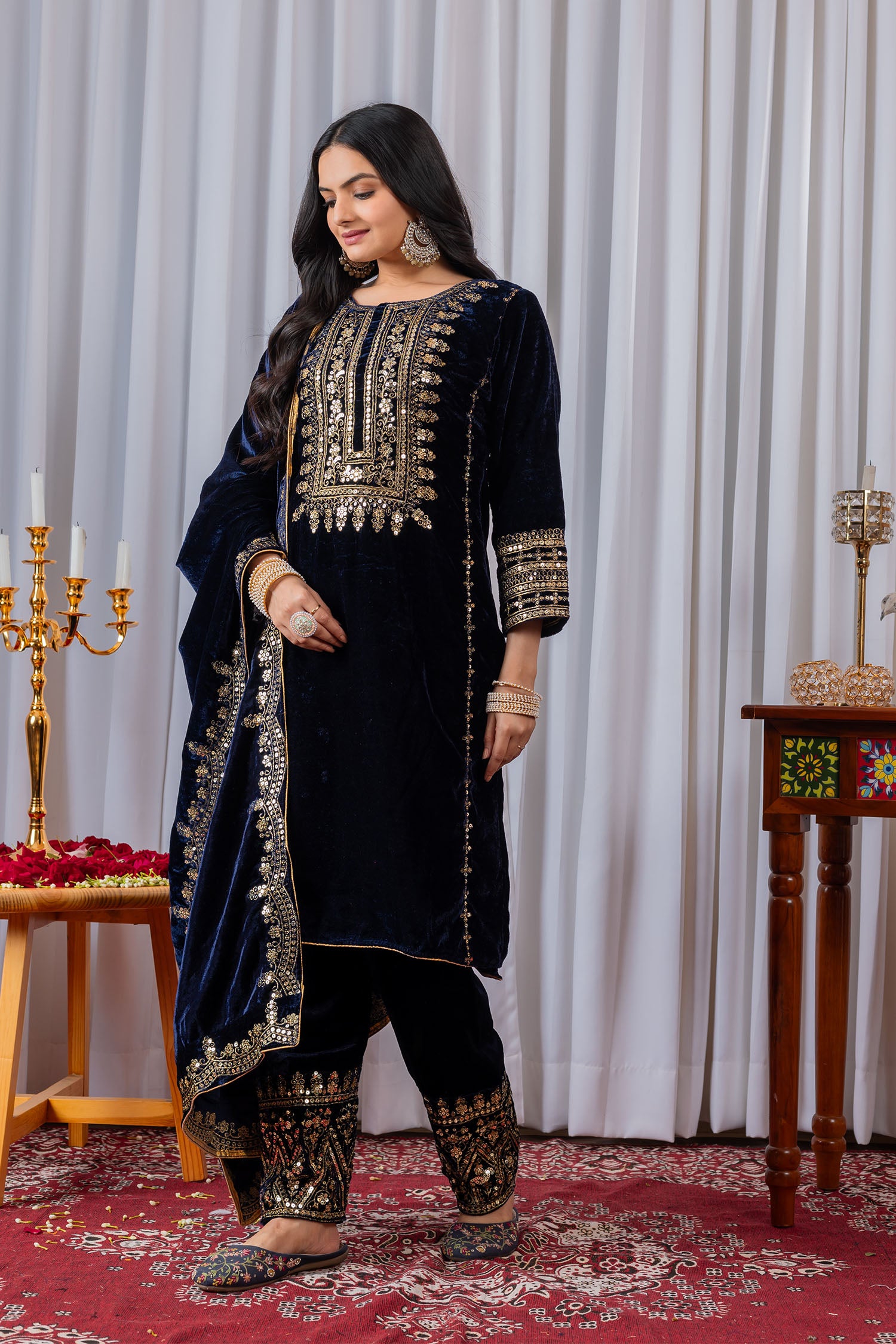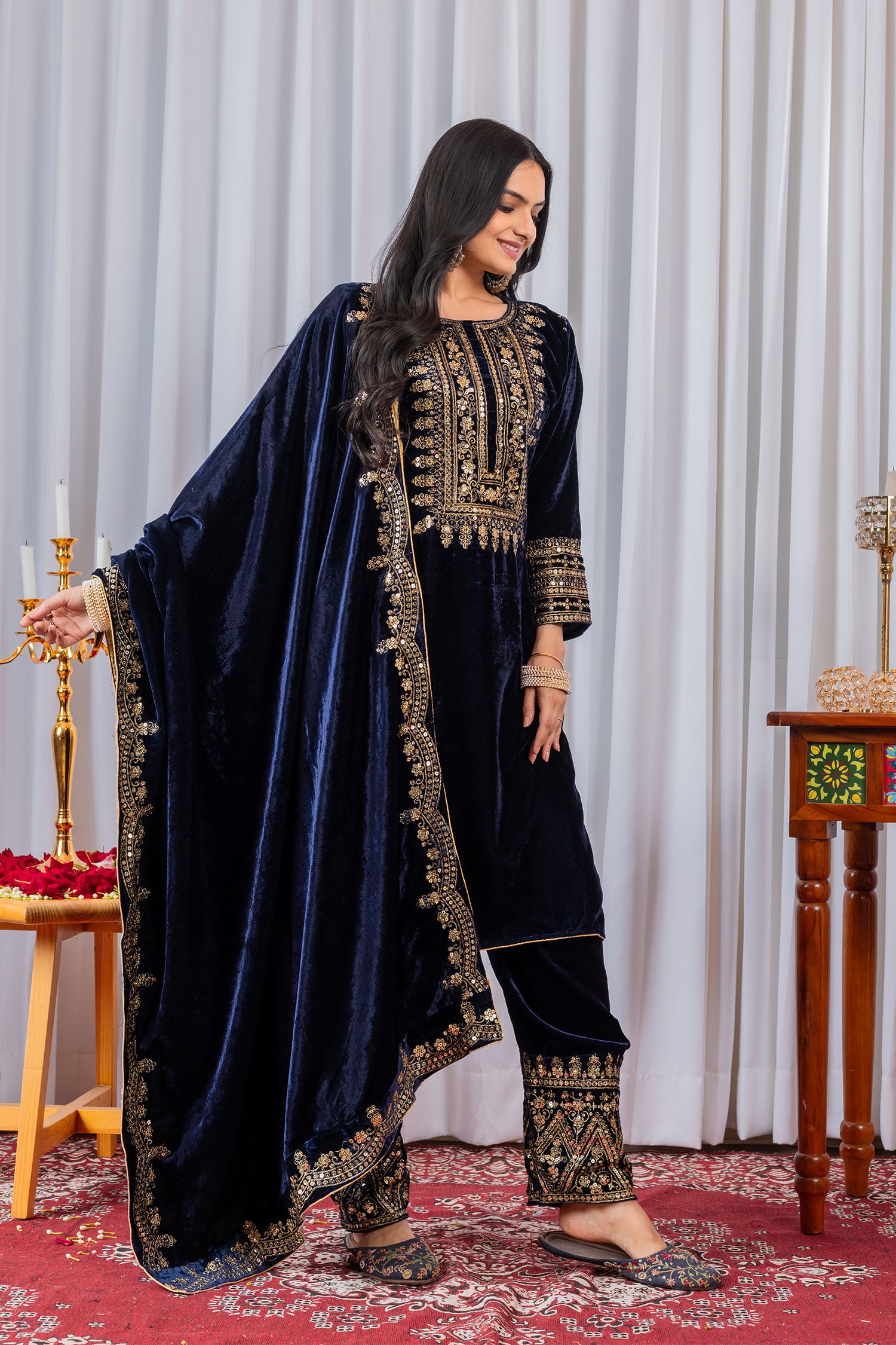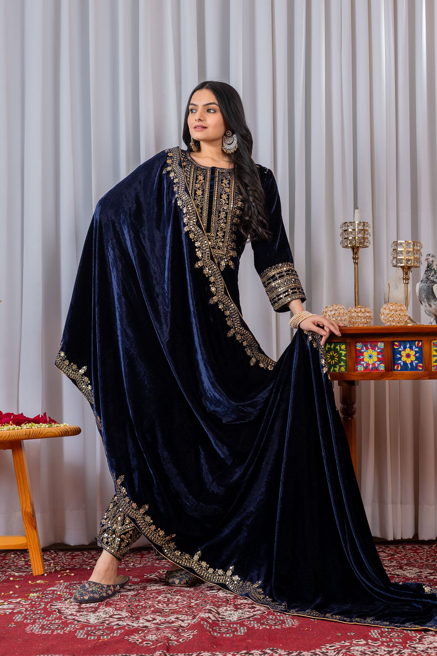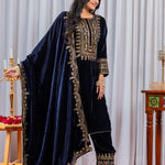 The beautiful navy blue velvet embroidered kurti set with matching dupatta and pant for a rich and elegant look with gracious feel.