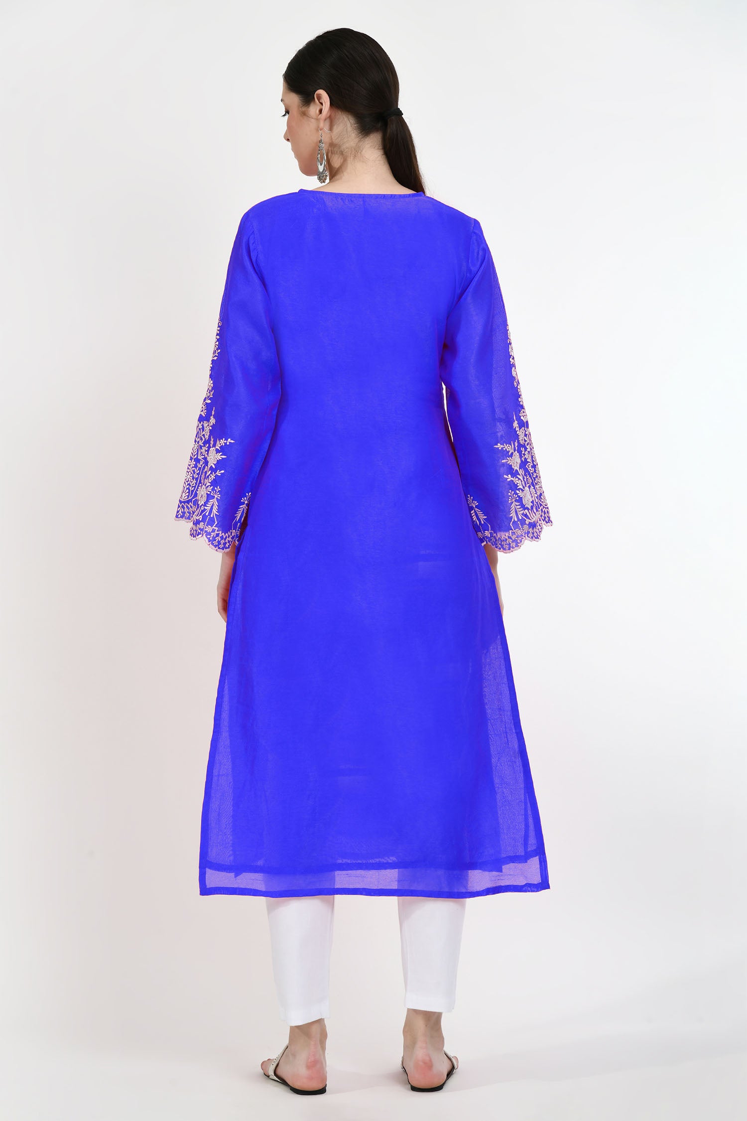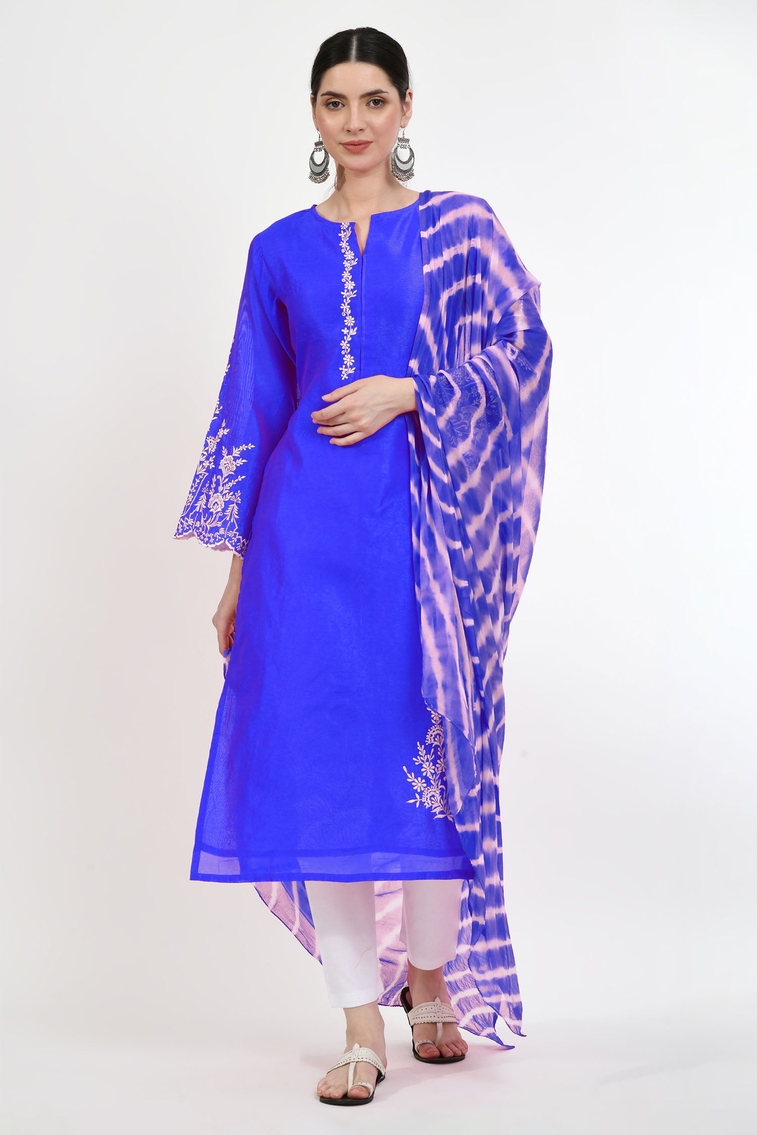 The neon blue raw silk floral embroidered kurti with pants and dupatta for a neat and elegant look that combines trendy comfort with tradition in a classy appearance.