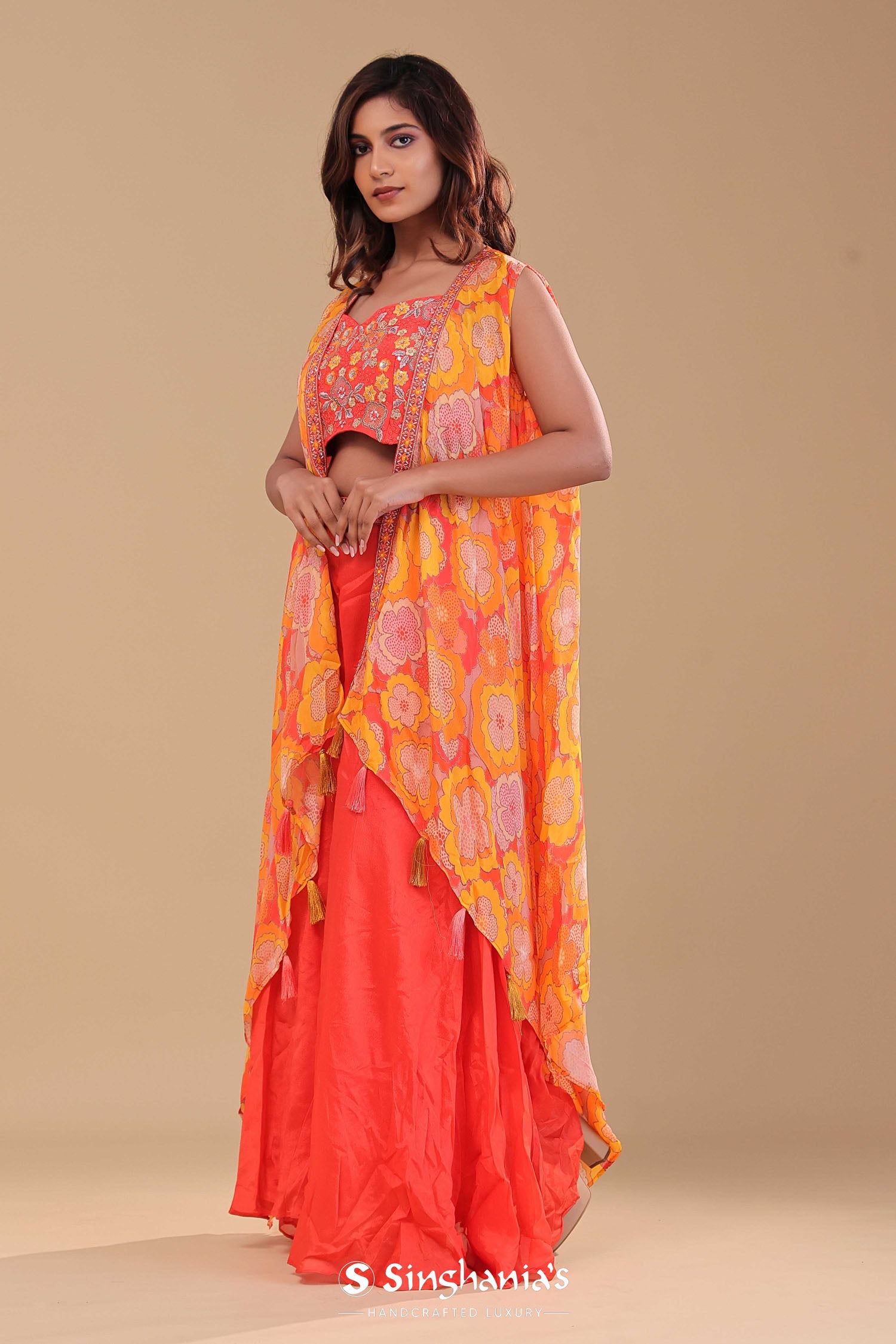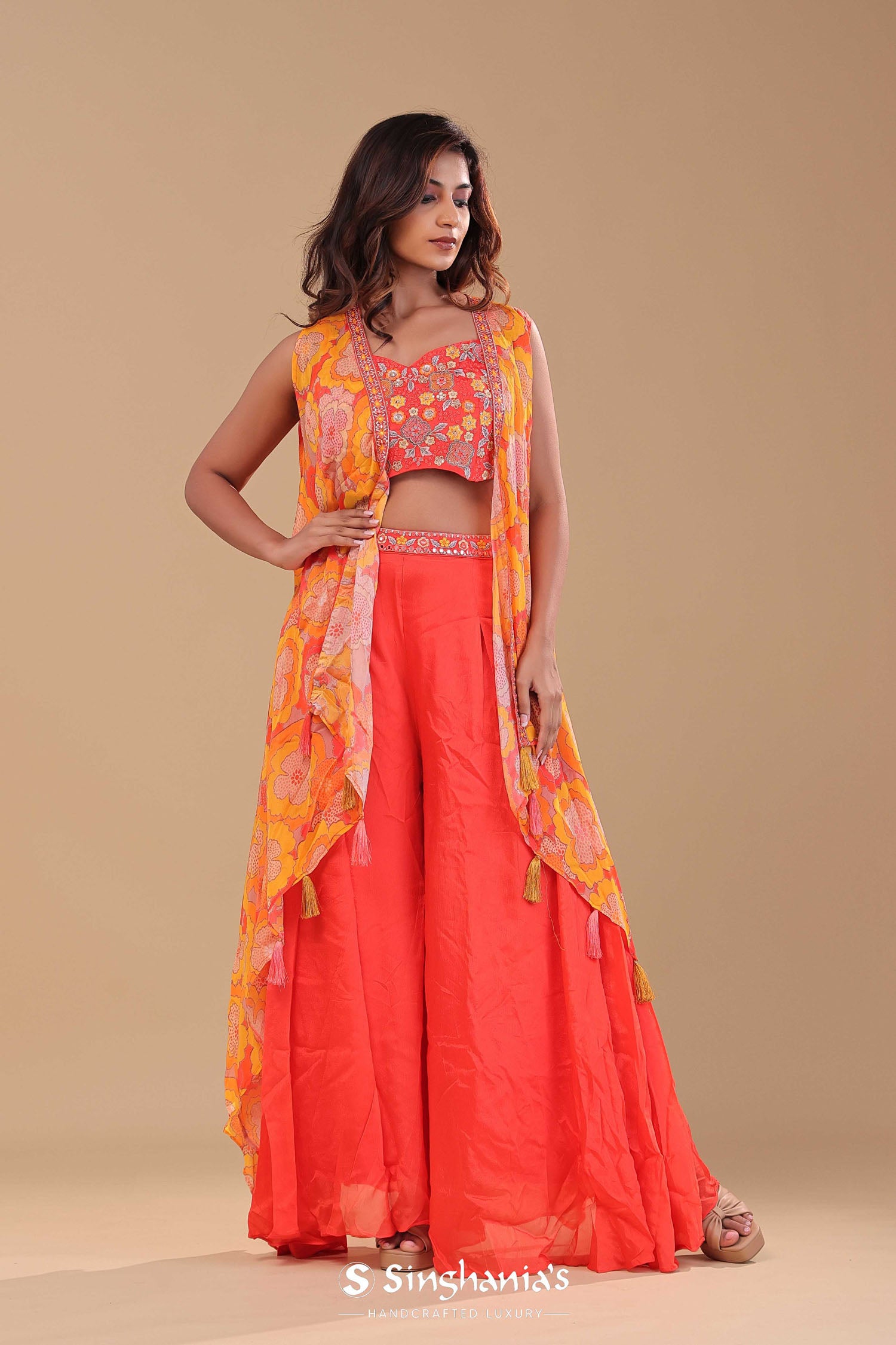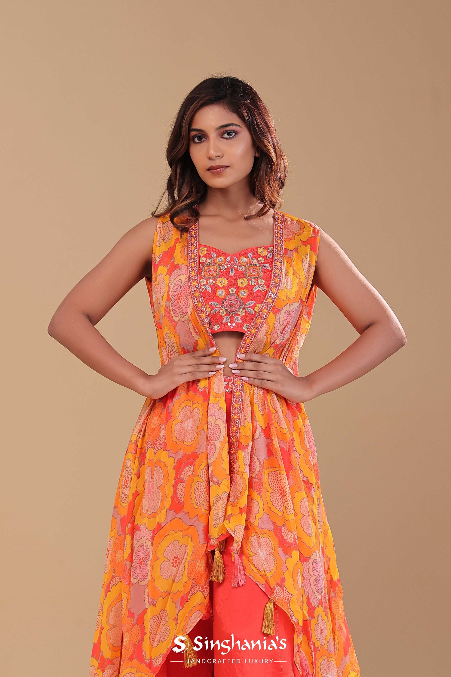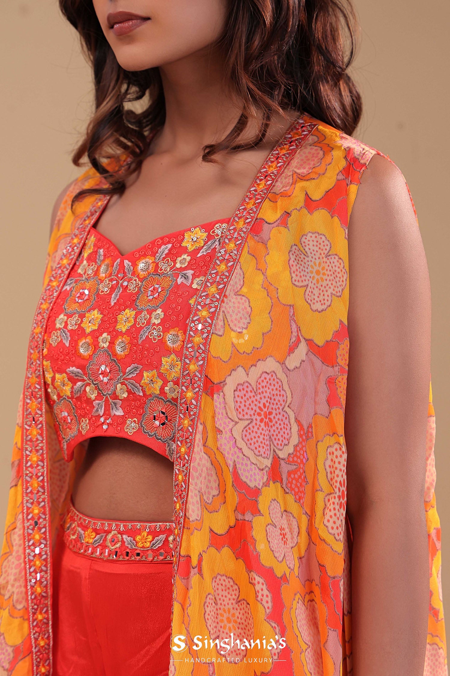 Orange chinon crepe indo-western set features sweetheart neckline blouse adorned with colorful floral embroidery and sequins work along plain palazzo pants. The blouse is attached to the shrug adorned with floral prints which adds the finish touch to the entire garment