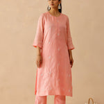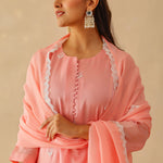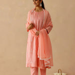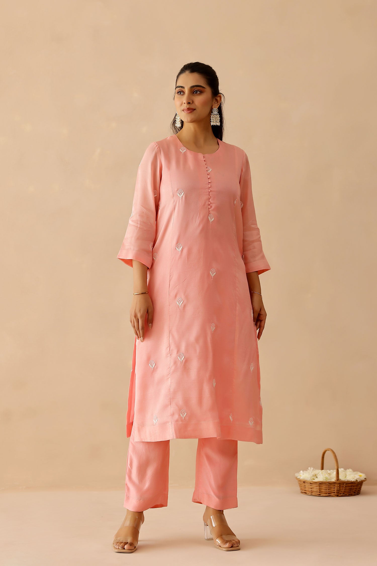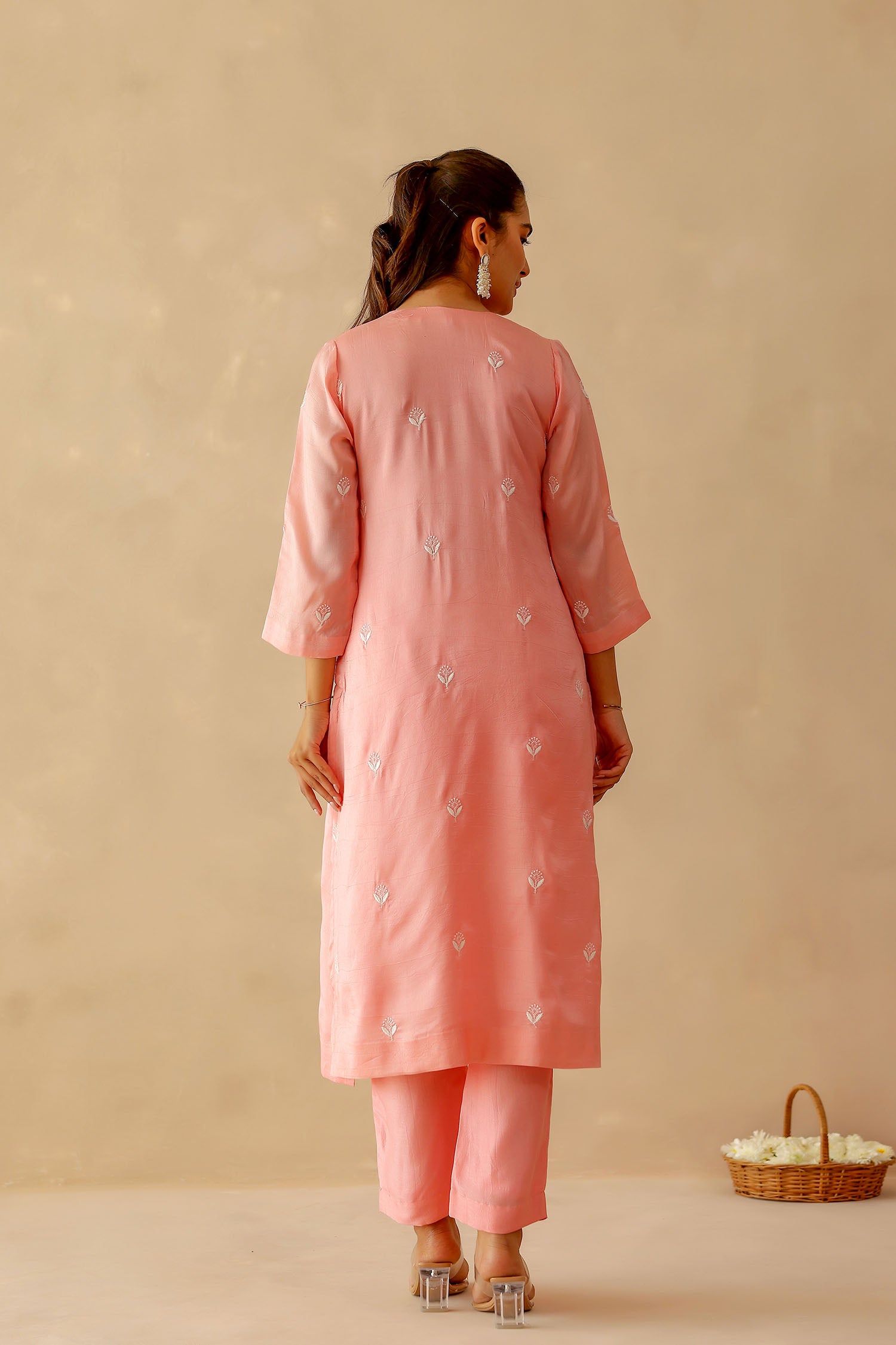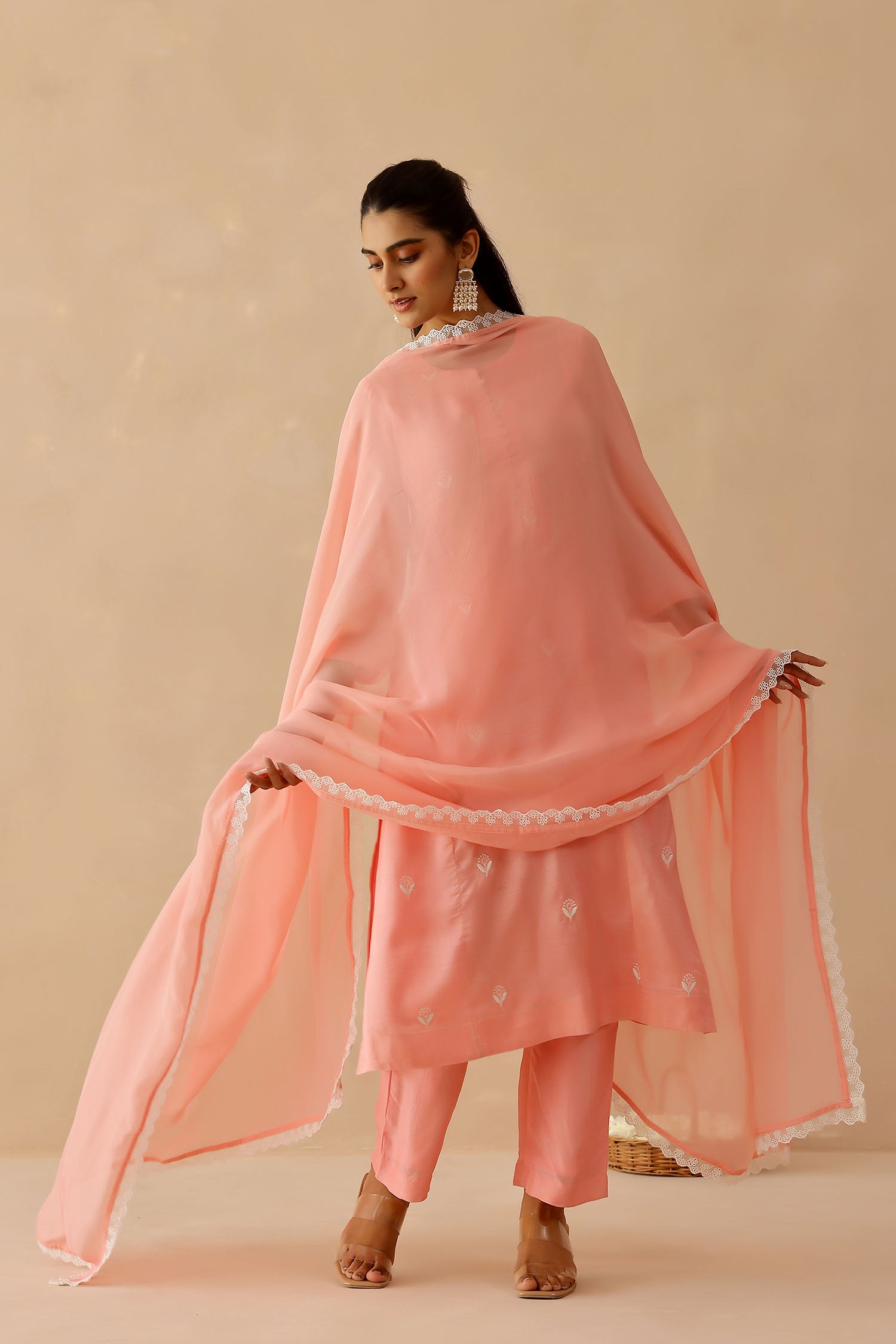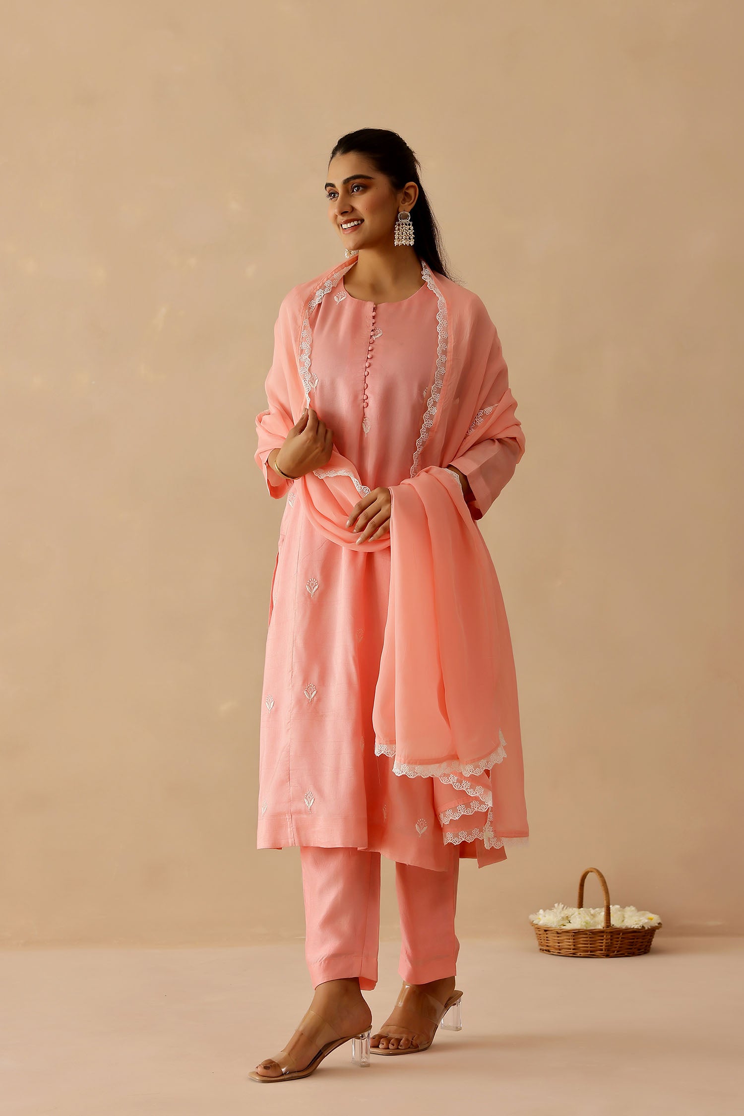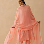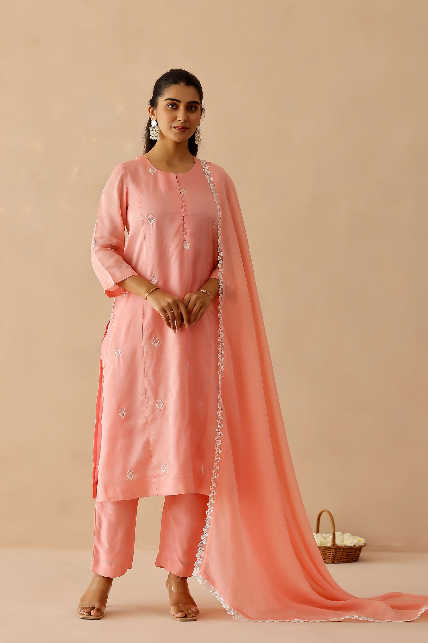 The peach russian silk floral embroidered kurti set with matching pant and an organza dupatta for a simple look that gives subtle and elegant charm.