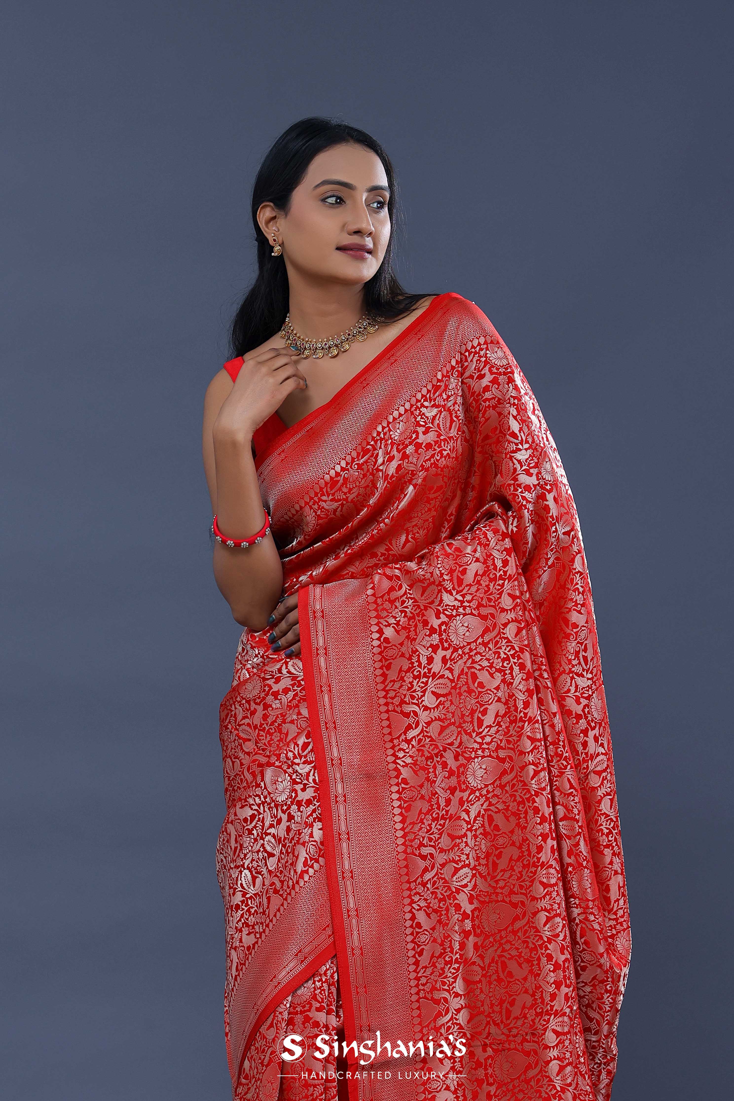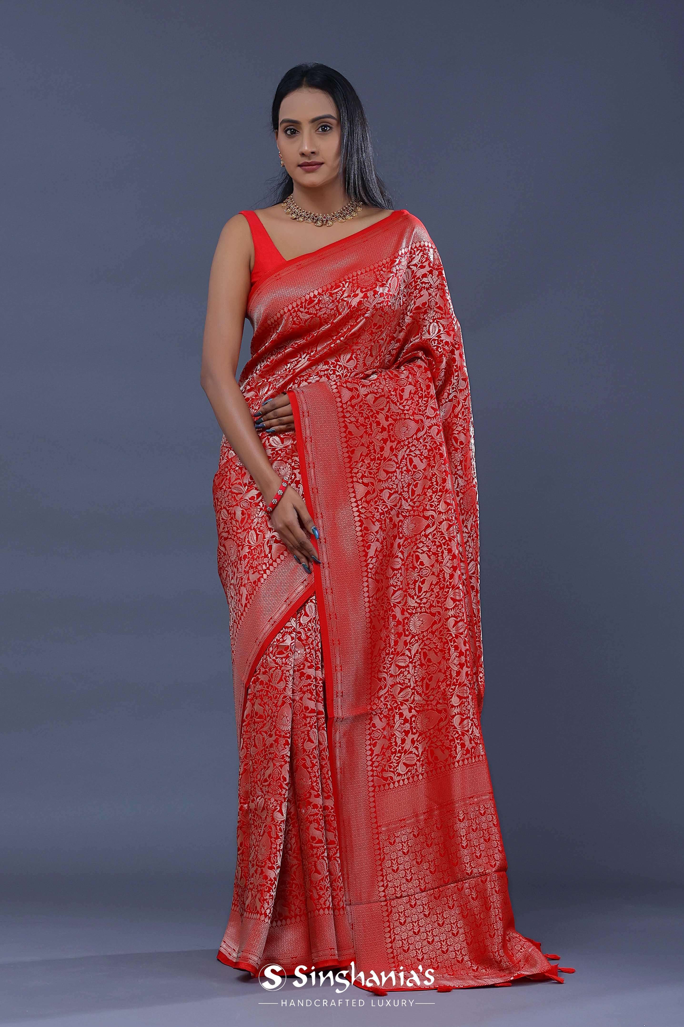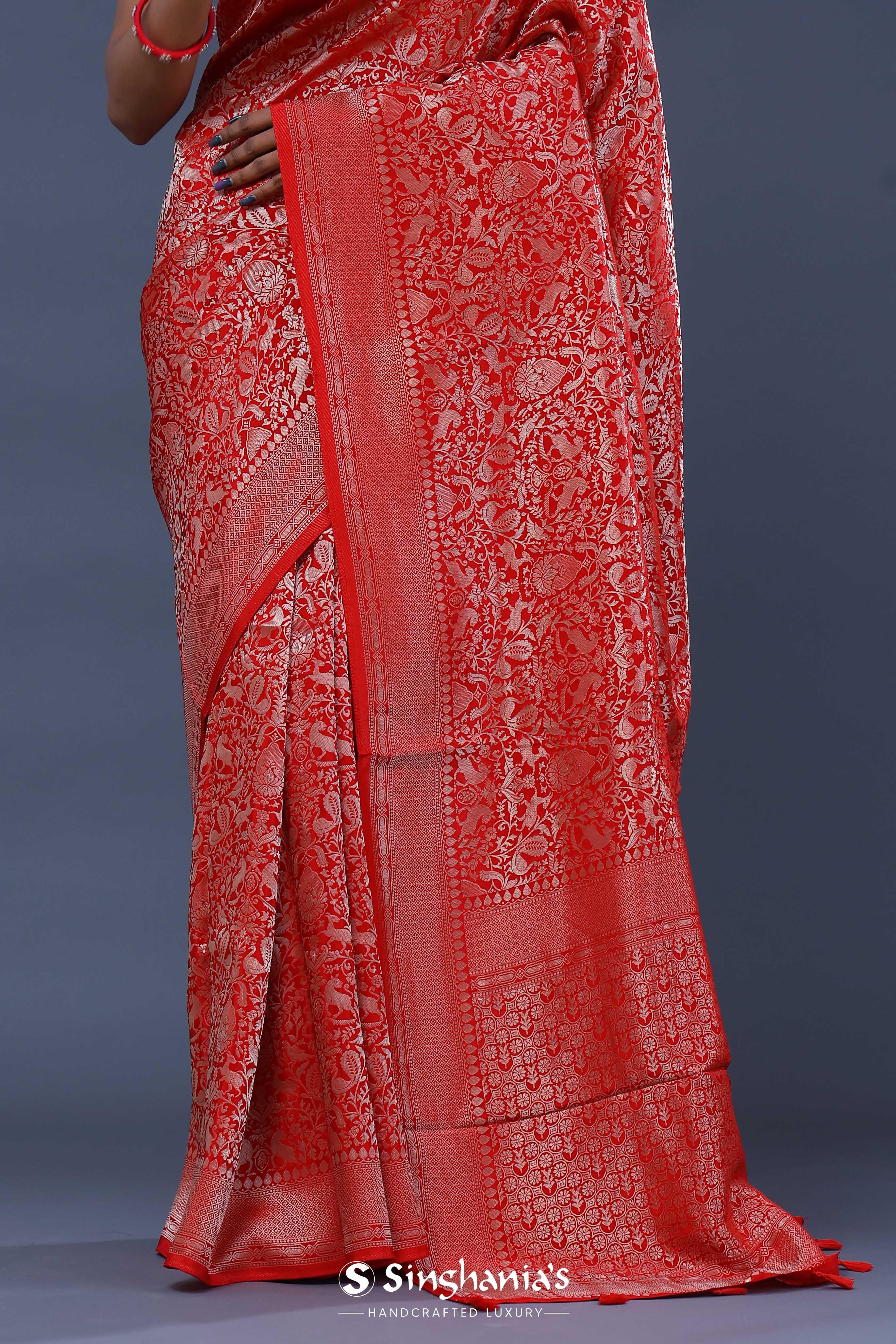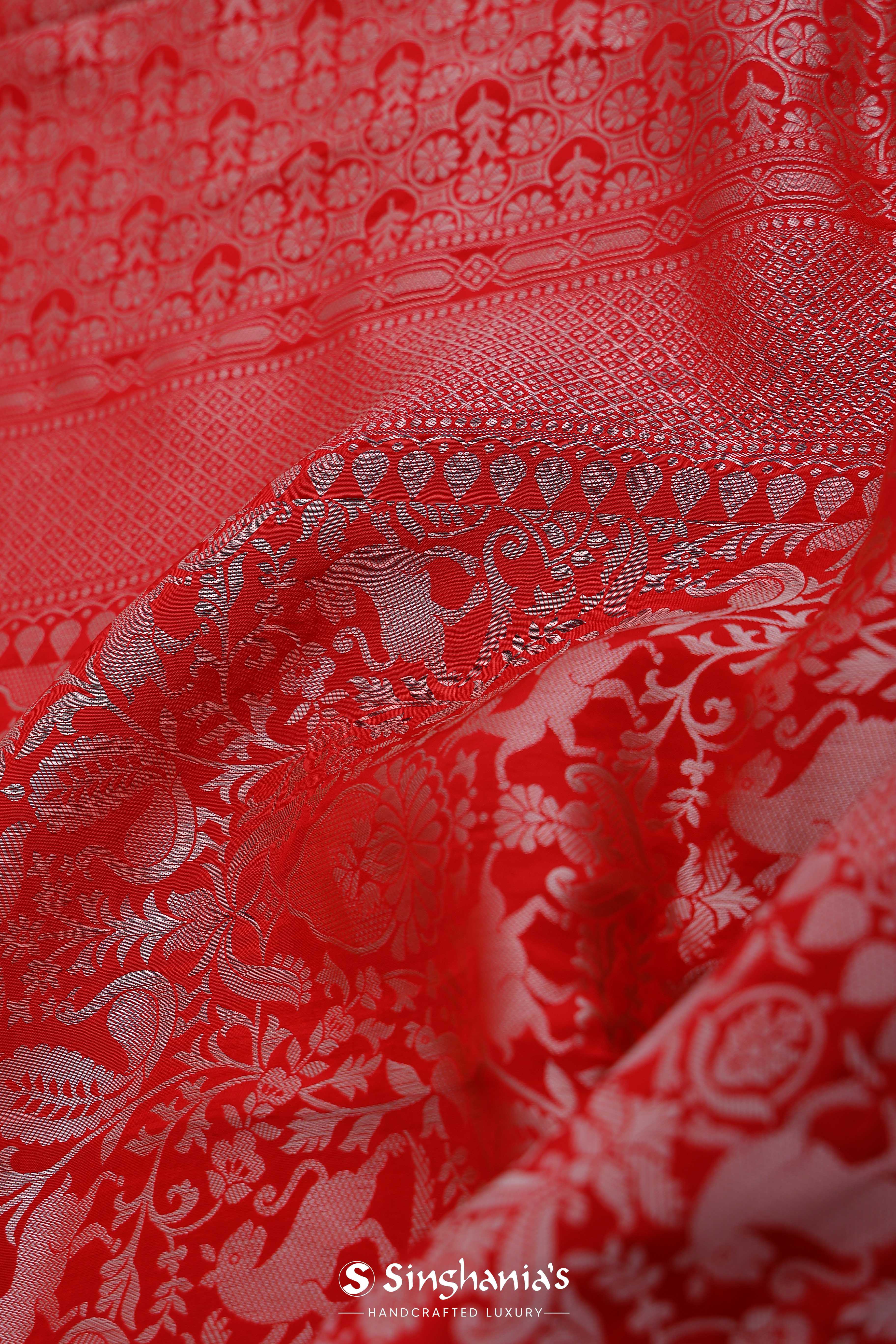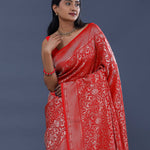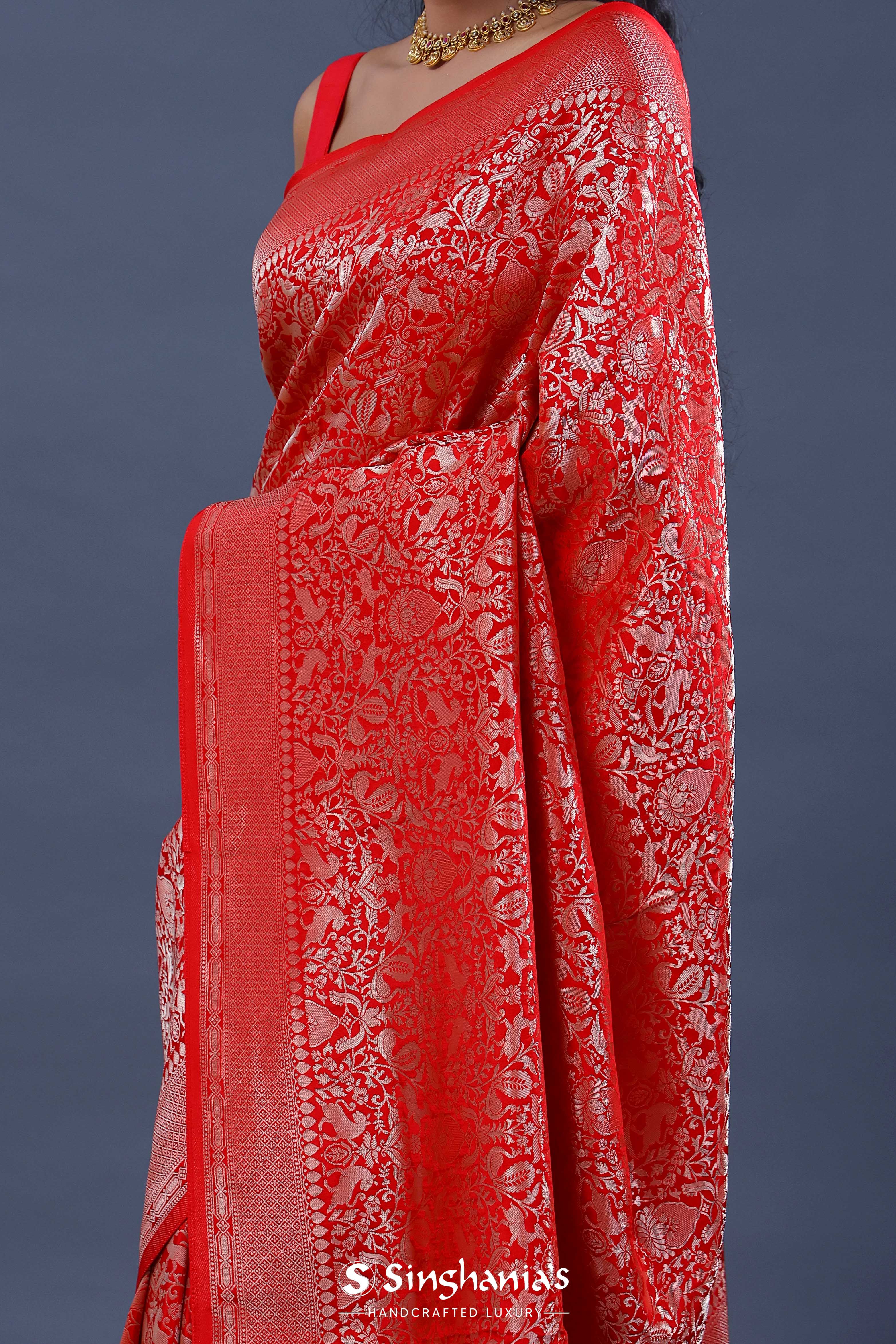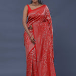 The luxurious texture and sheen features of this Red banarasi saree which is adorned with pure zari work presenting a jungle theme on entire body accompanied with matching zari border which is making it suitable for all events