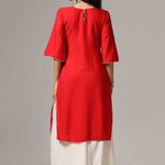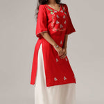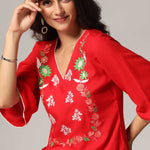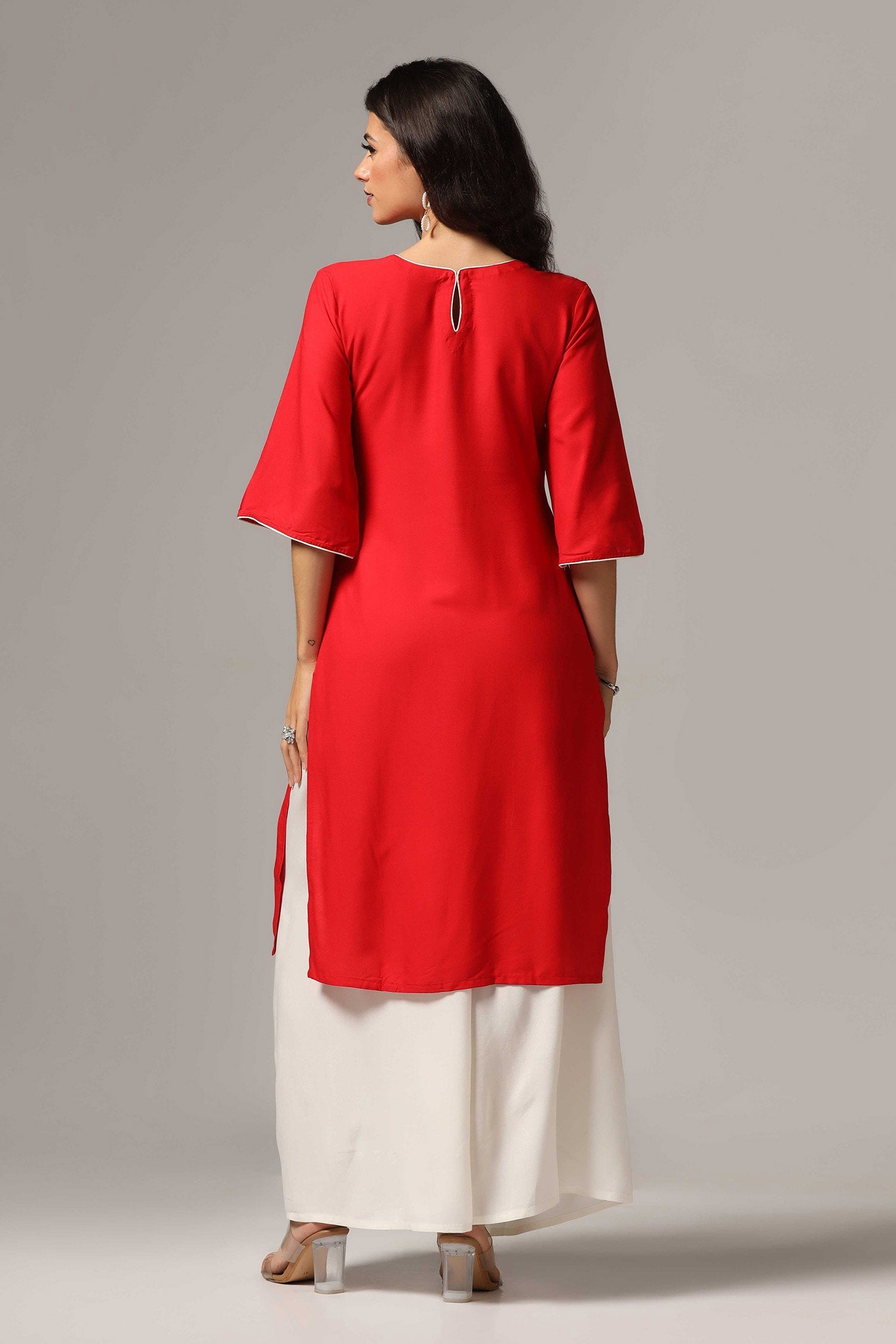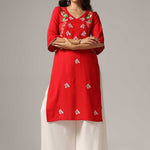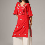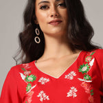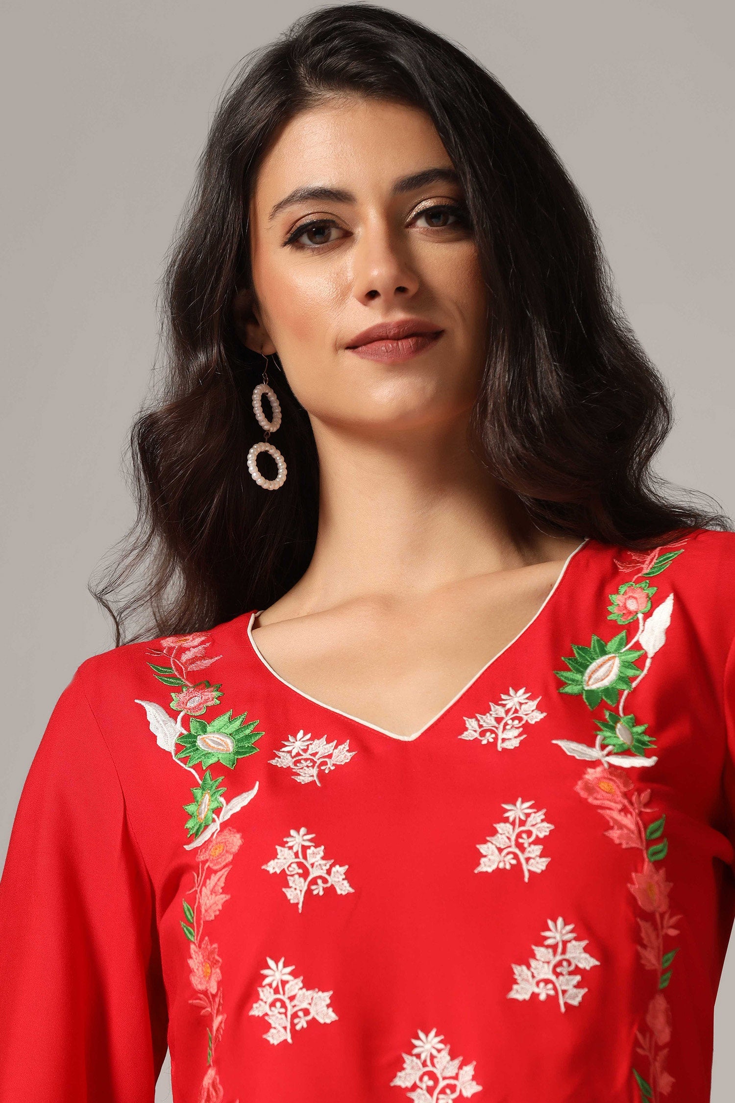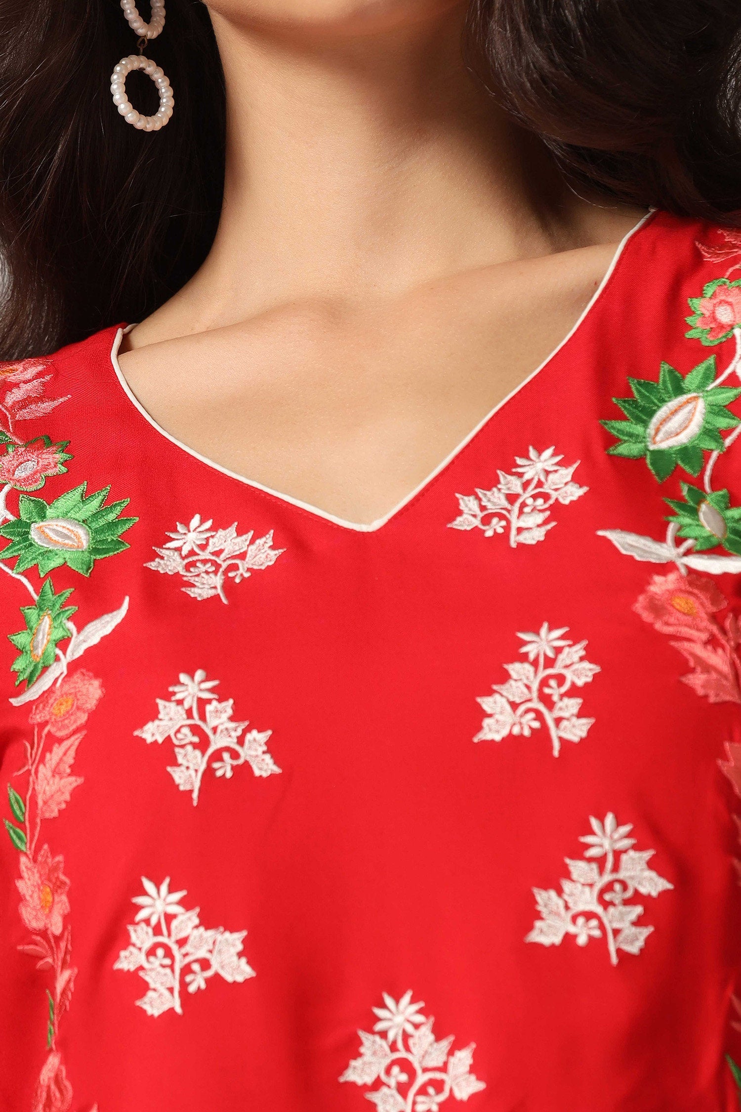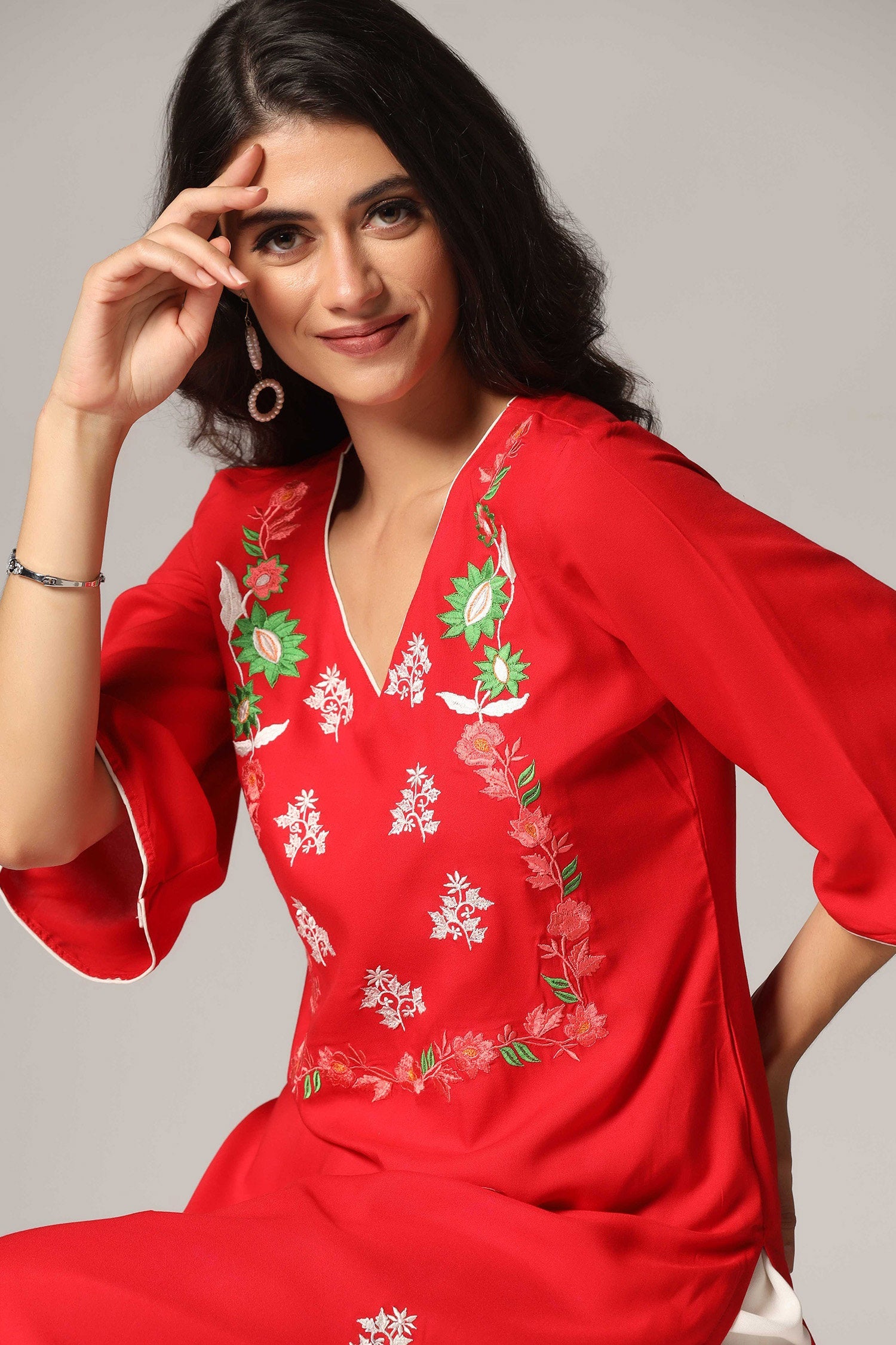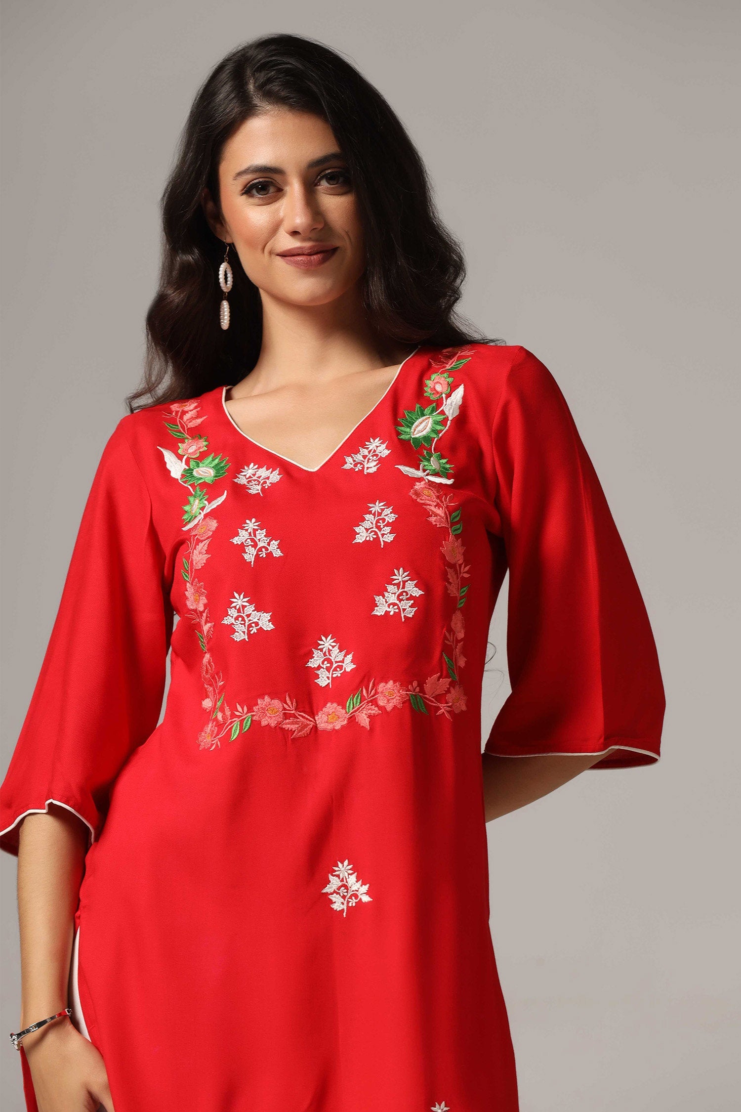 The red rayon multicoloured resham embroidered kurti paired with pants for a majestic appearance in tradition.