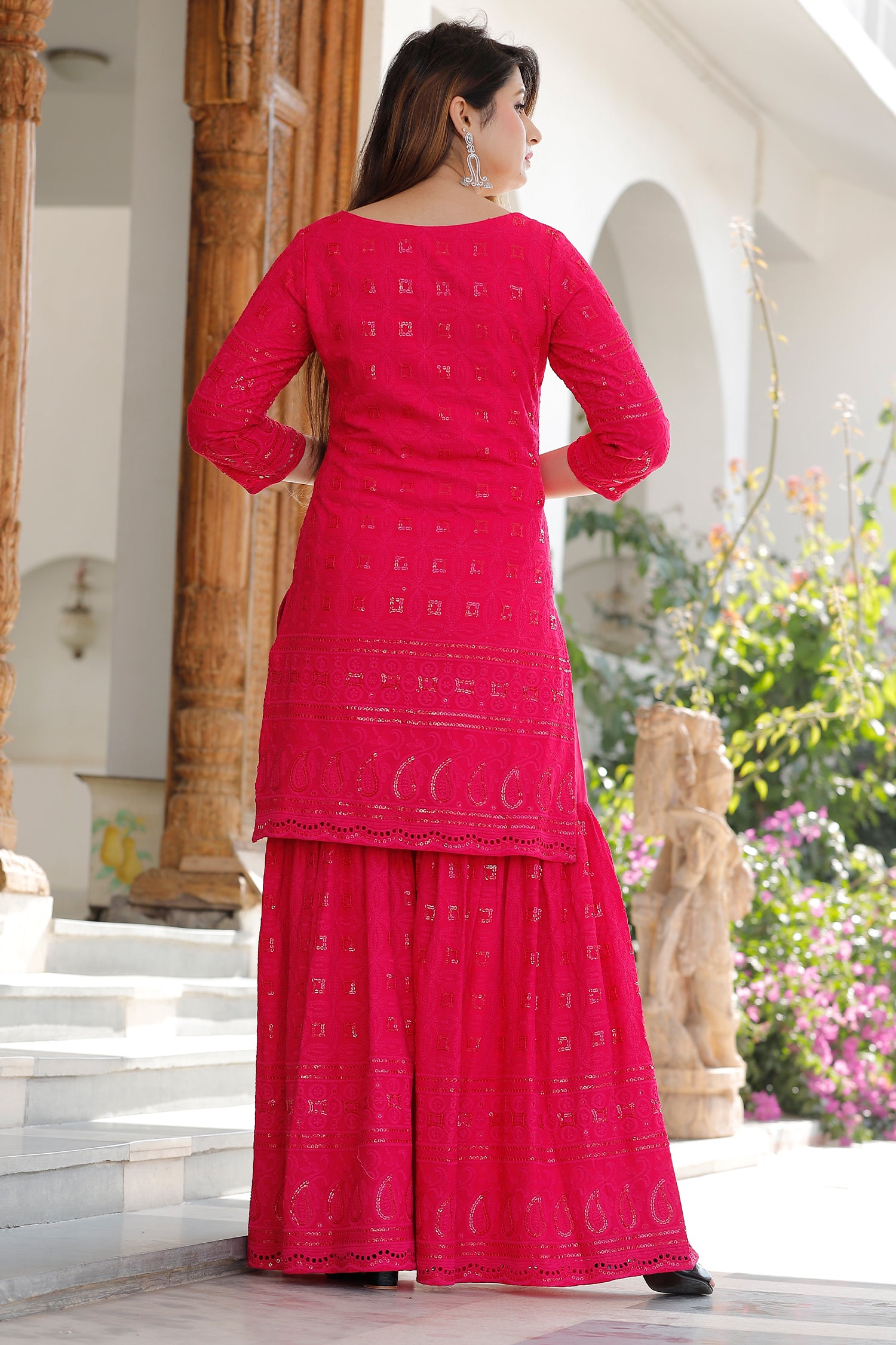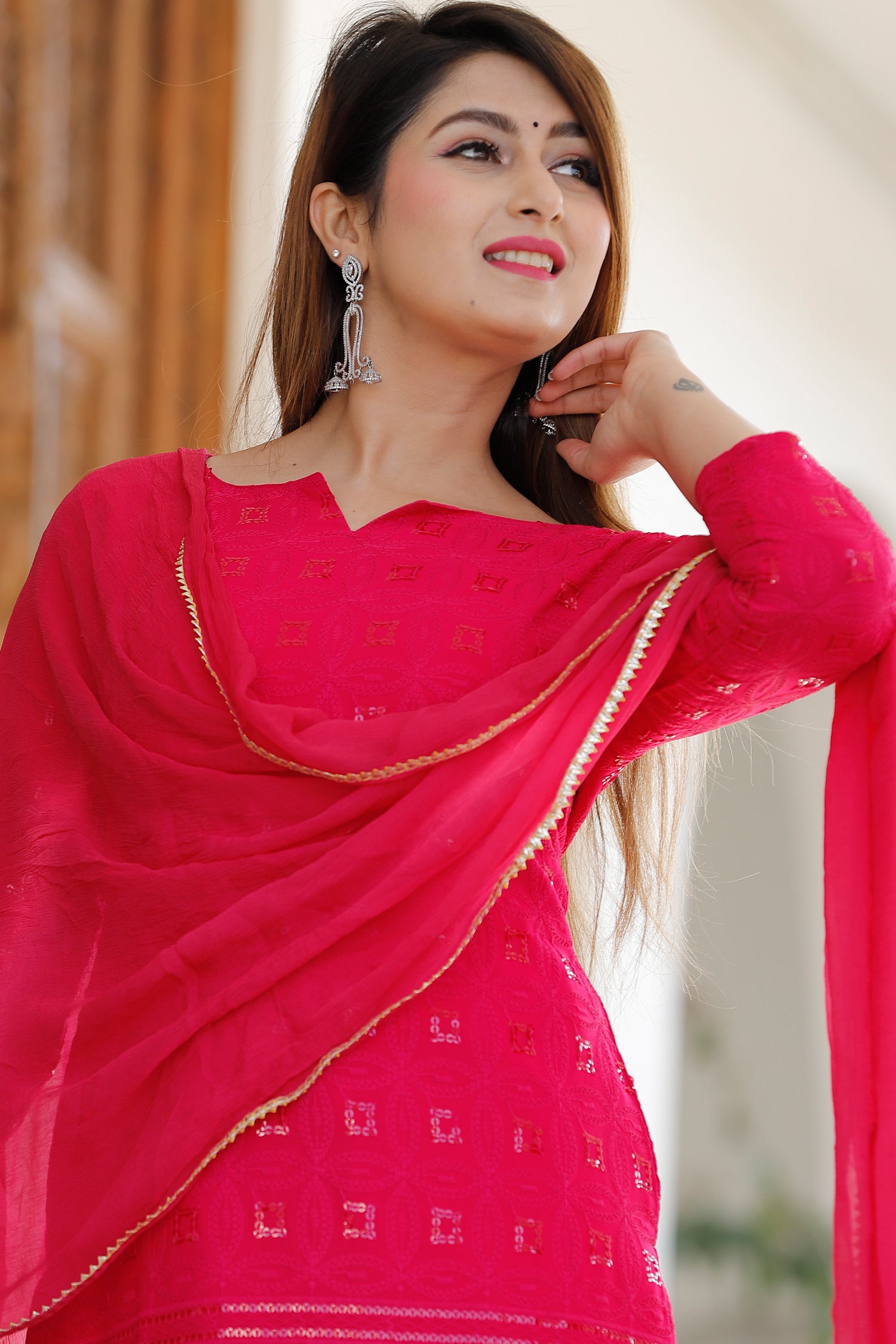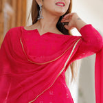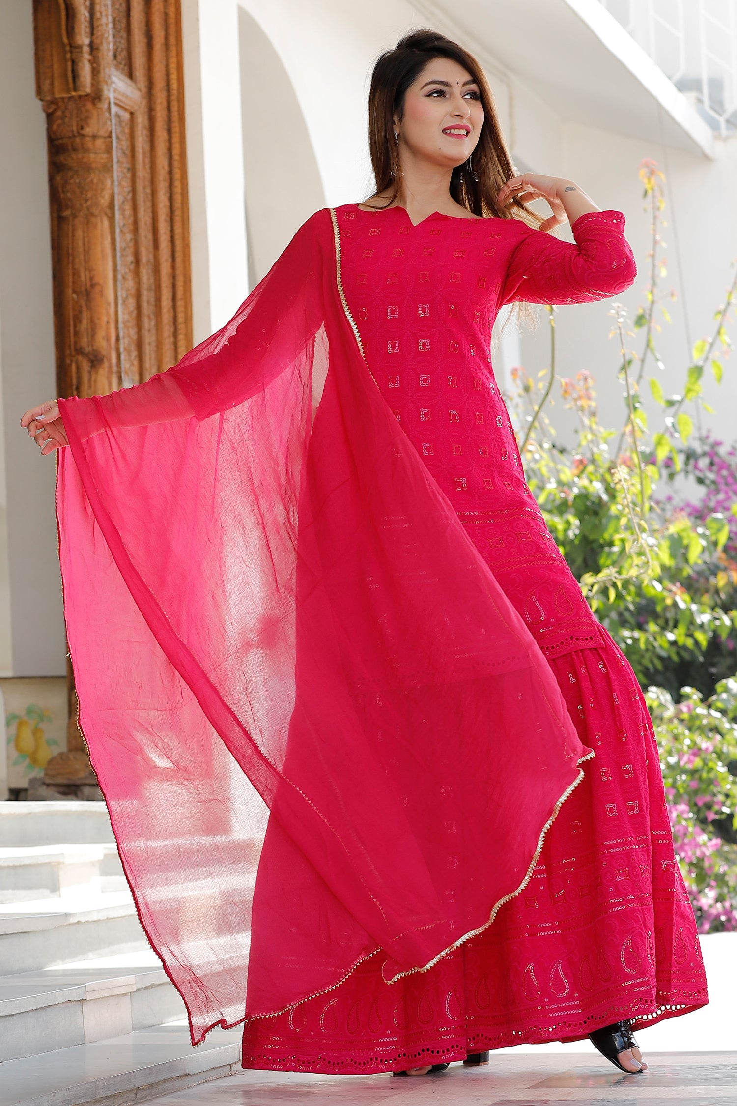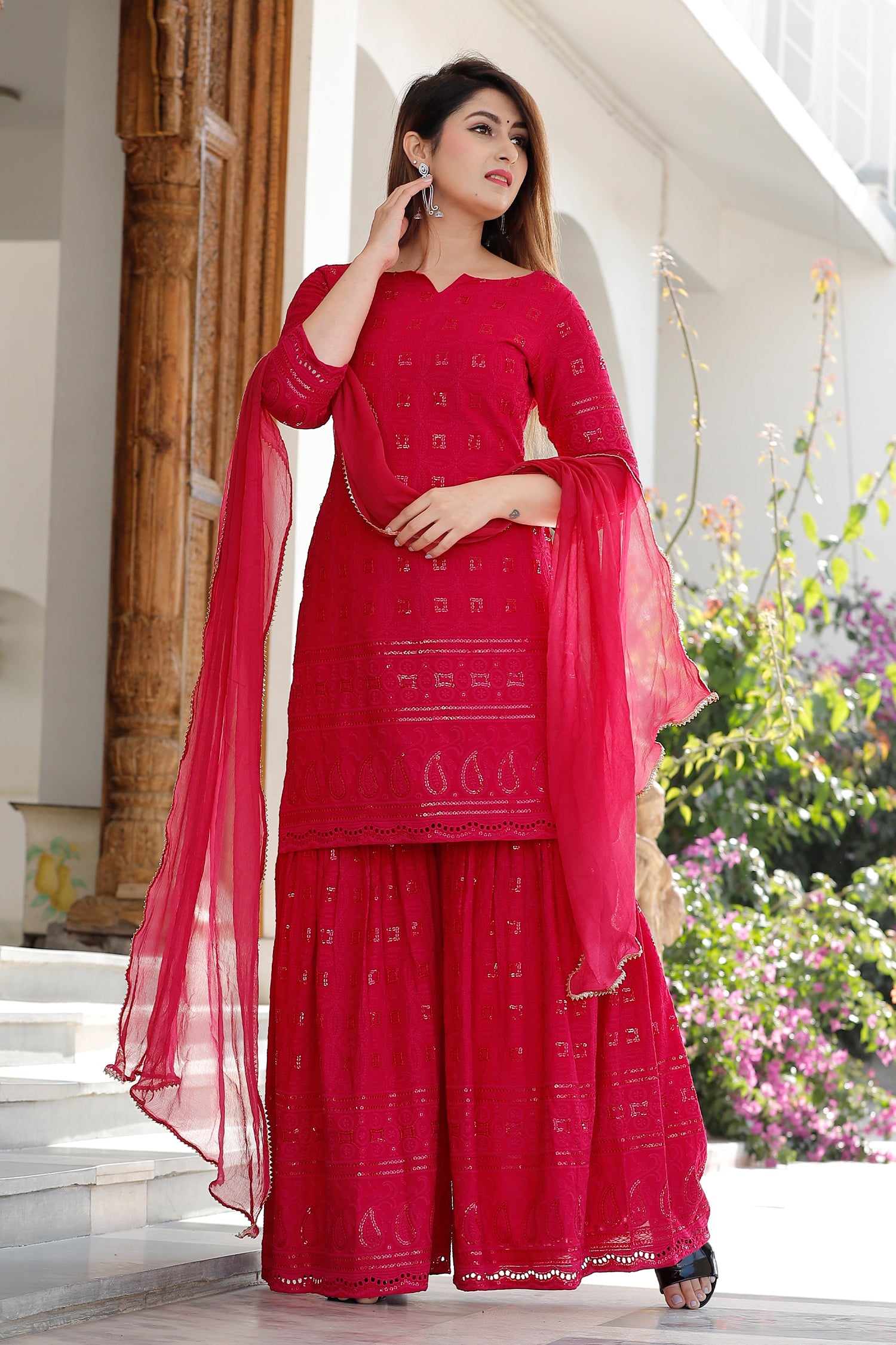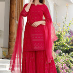 The red rayon traditional kurti set with chikankari work kurti and a matching palazzo with dupatta for a subtle charm and neat finish which combines tradition and comfort.