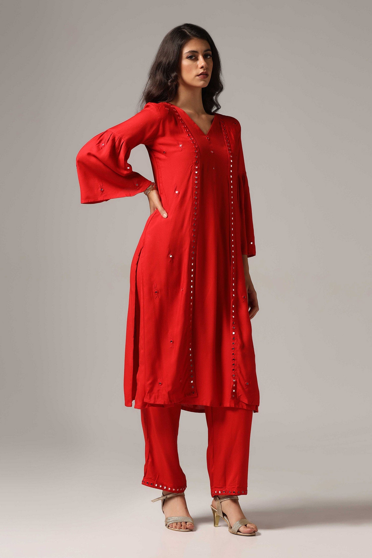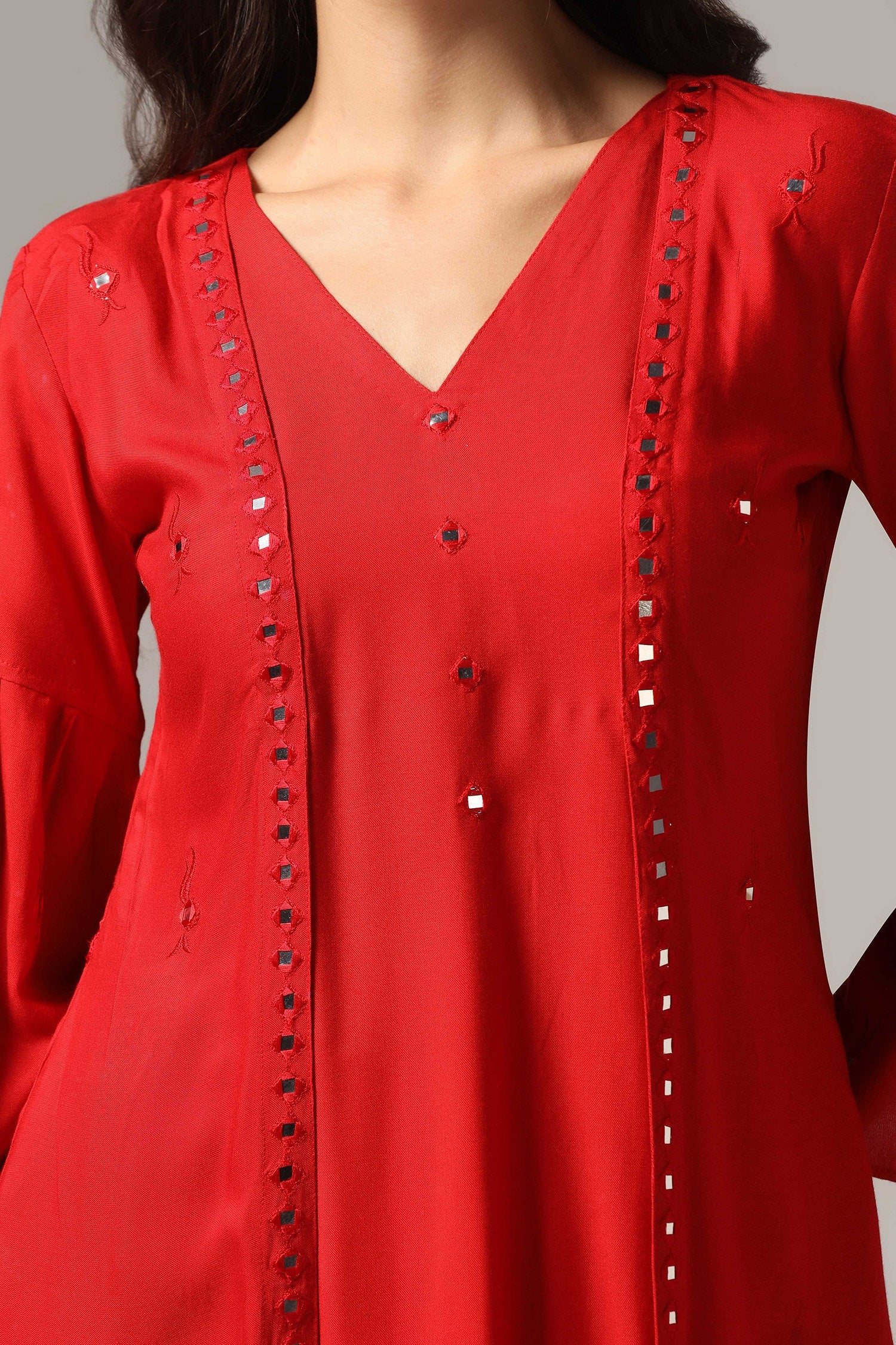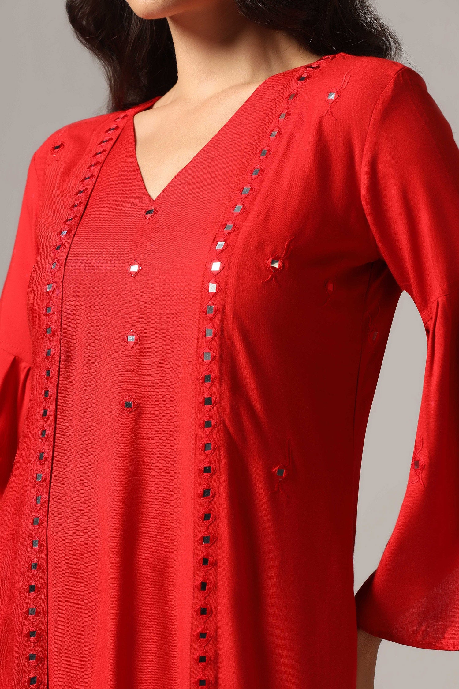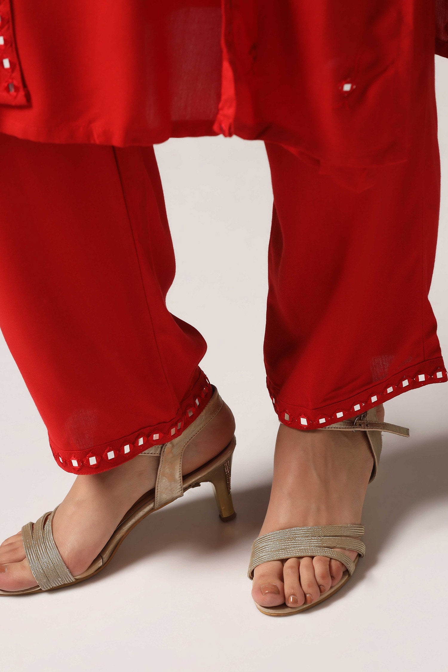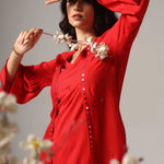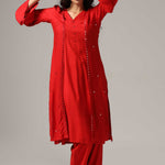 The red rayon resham embroidered mirror work kurti with pants for a beautiful and charming look.