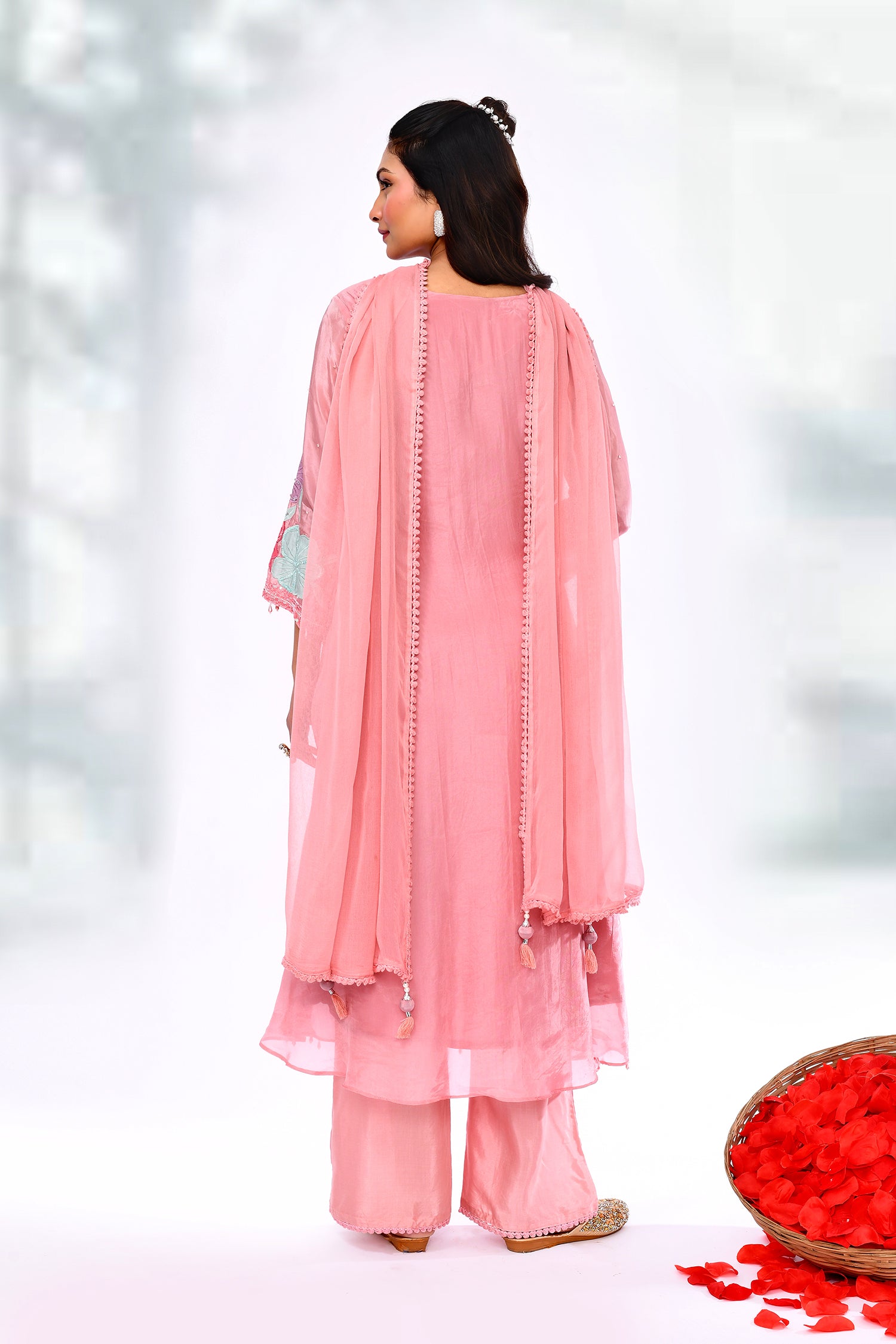 Soft Pink Organza Tissue Floral Printed Kurta Set