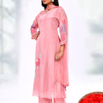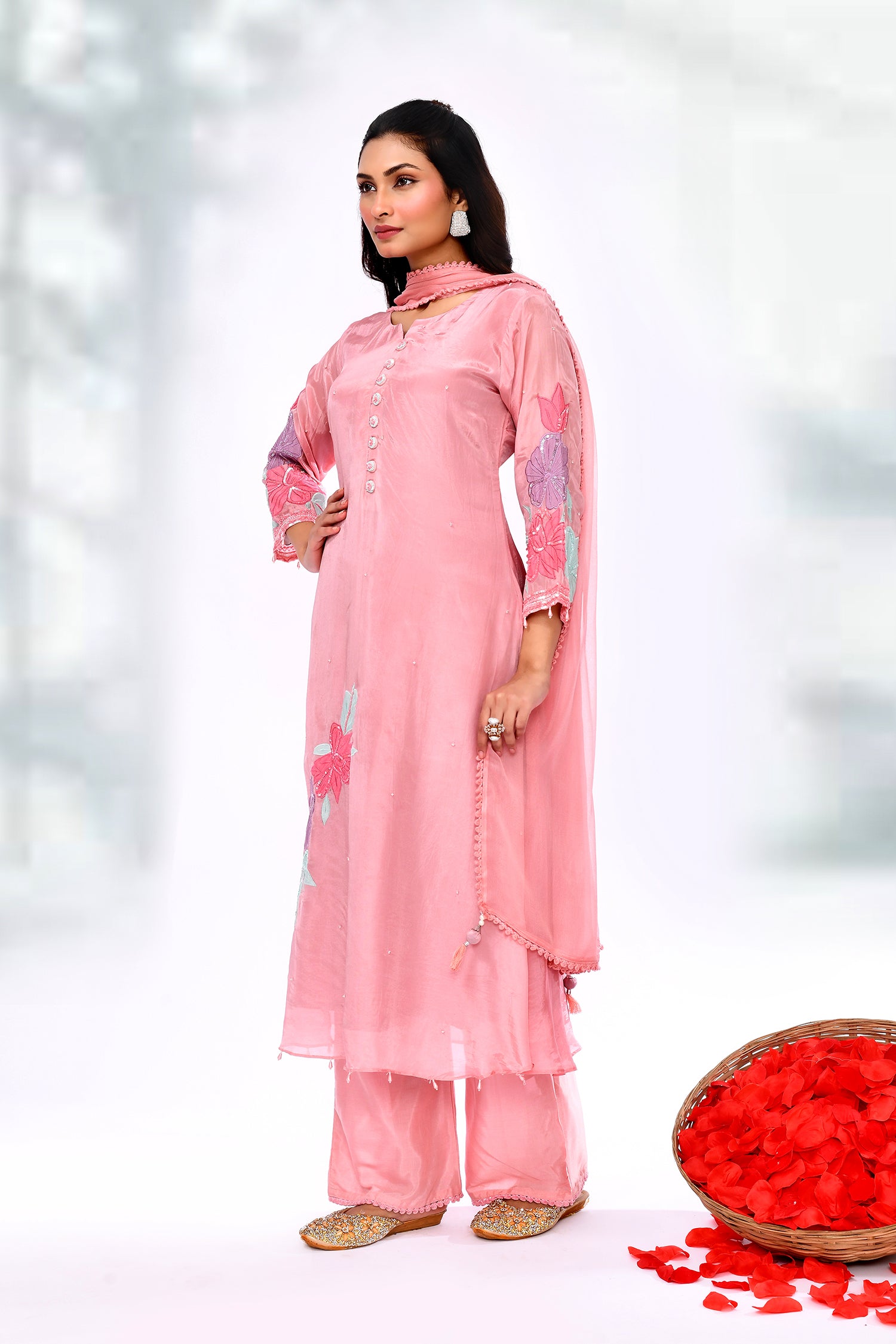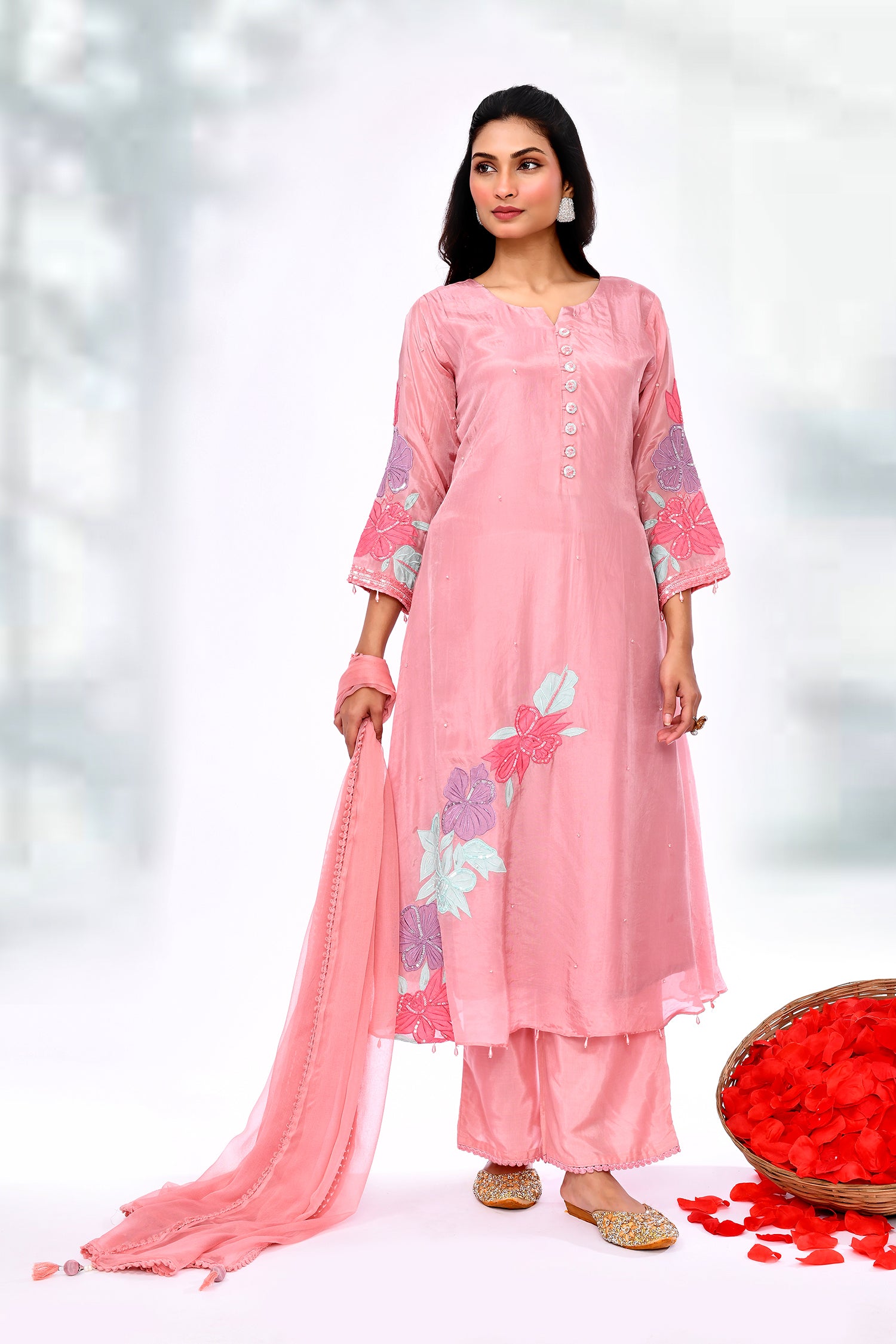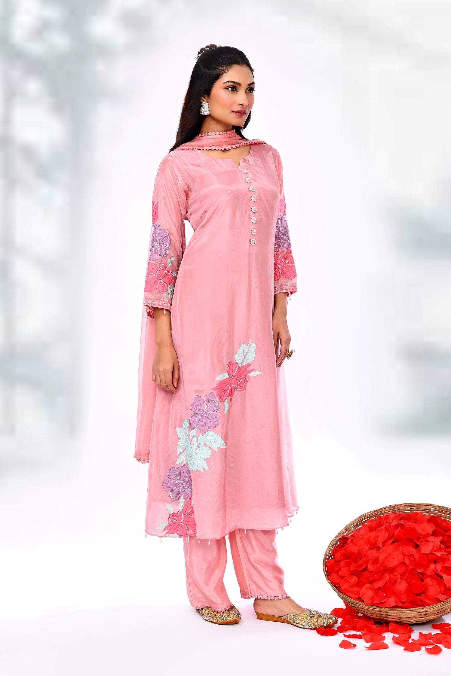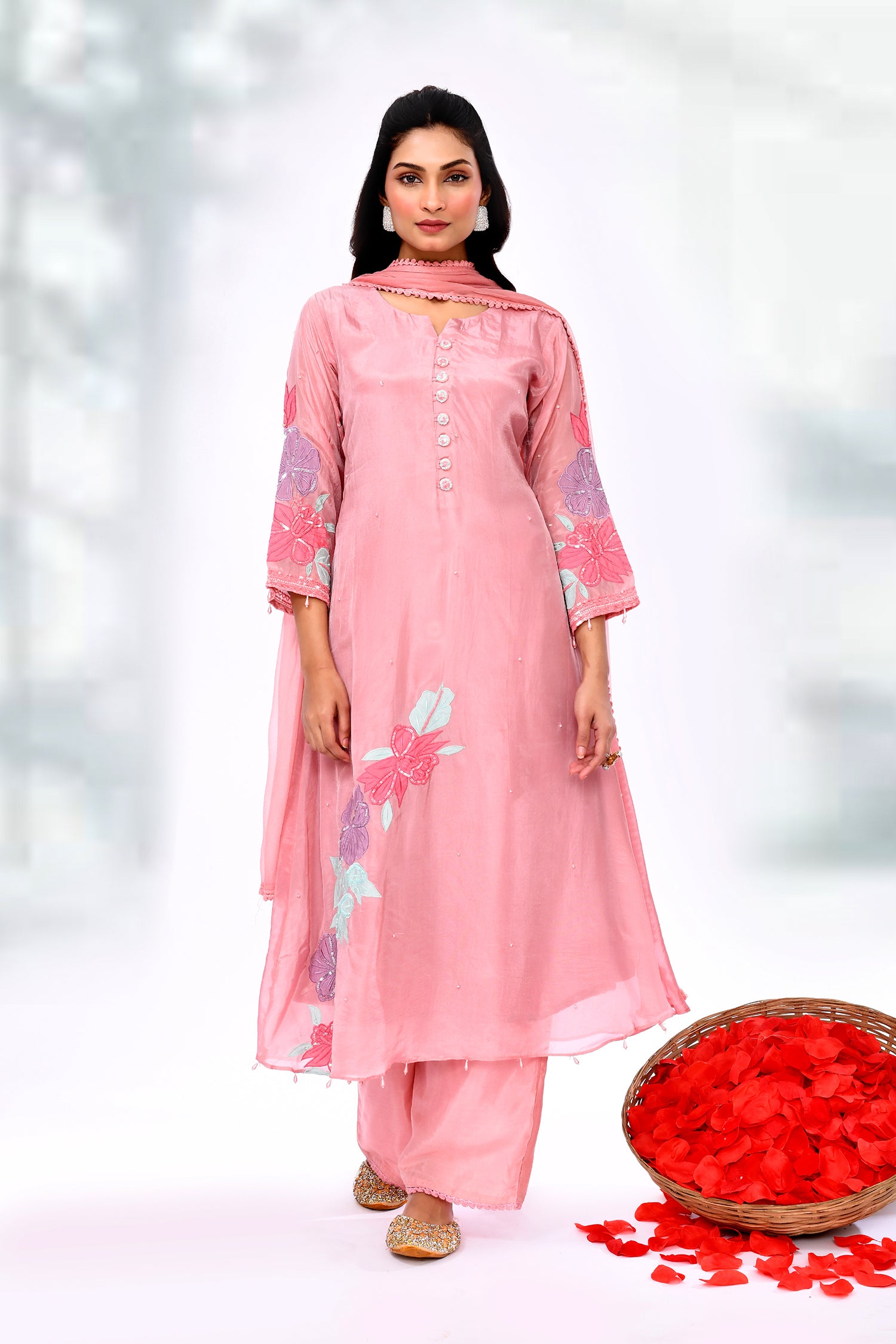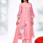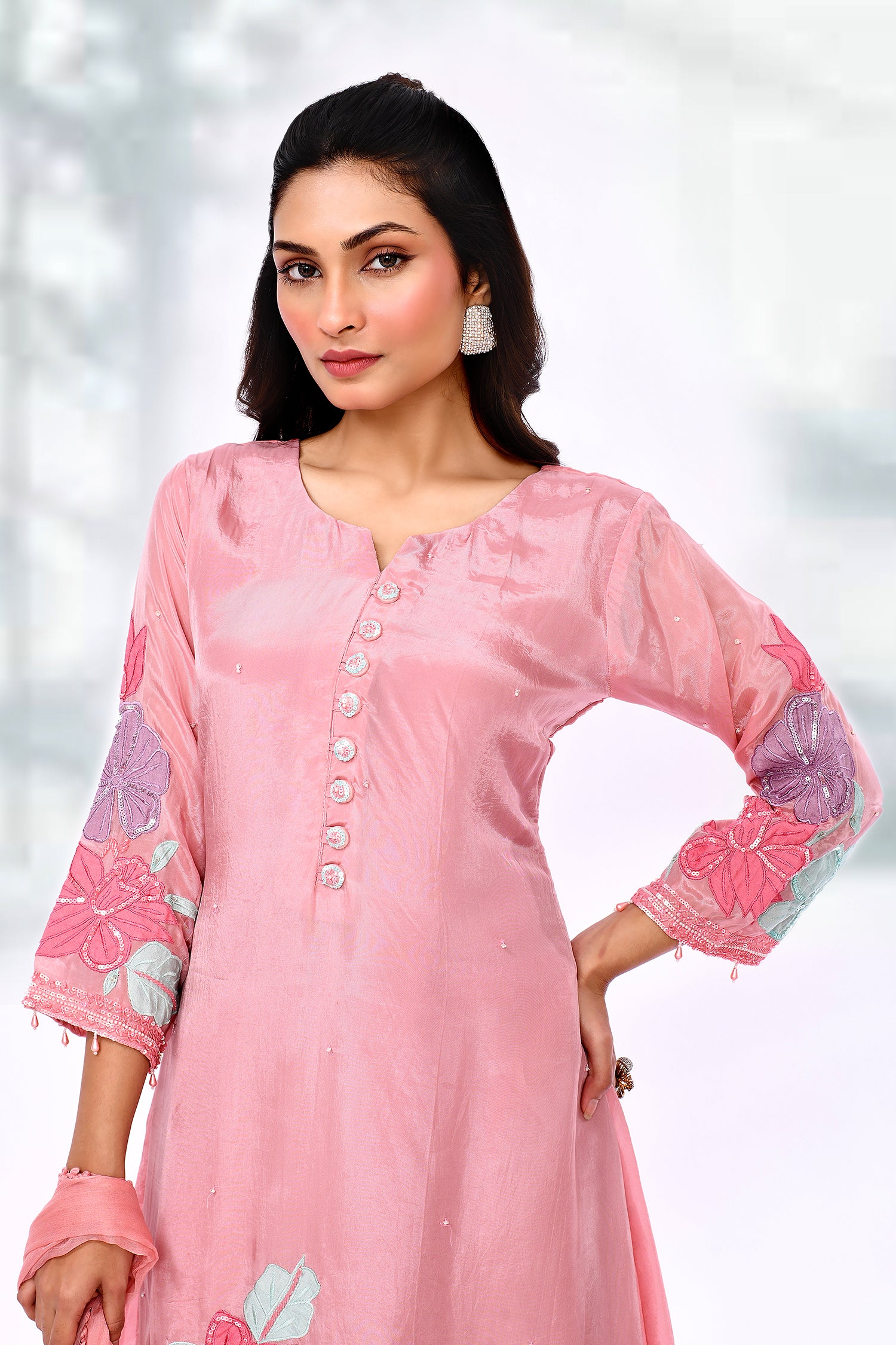 The soft pink organza tissue floral printed kurta set with sequin work and matching pant and dupatta for a neat classy look.
