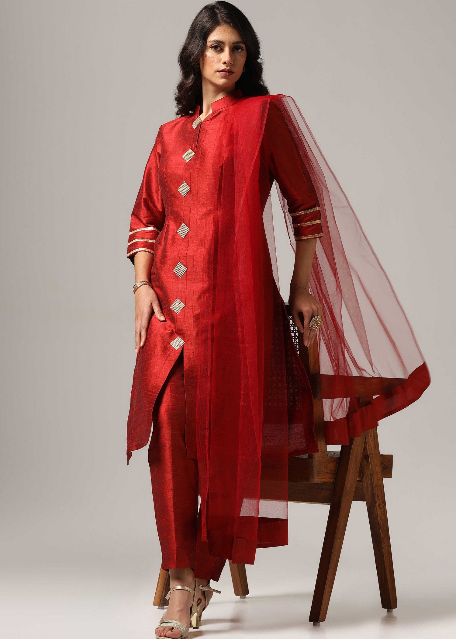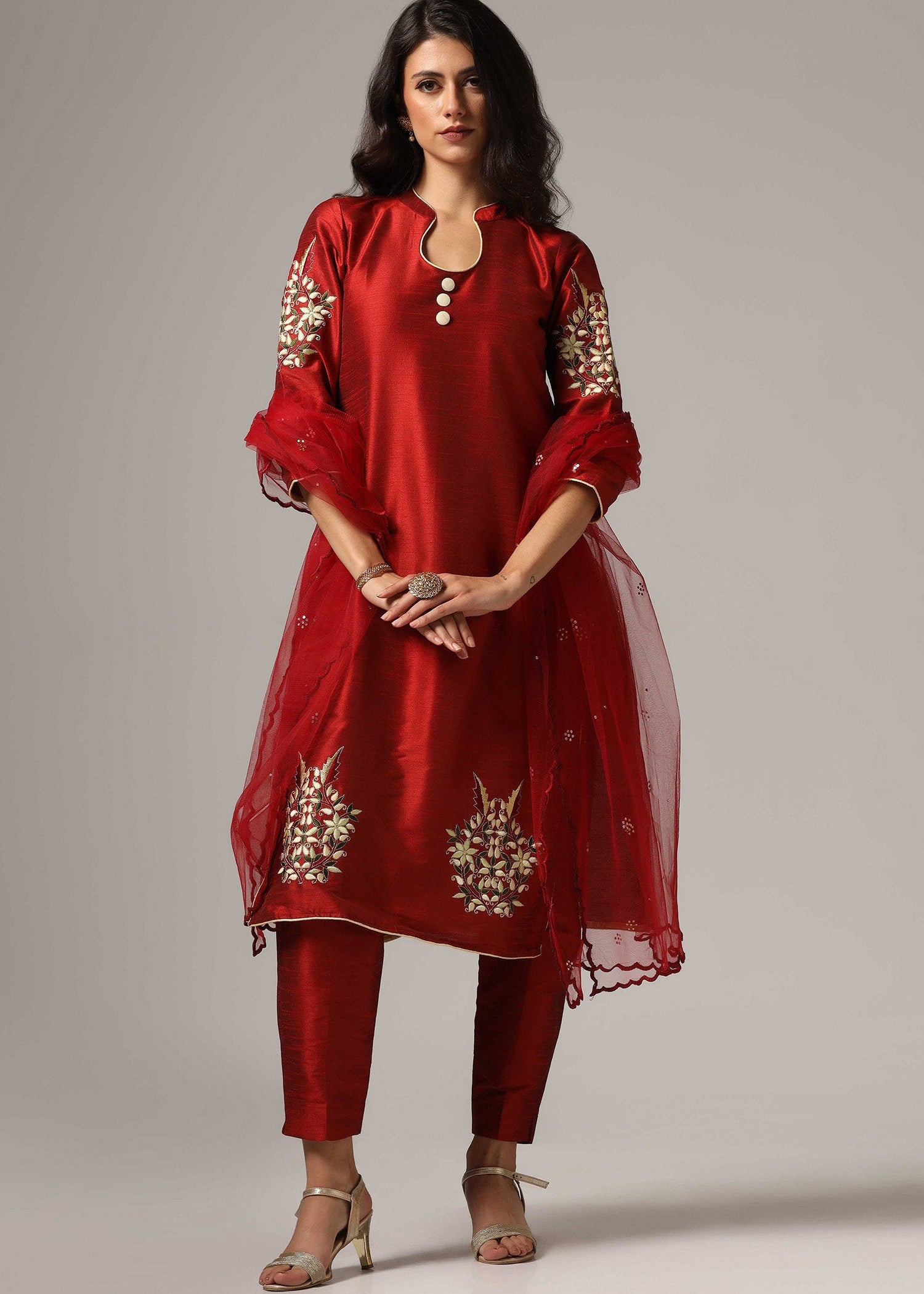 Maroon Raw Silk Kurti With Pants And Dupatta