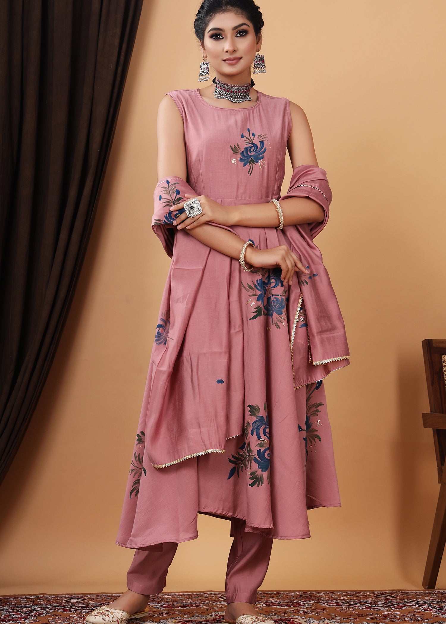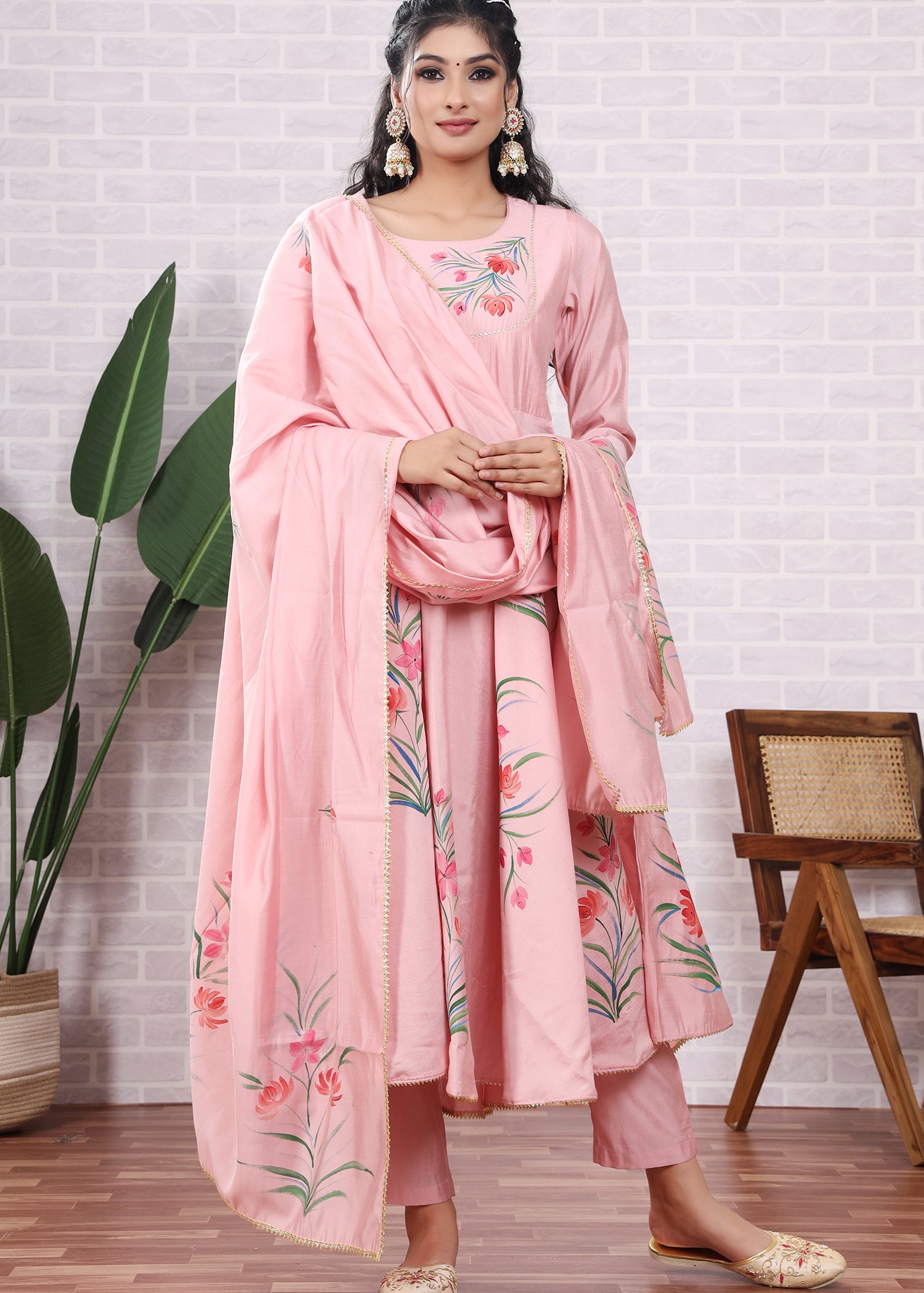 Pink Floral Hand Block Printed Cotton Kurta Set With Dupatta