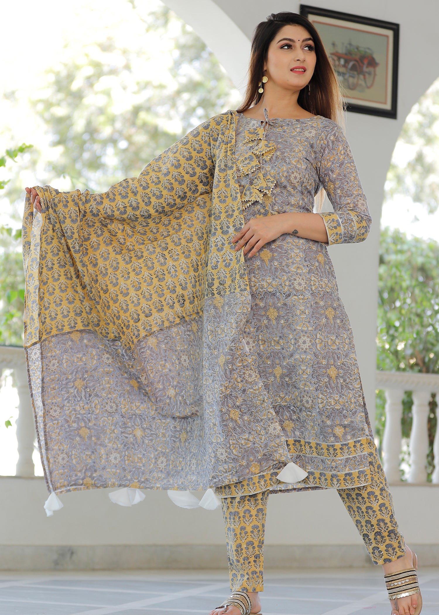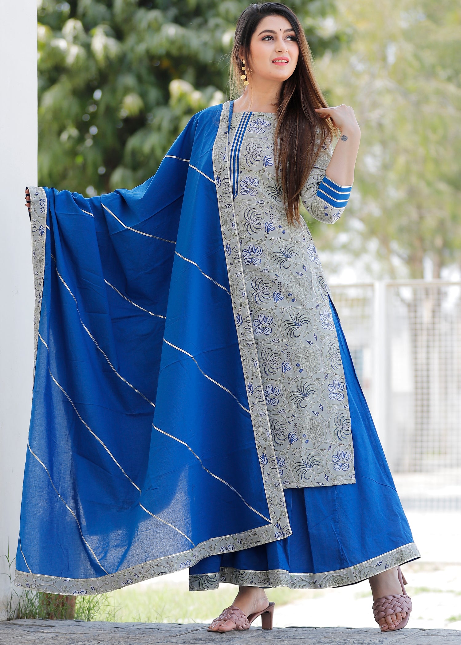 Grey And Blue Floral Printed Cotton Palazzo And Kurta Set