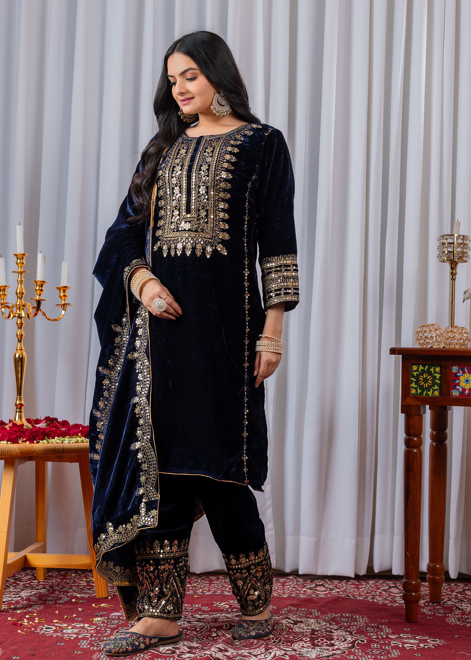 Chocolate Brown Russian Silk Embroidered Kurti Set