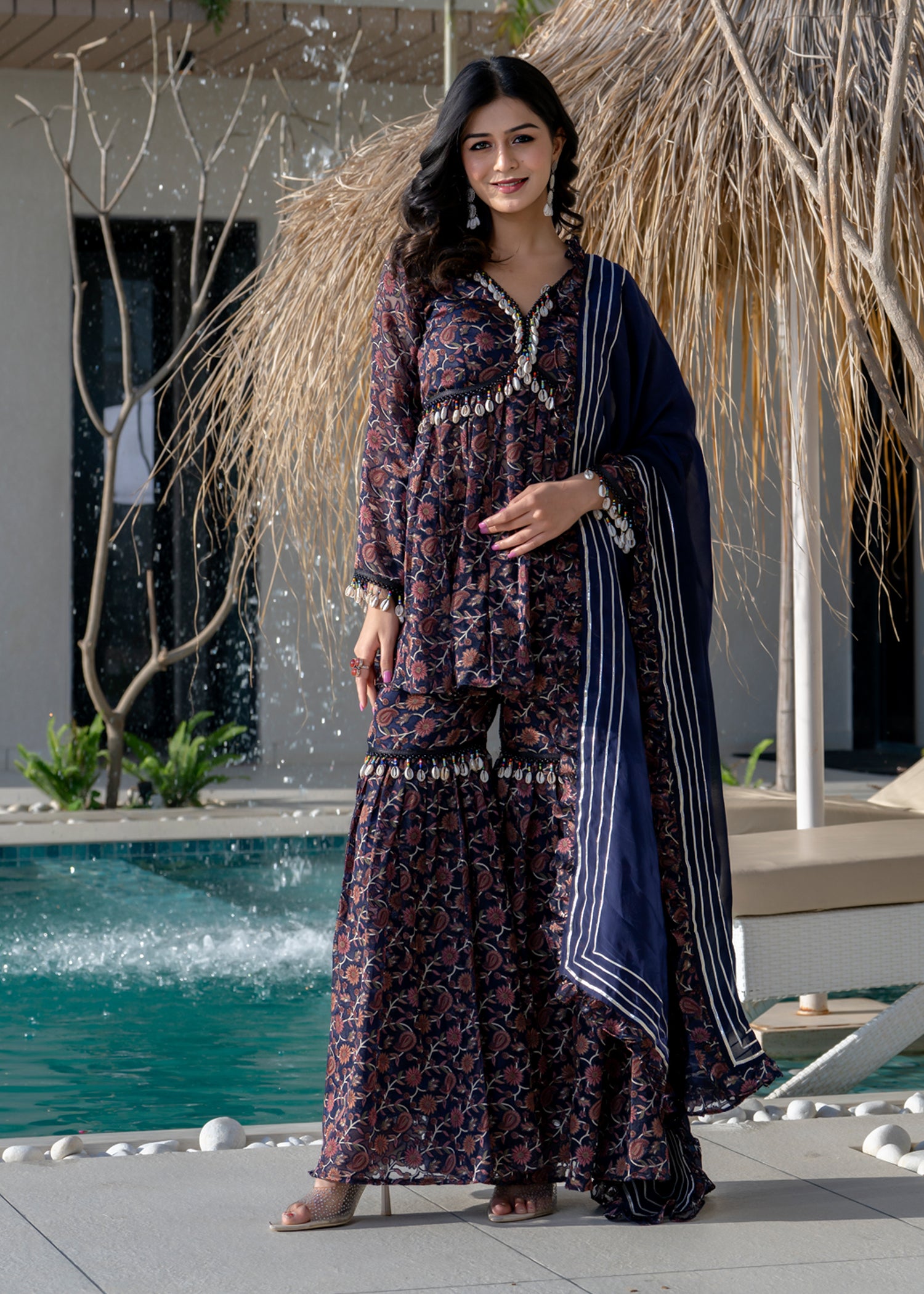 Navy Blue Georgette Floral Embroidered Kurti Set