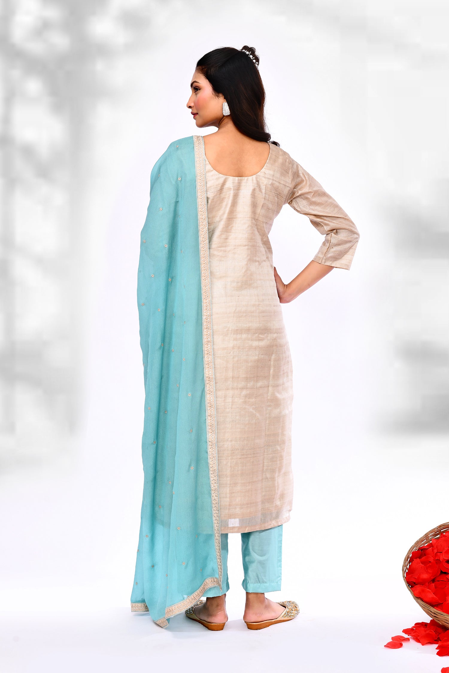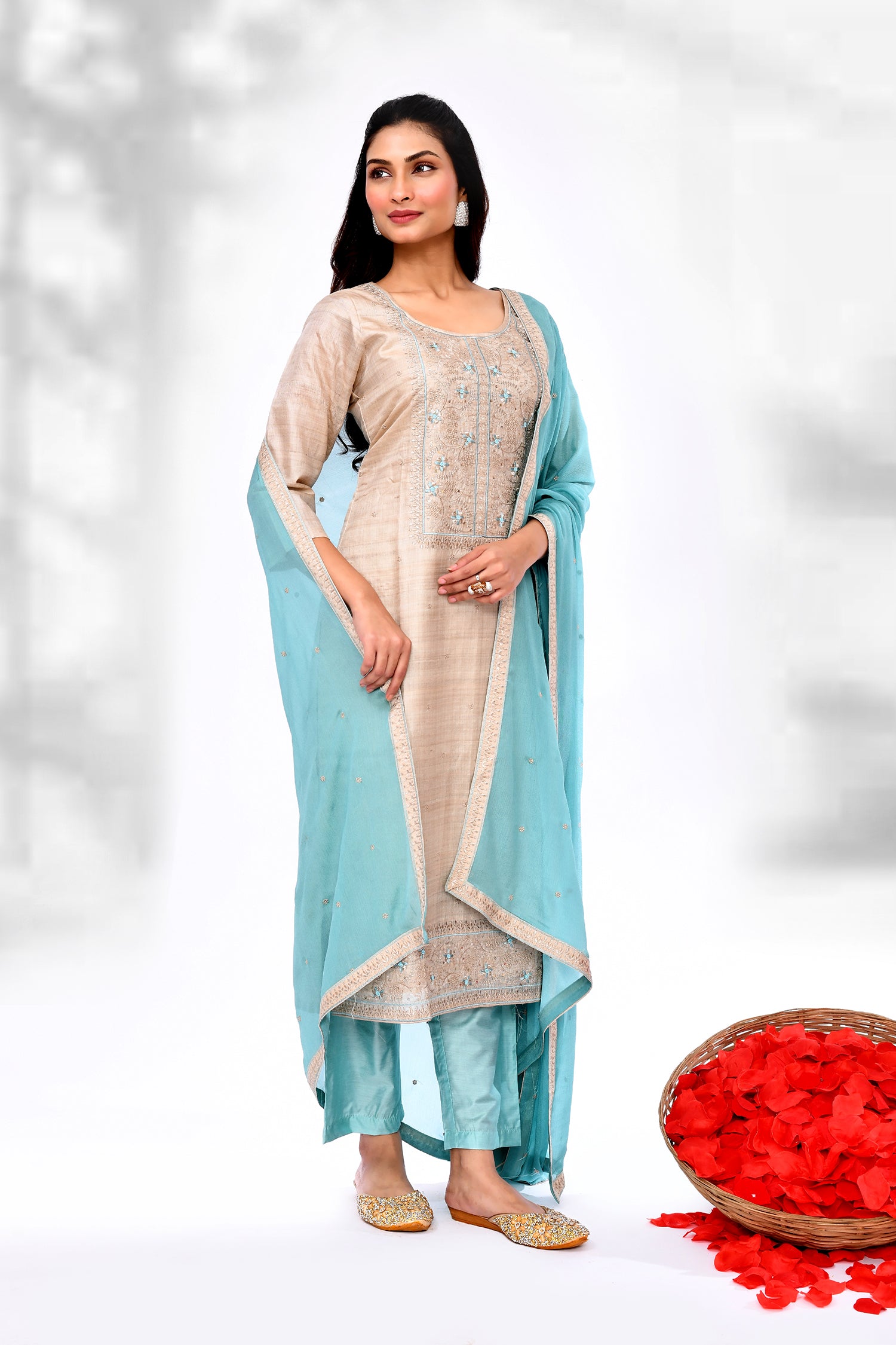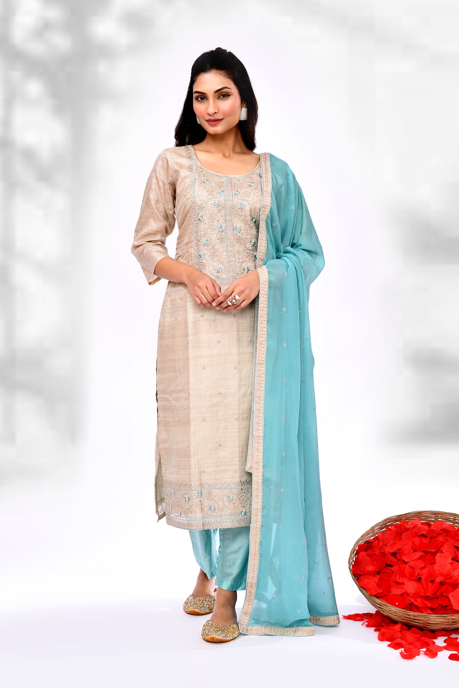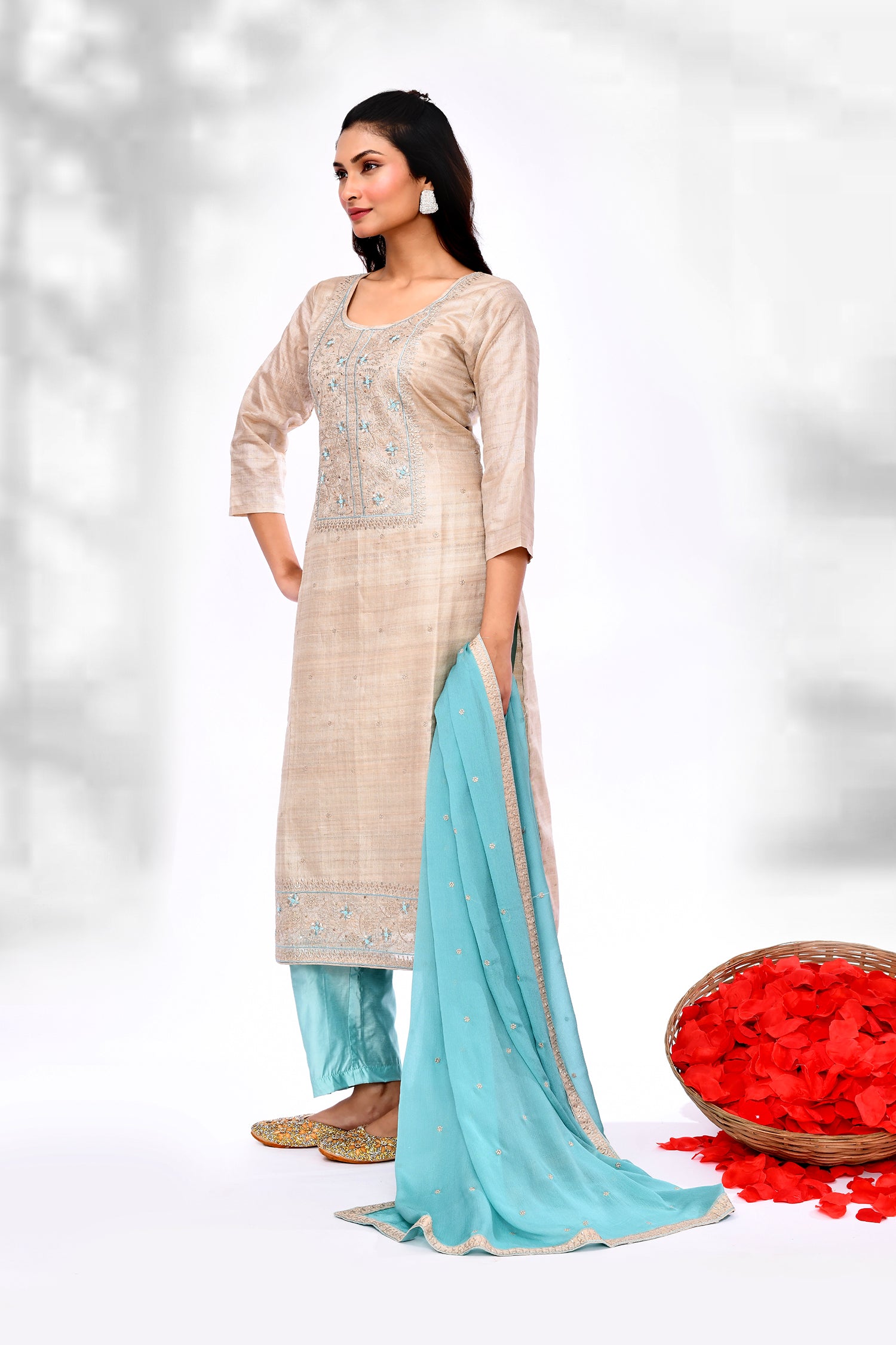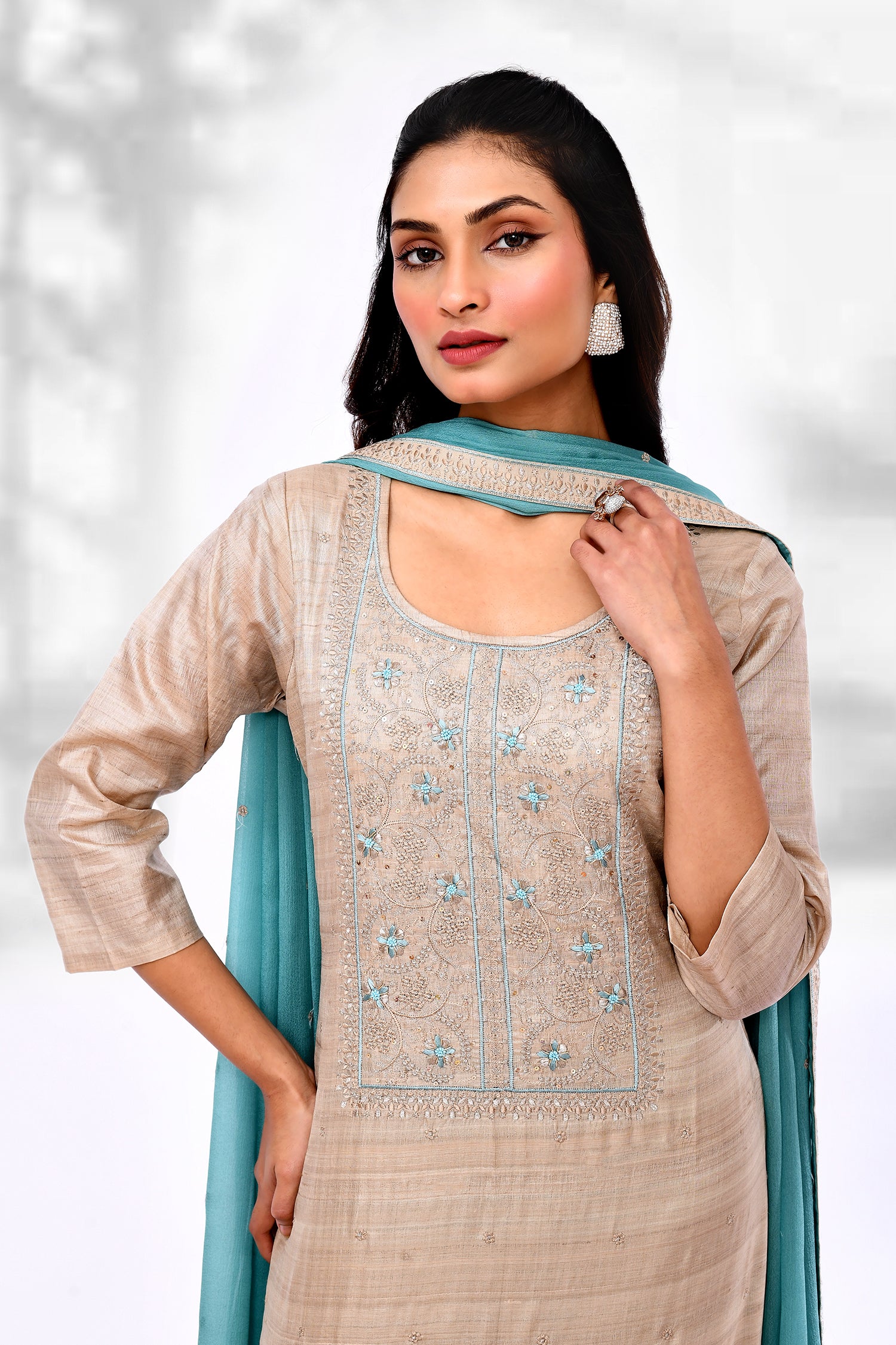 The soft cream linen floral thread work kurti set with round neck along with contrast blue dupatta and pant for a stylish ethnic look.