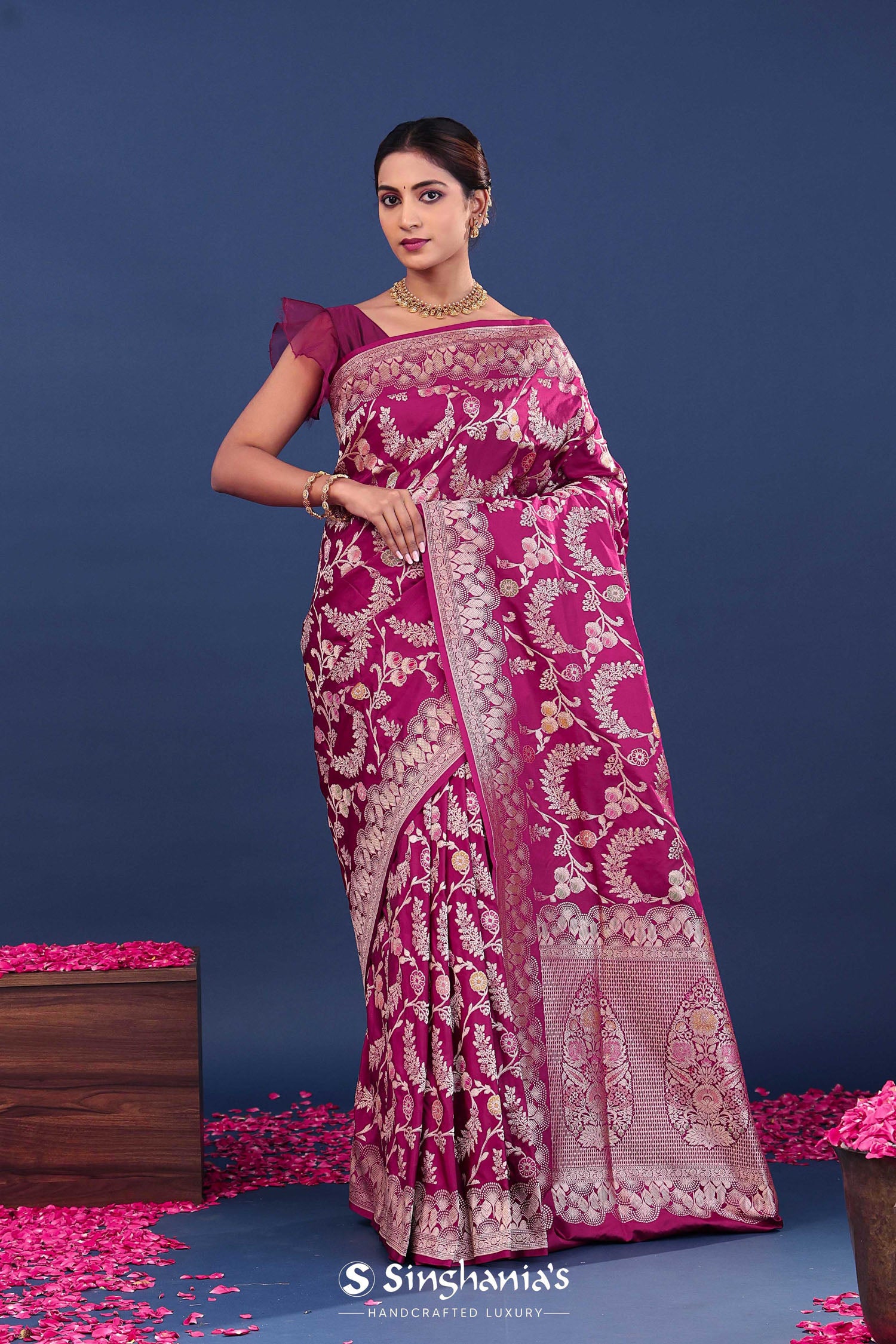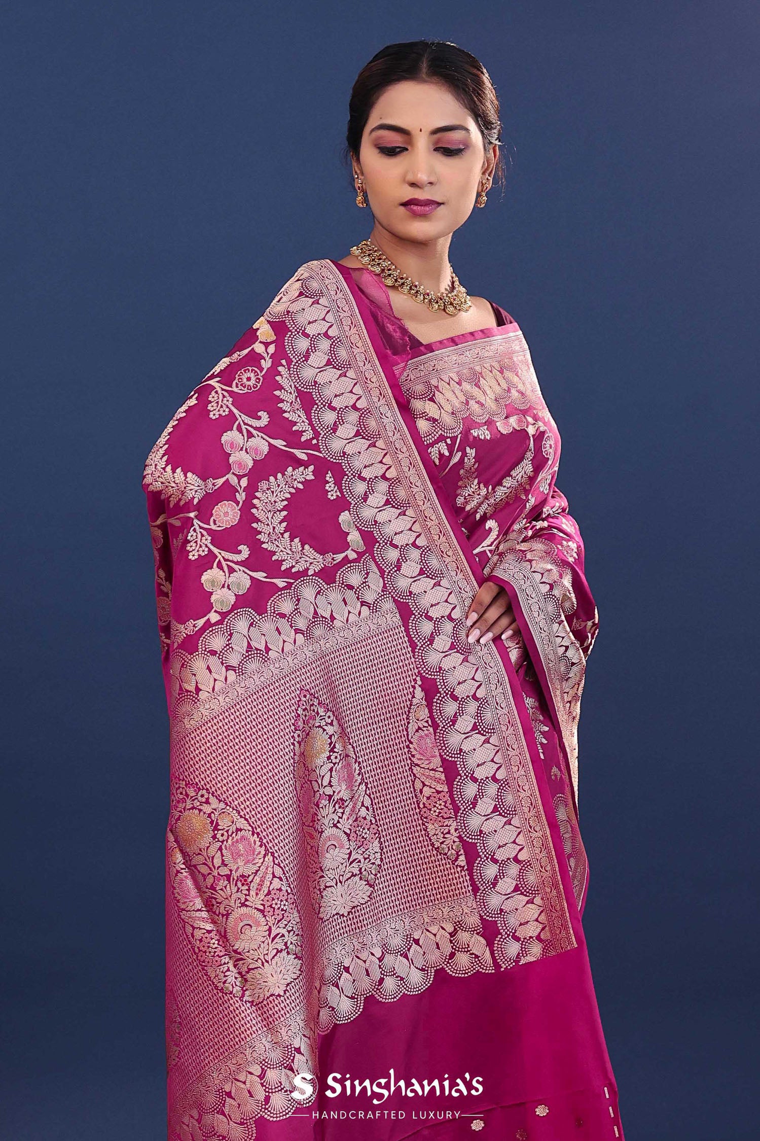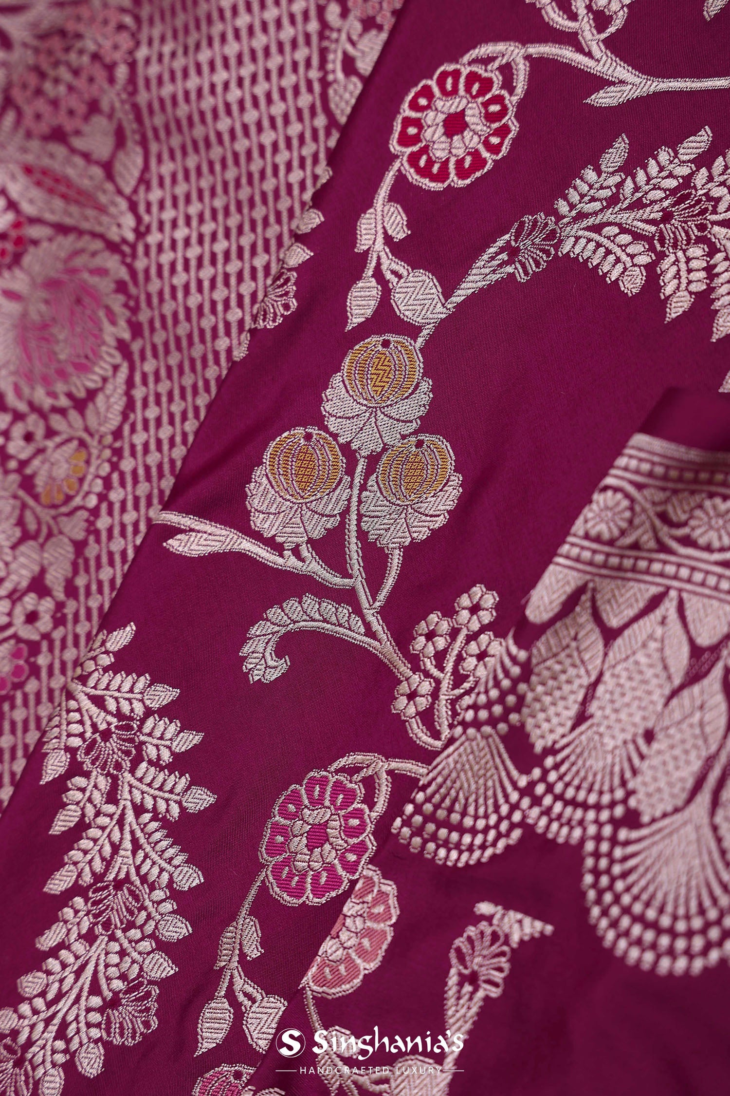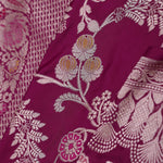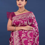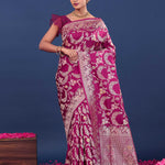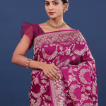 The scallop woven design spread across the Dark fuchsia banarasi saree along with meenakari floral design. The designer border which is woven with gold zari emits classy and contemporary style