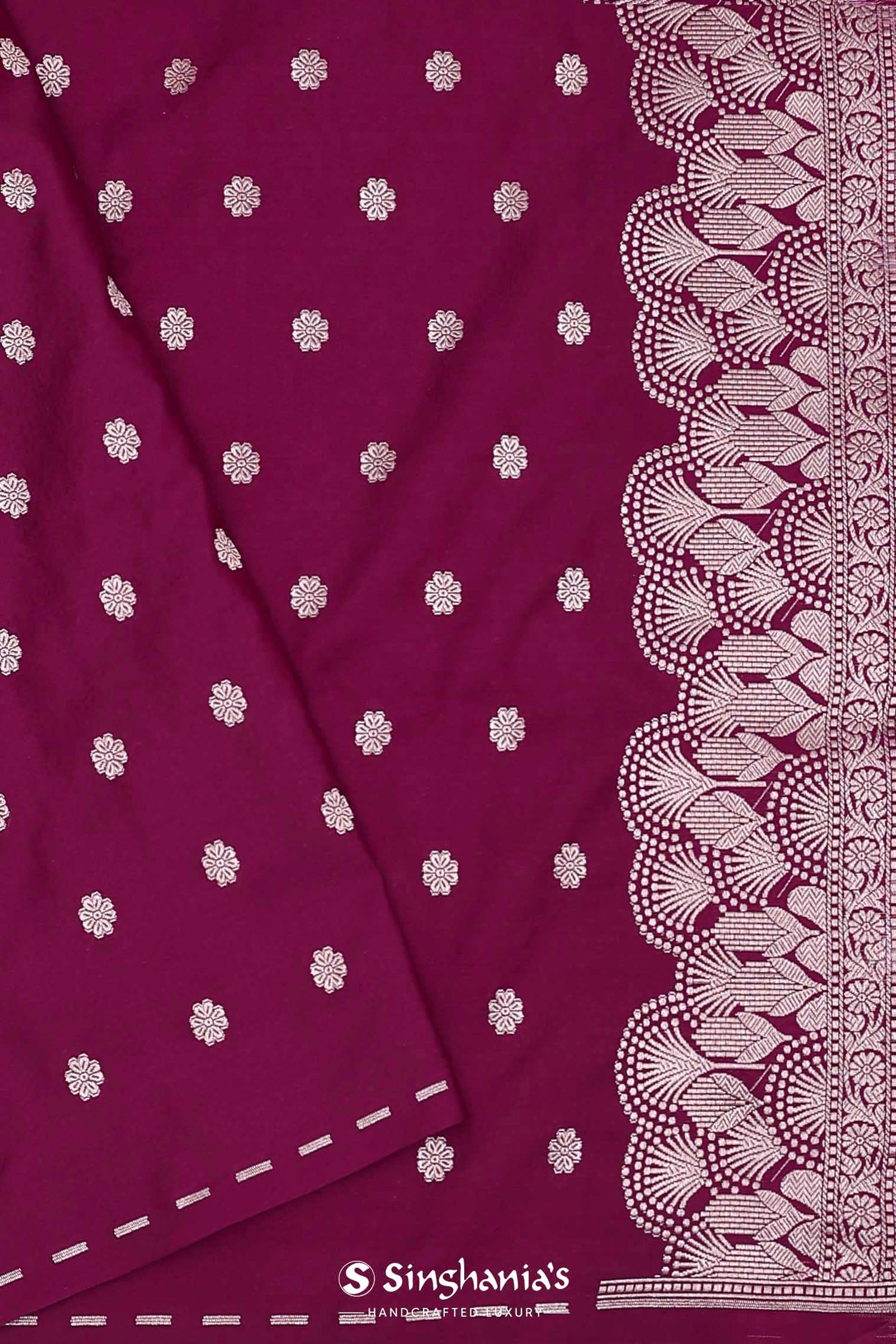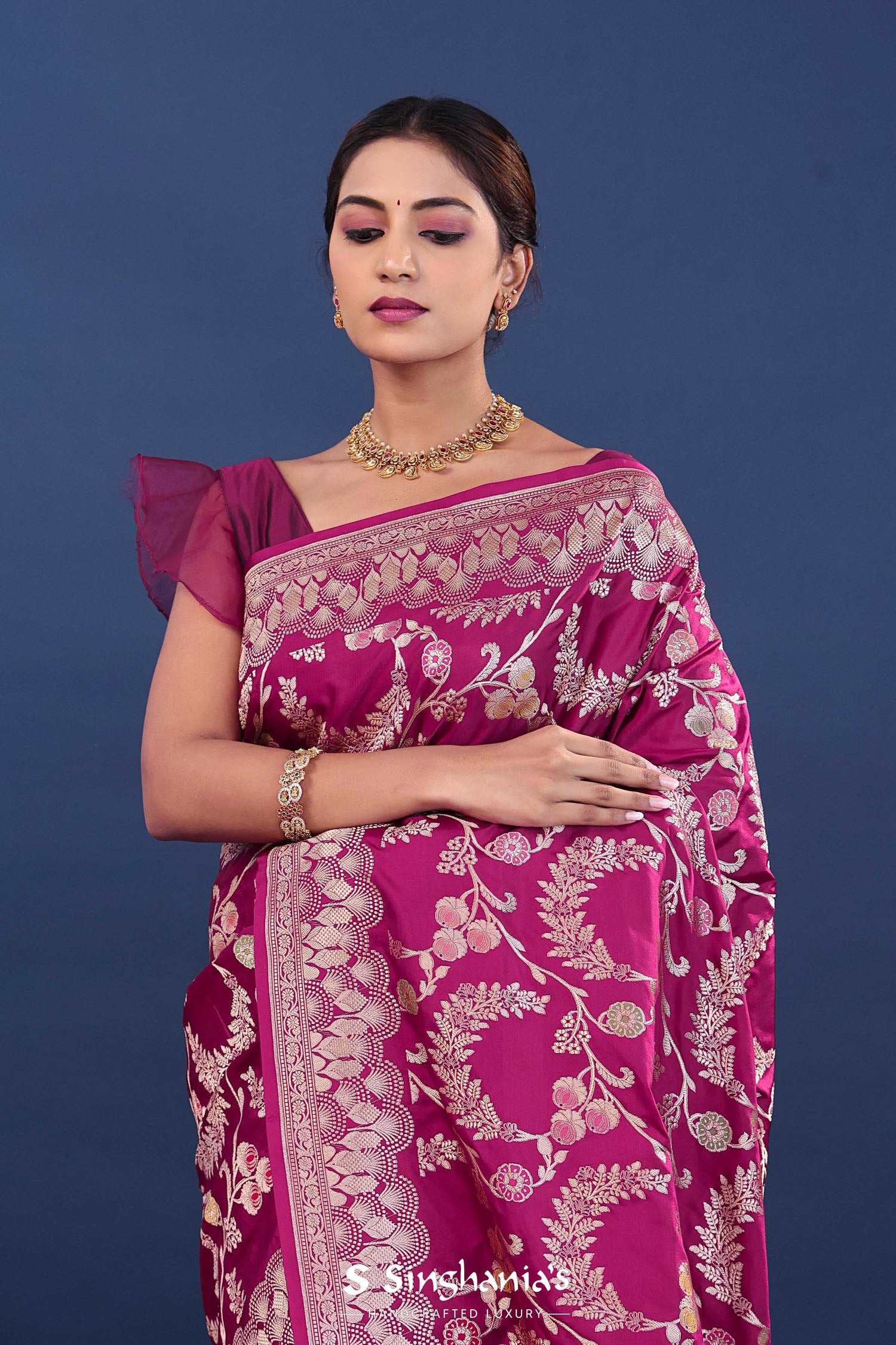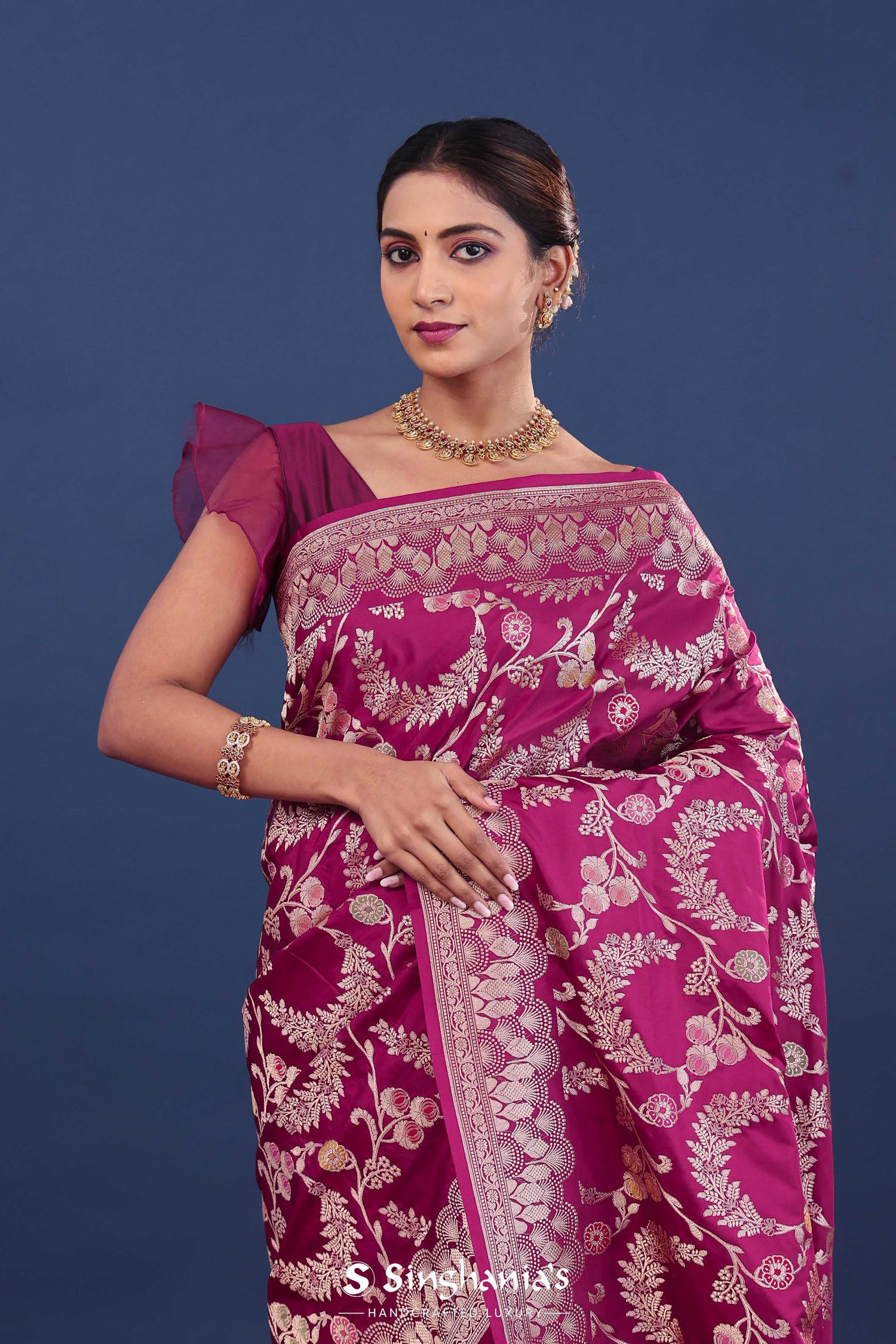 The scallop woven design spread across the Dark fuchsia banarasi saree along with meenakari floral design. The designer border which is woven with gold zari emits classy and contemporary style