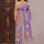 The authentic silk base of the Lilac purple khadi tussar saree featuring meenakari floral design woven and scattered all over the saree in contrast colors along with contrast border making it every moment festive
