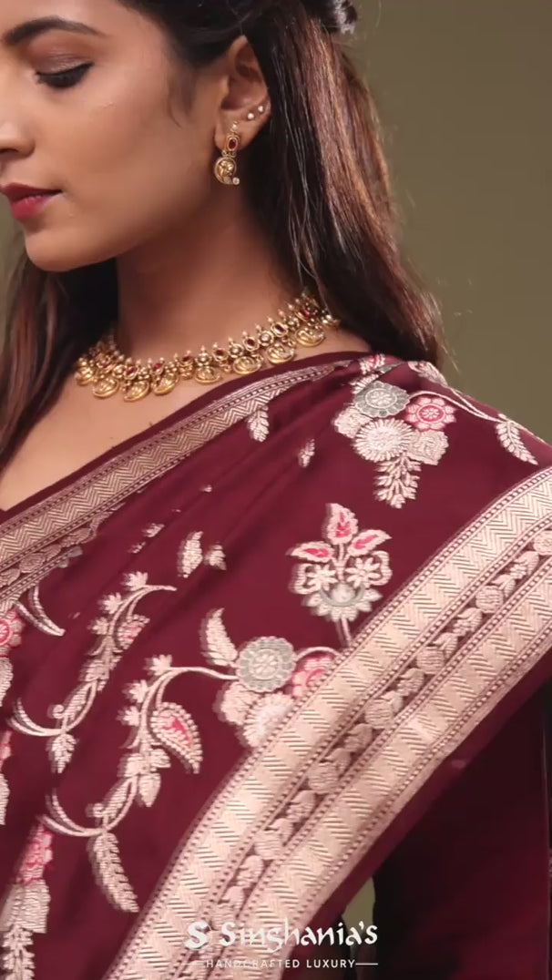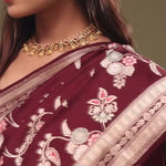 A lavish gold zari border and elaborate Meenakari patterns decorated this rich maroon Banarasi saree, which is ideal for making a royal impression.