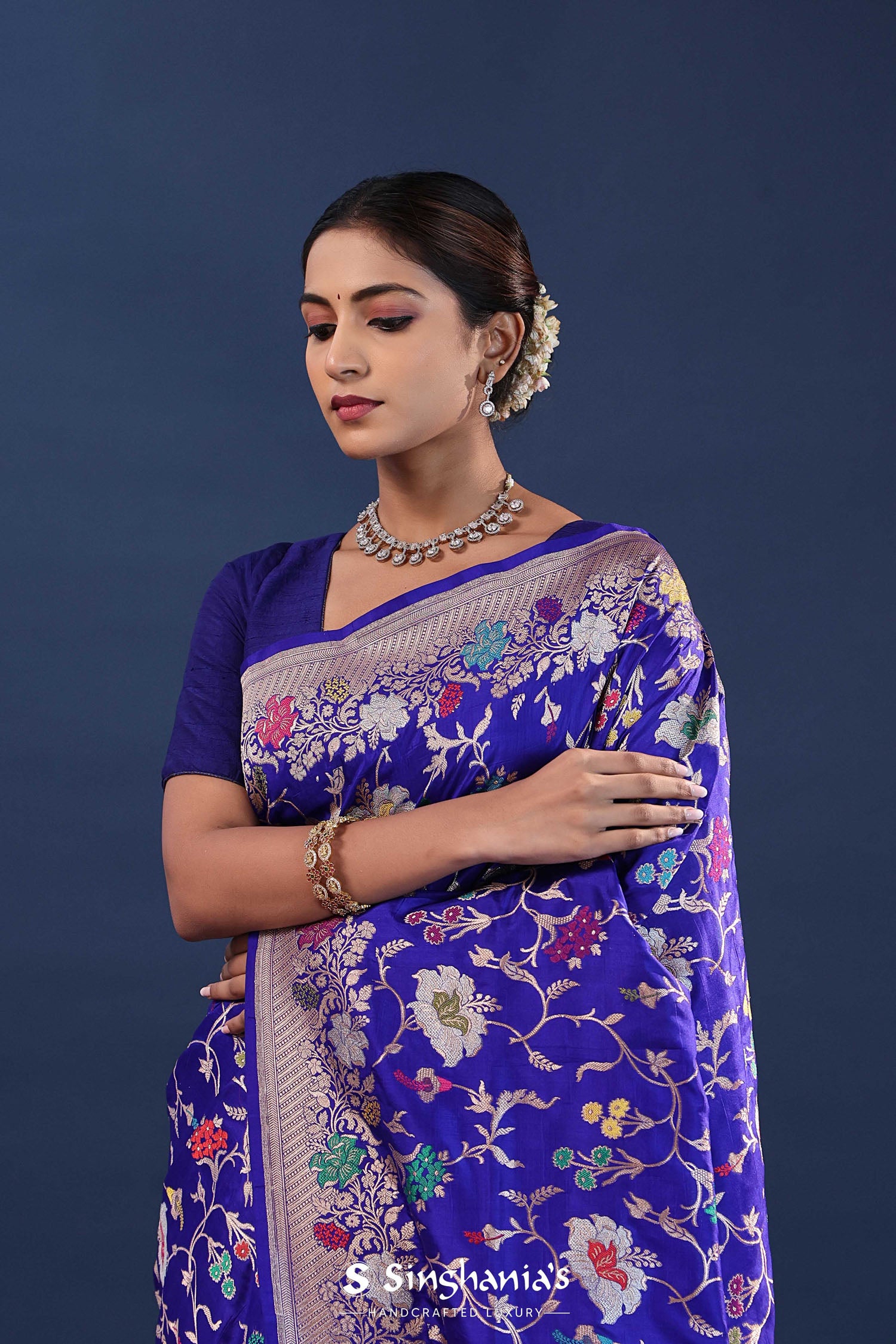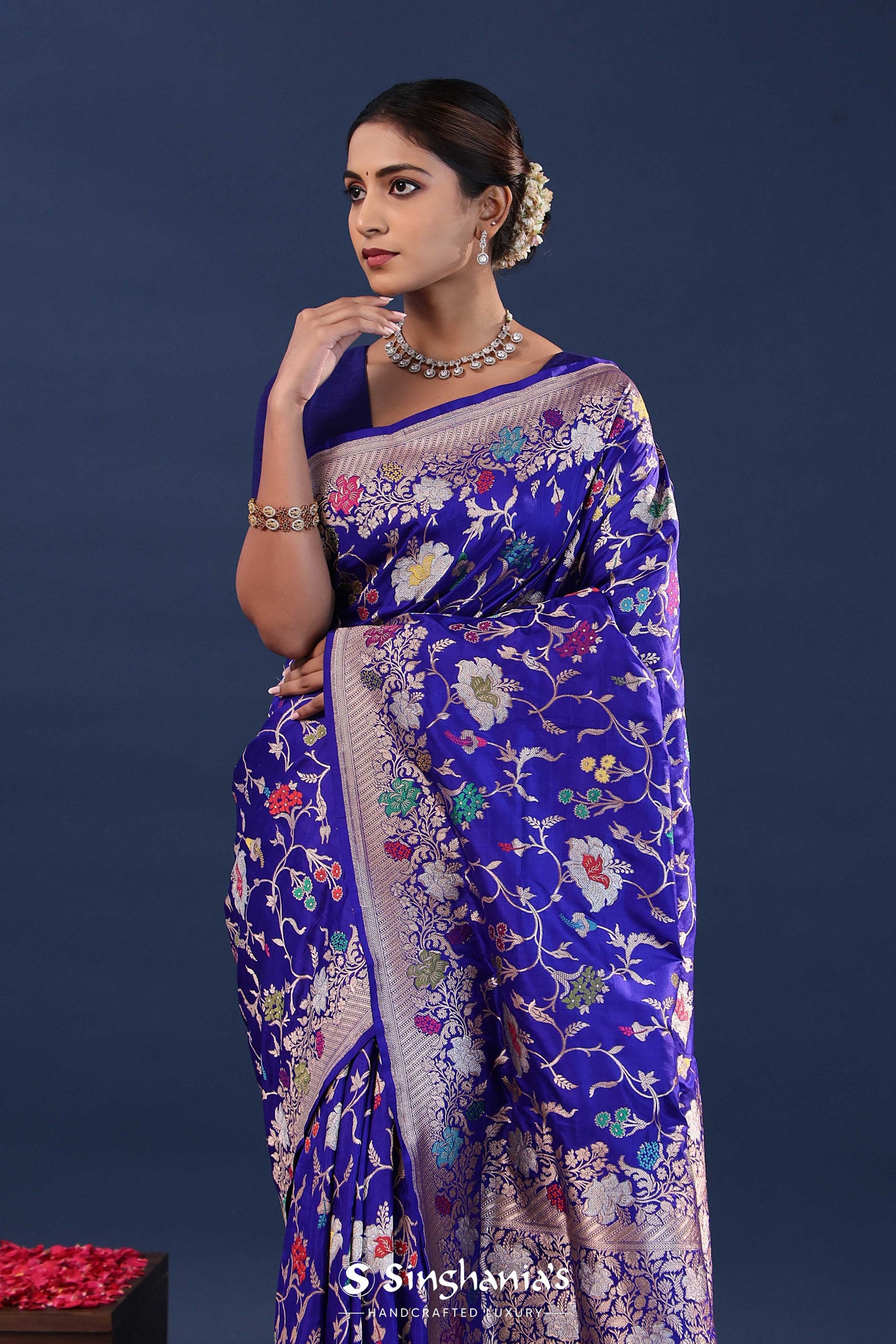 The designer floral border of Persian indigo banarasi saree features floral jaal with gold and silver zari adds extra charm to the overall look of the saree .Which is the perfect blend of traditional and contemporary style.