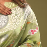 An abstract body design with multicolored flowers, trees, and paisleys furnished this pistachio green tussar Banarasi saree accompanied by silver embroidery border with delicate gray paisley motifs completes it in style.