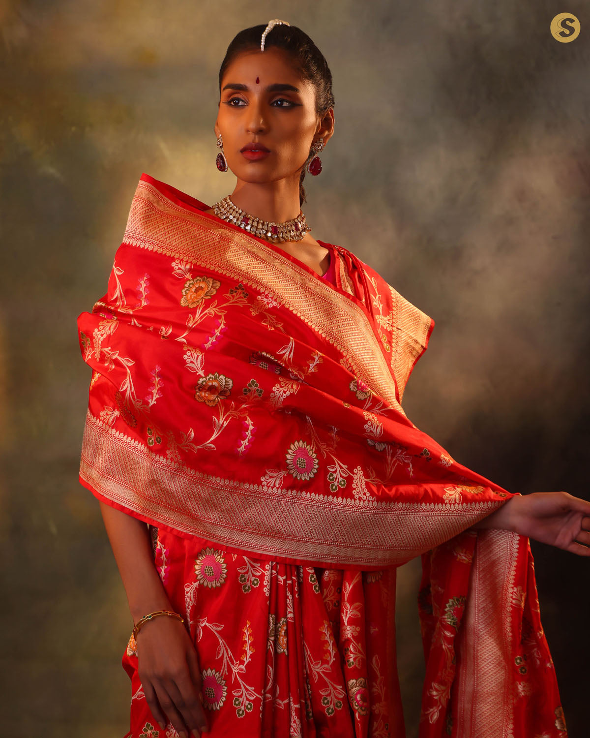 Vermillion Red Garden Banarasi Silk Saree