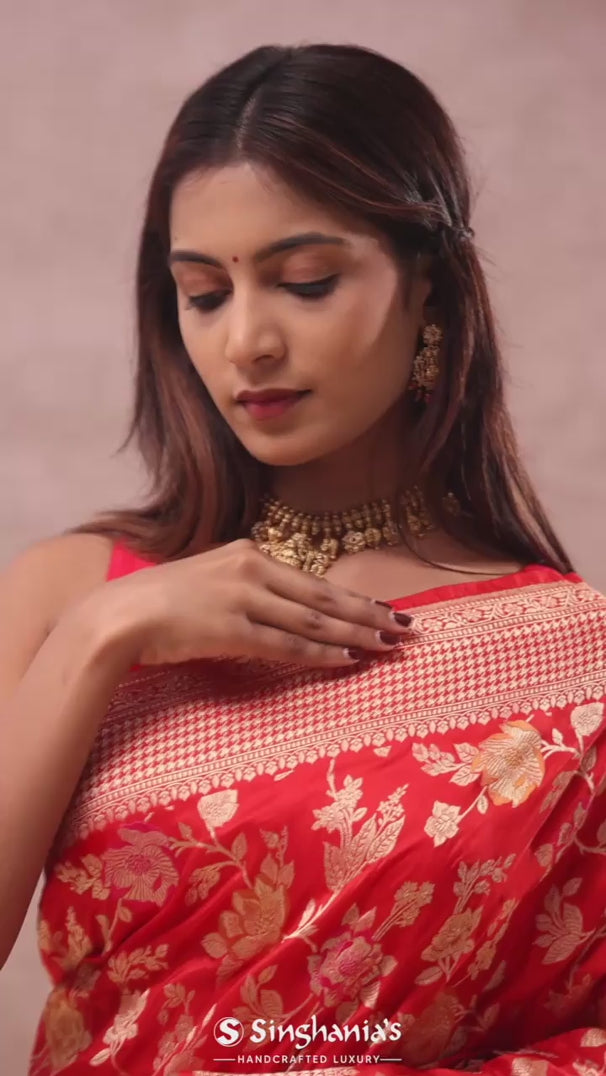 This vibrant orange Banarasi silk saree presents astonishing meenakari work on both the body and border, showcasing colorful floral patterns. The saree is further enhanced with elegant gold zari work, adding a touch of shimmer and luxury.