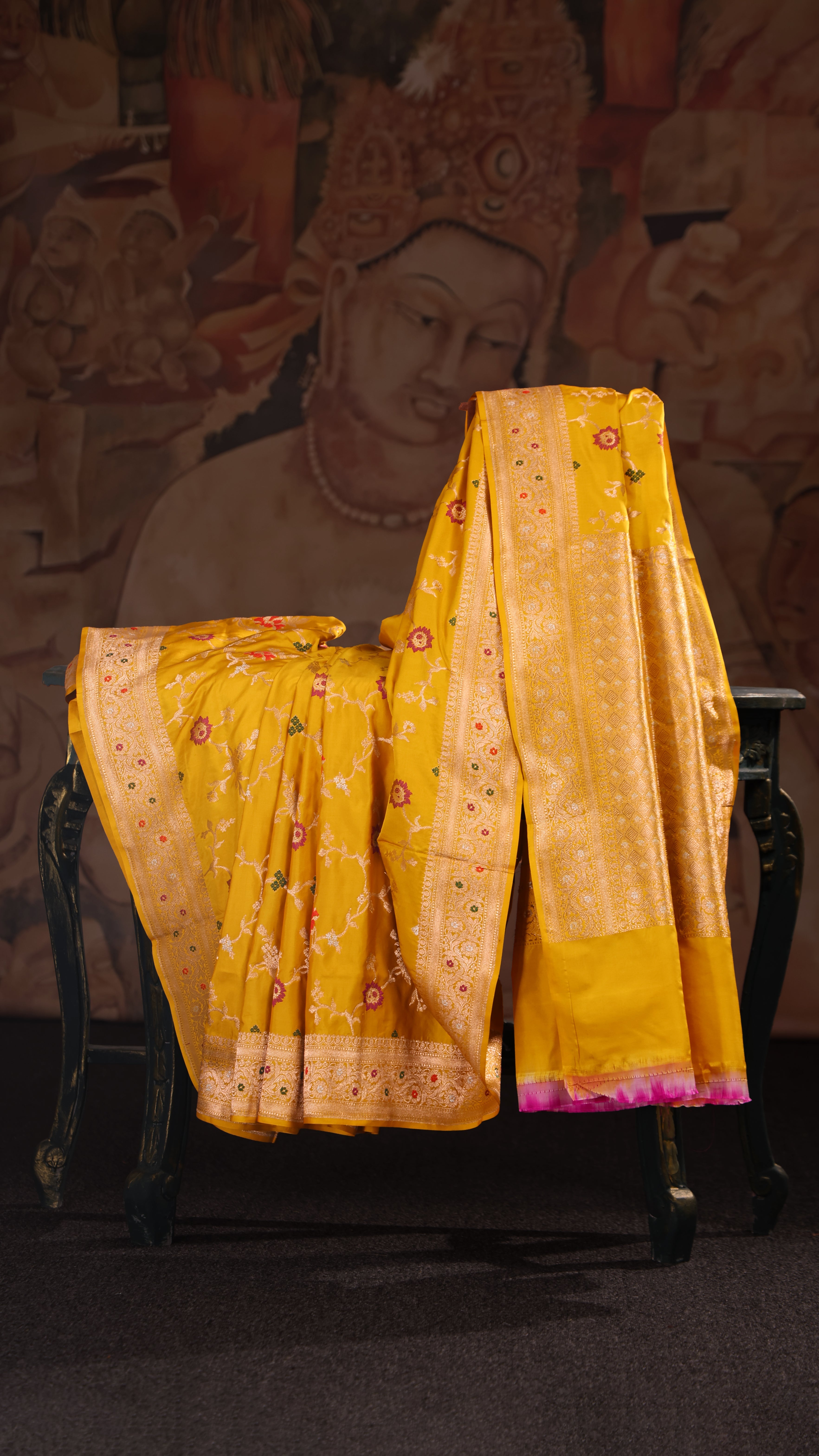 A vibrant yellow Banarasi silk saree adorned with delicate floral embroidery across the body. The saree features an elegant gold zari border and pallu, with hints of pink at the edge adding charm. Ideal for festive and traditional occasions.