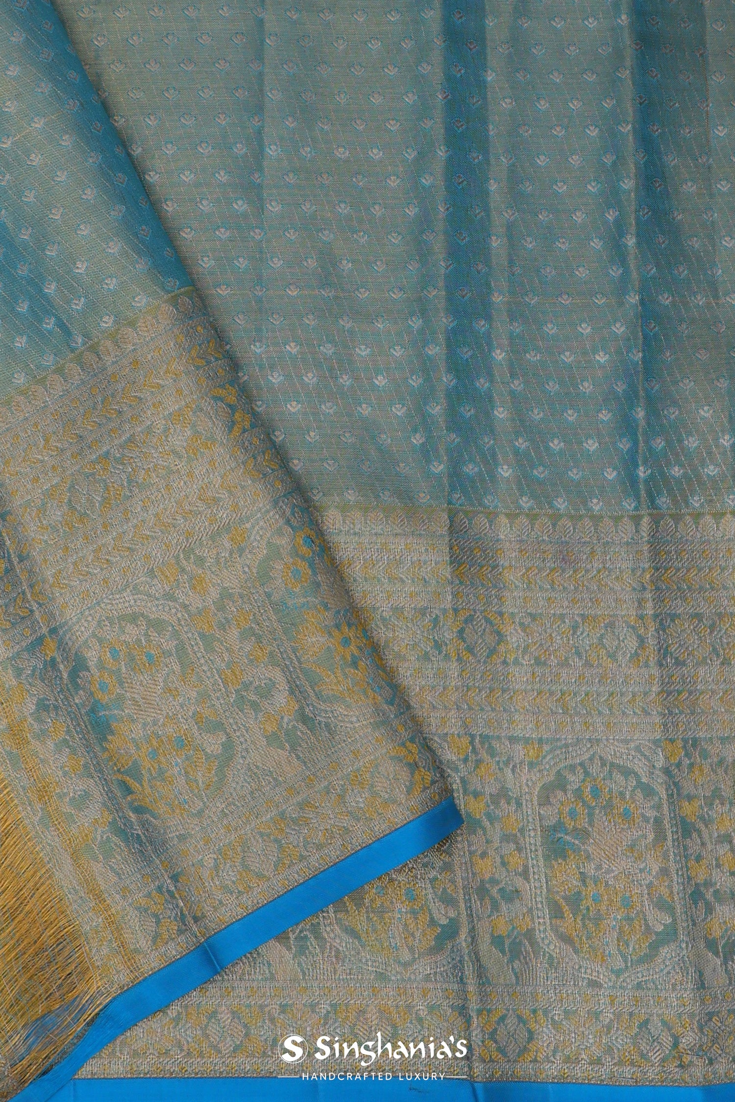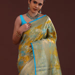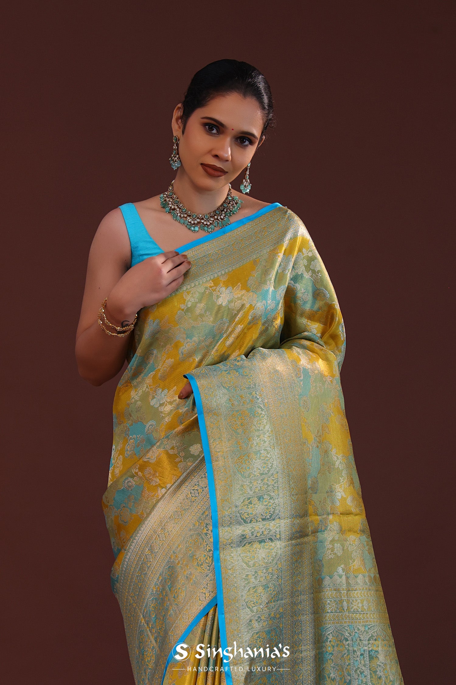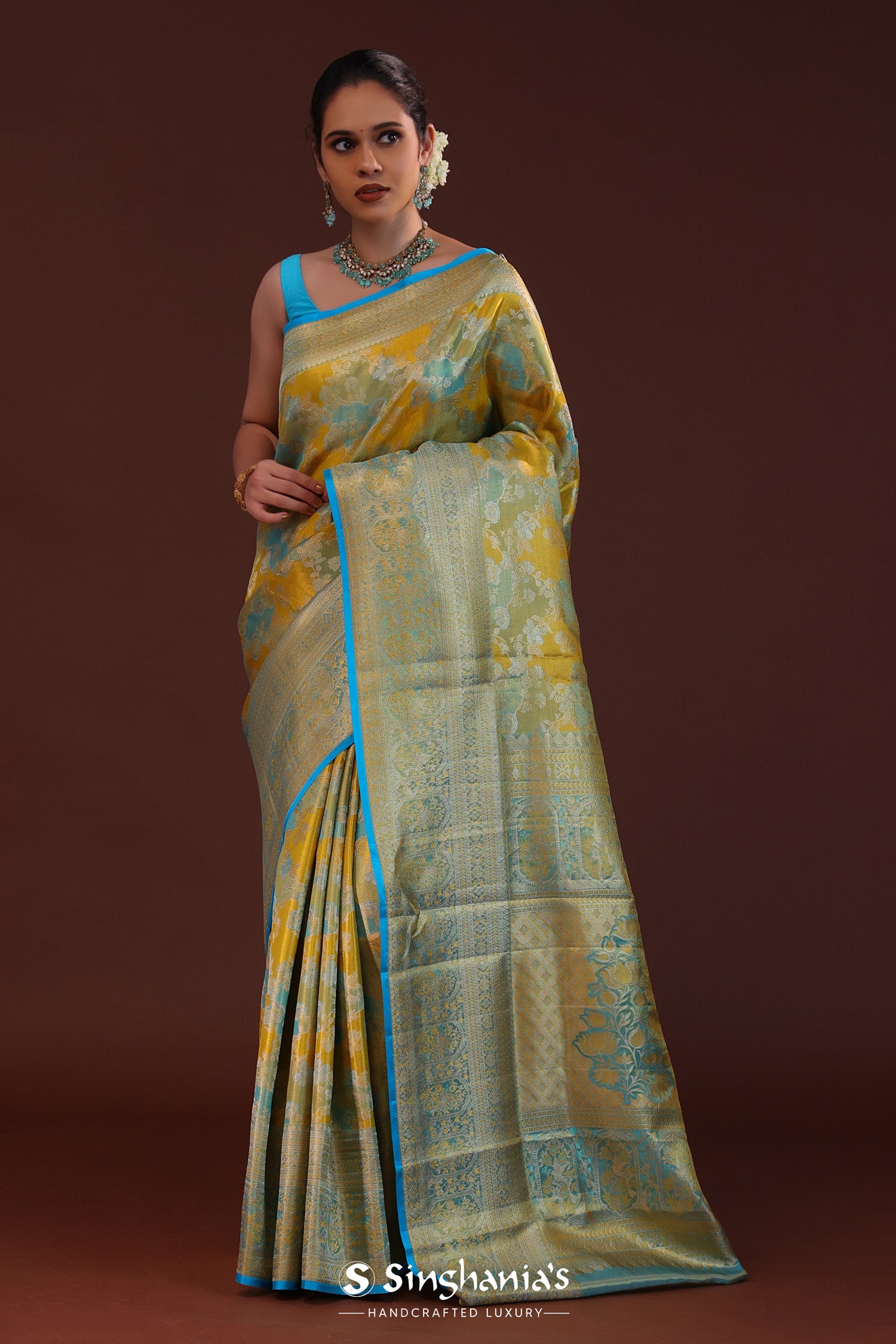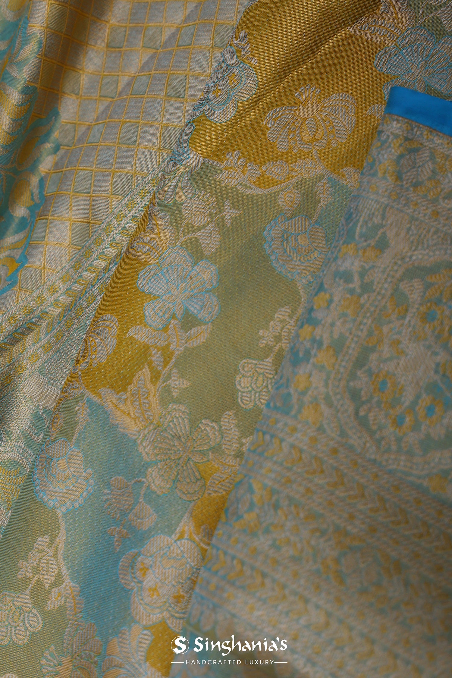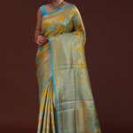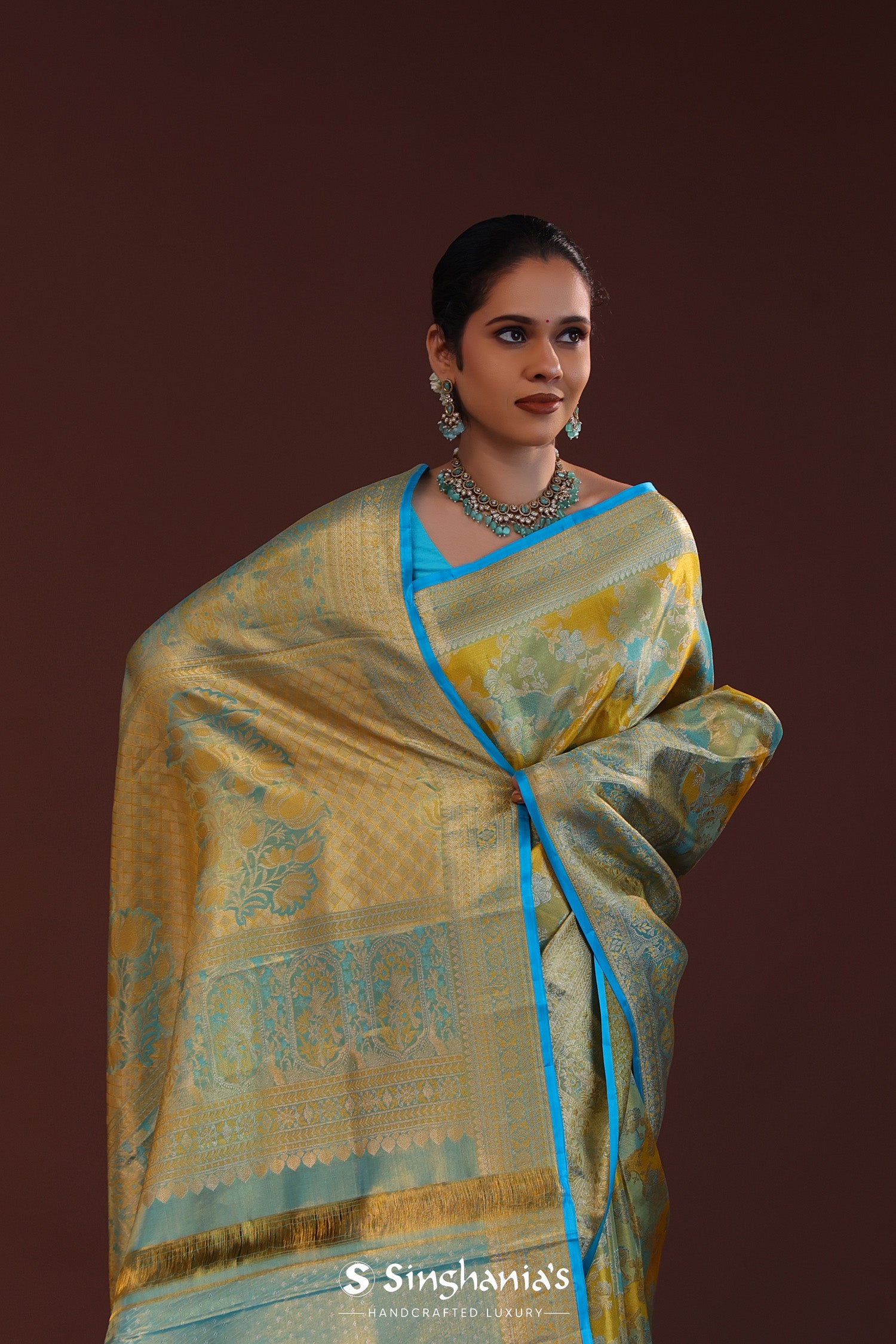 The floral rangkat design woven of the body of Yellow and blue kanjivaram tissue saree complemented with gold zari border and unstitched blouse