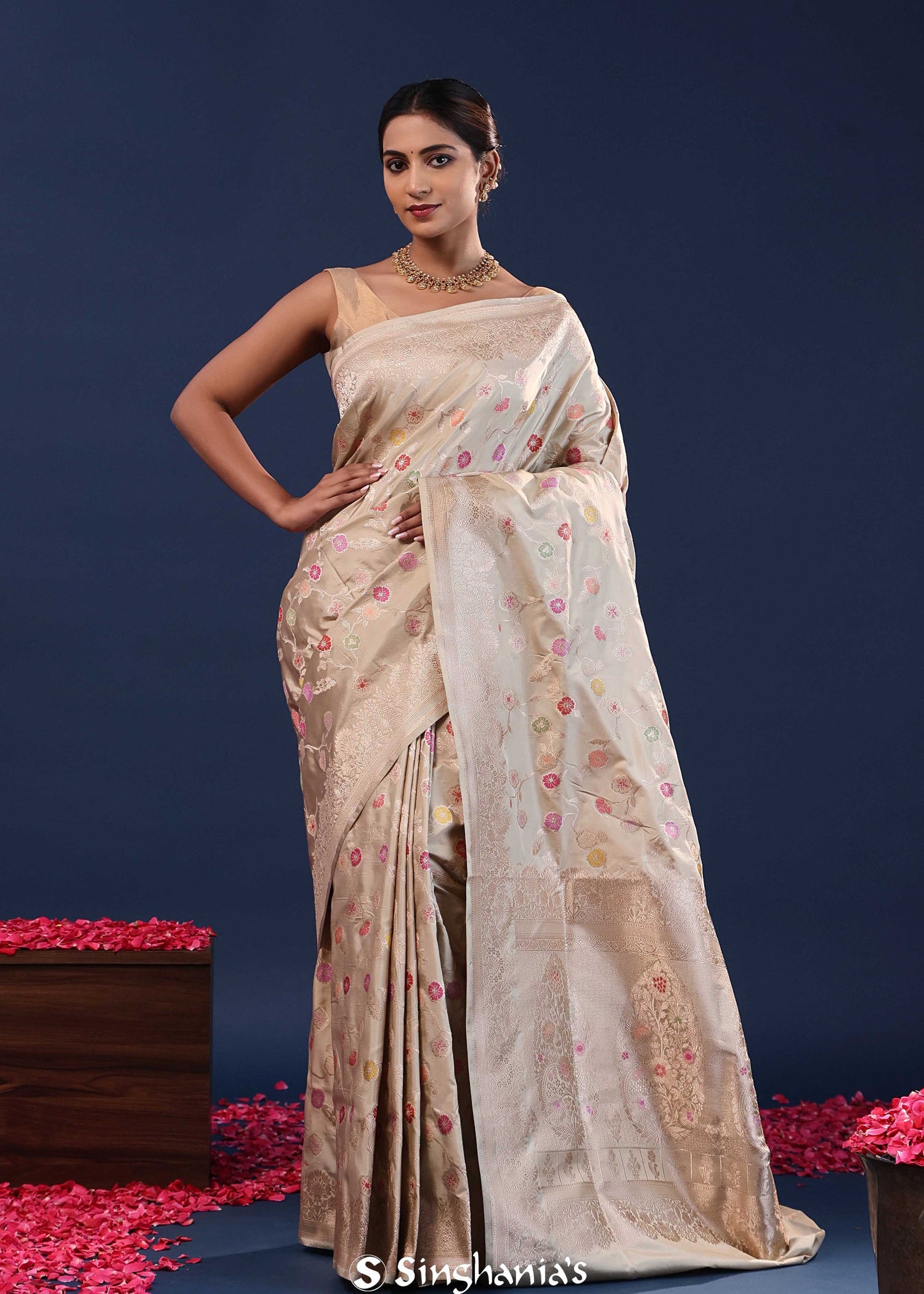 Pale Gold Kanjivaram Silk Saree With Meenakari Jaal.