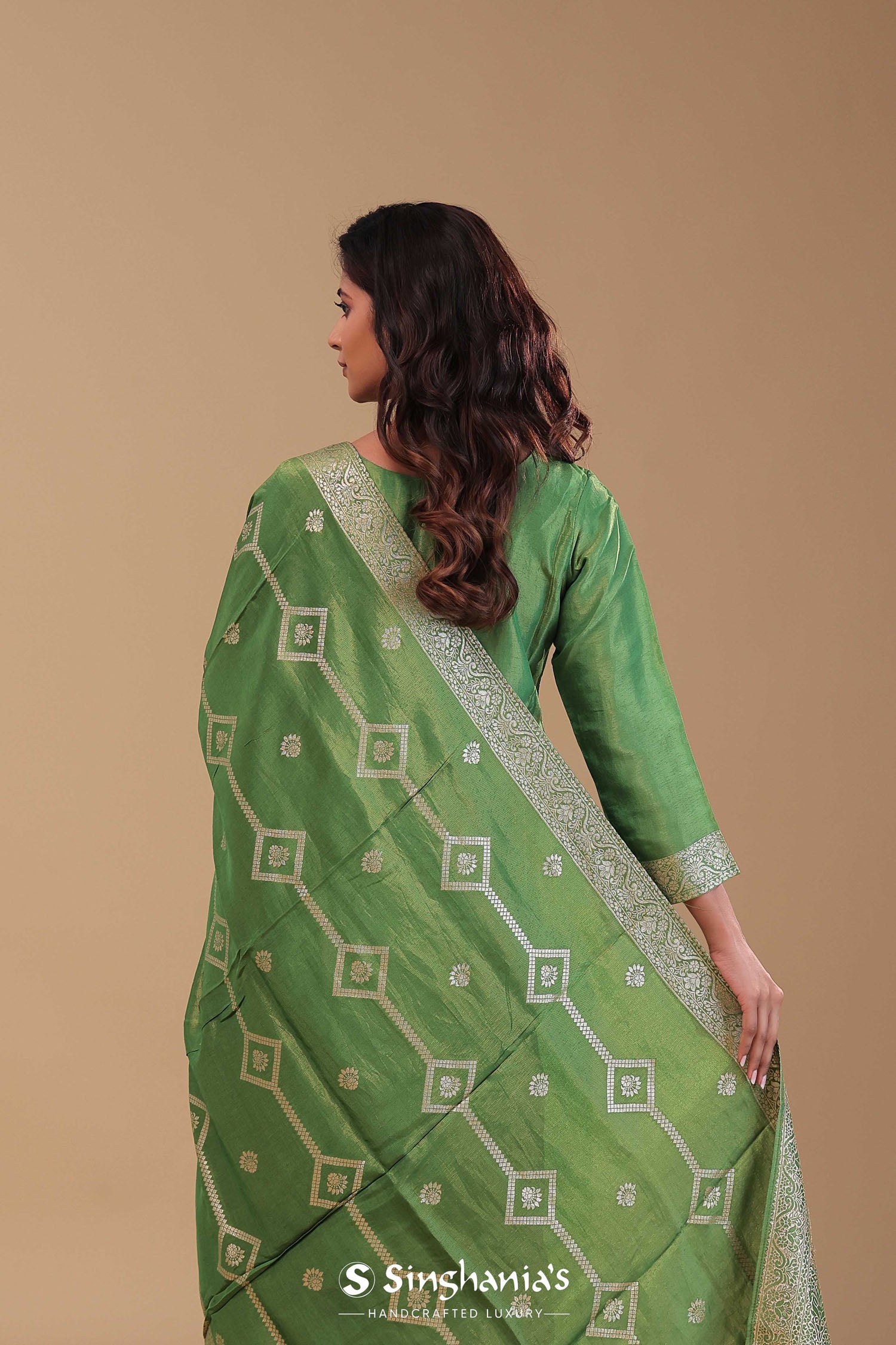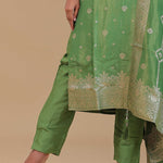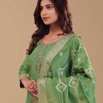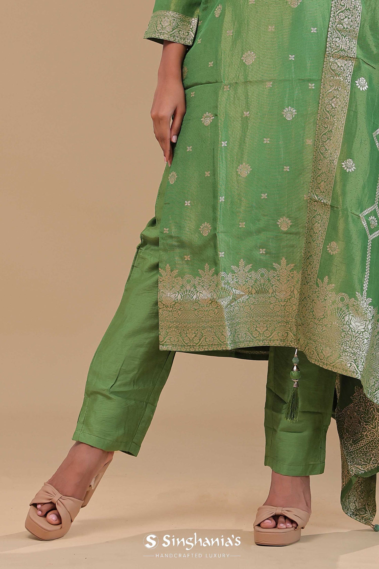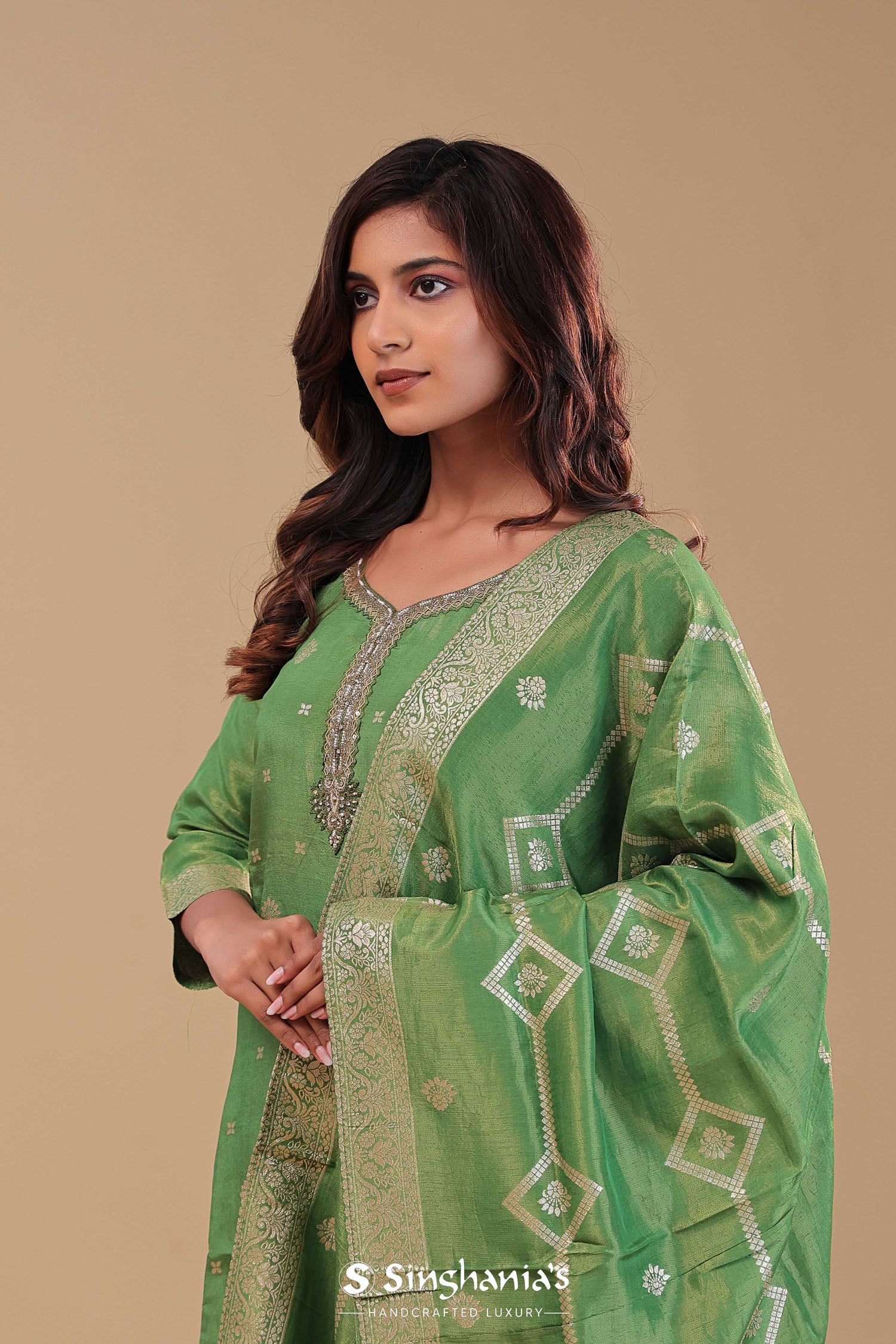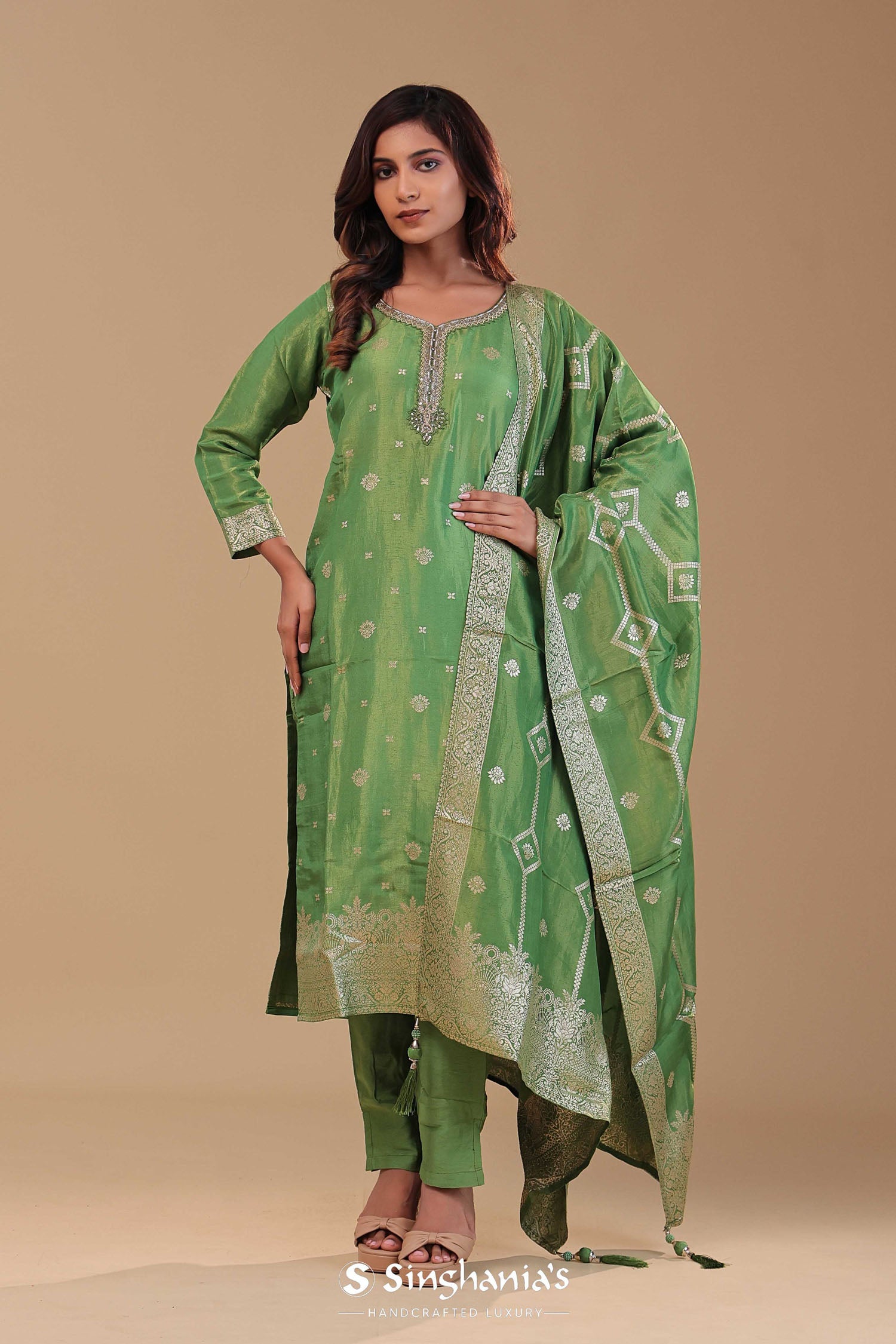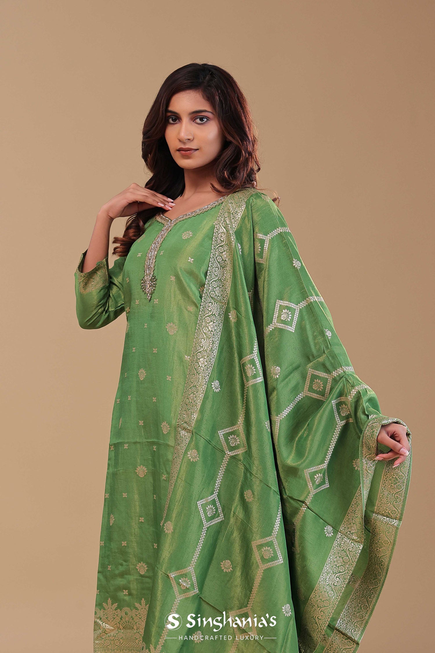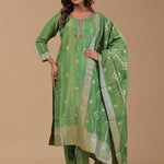 Emerald green tissue banaras kurta set features zardosi, sequins and embroidery work around the neckline of the kurta with mid-forearm sleeves and woven butti's and self border. The straight matching pants along with banarasi dupatta with woven design and self border adds the finishing touch to the entire garment
