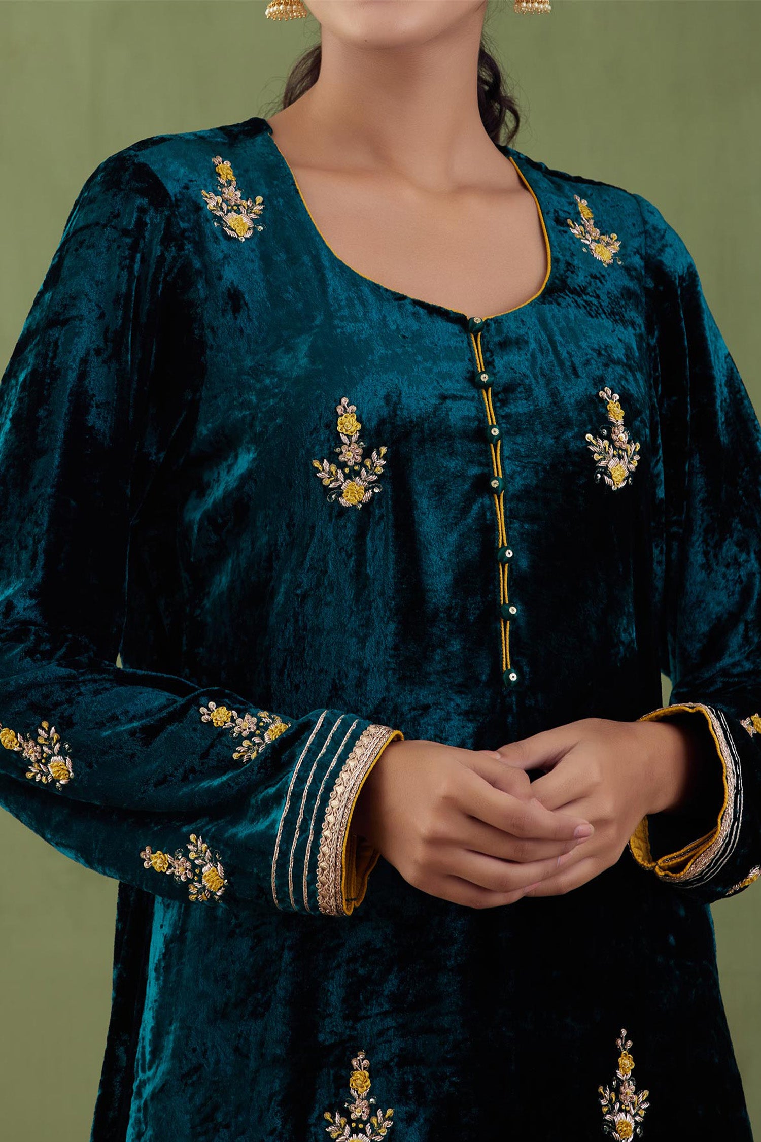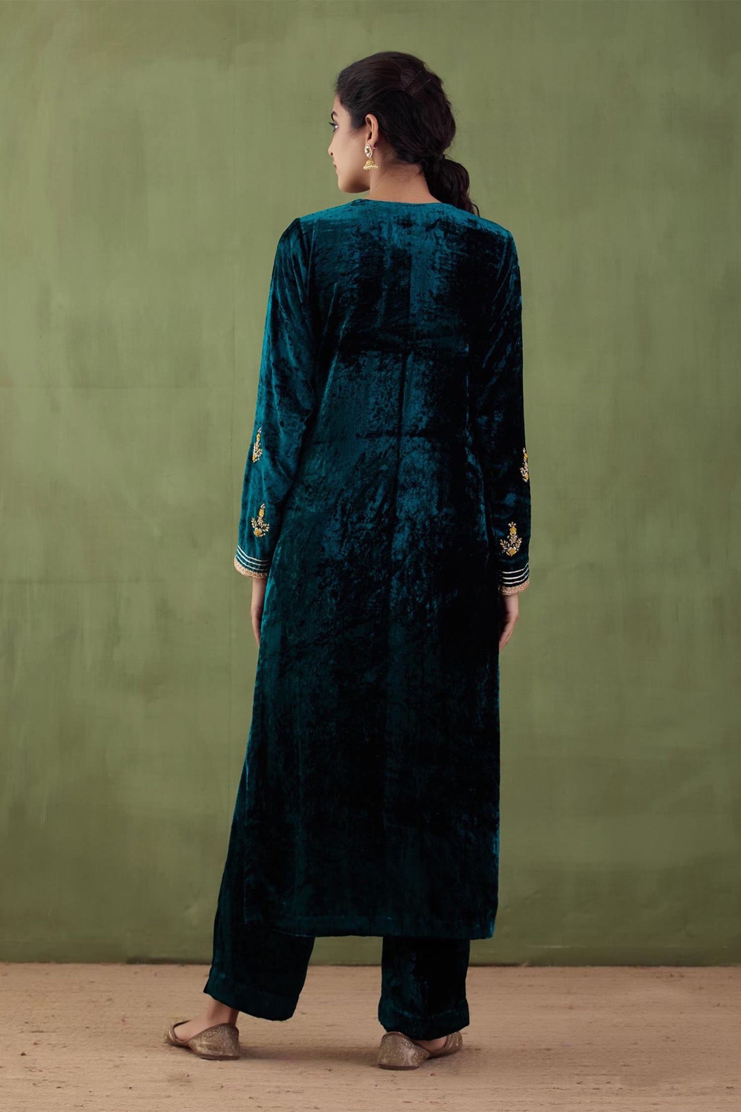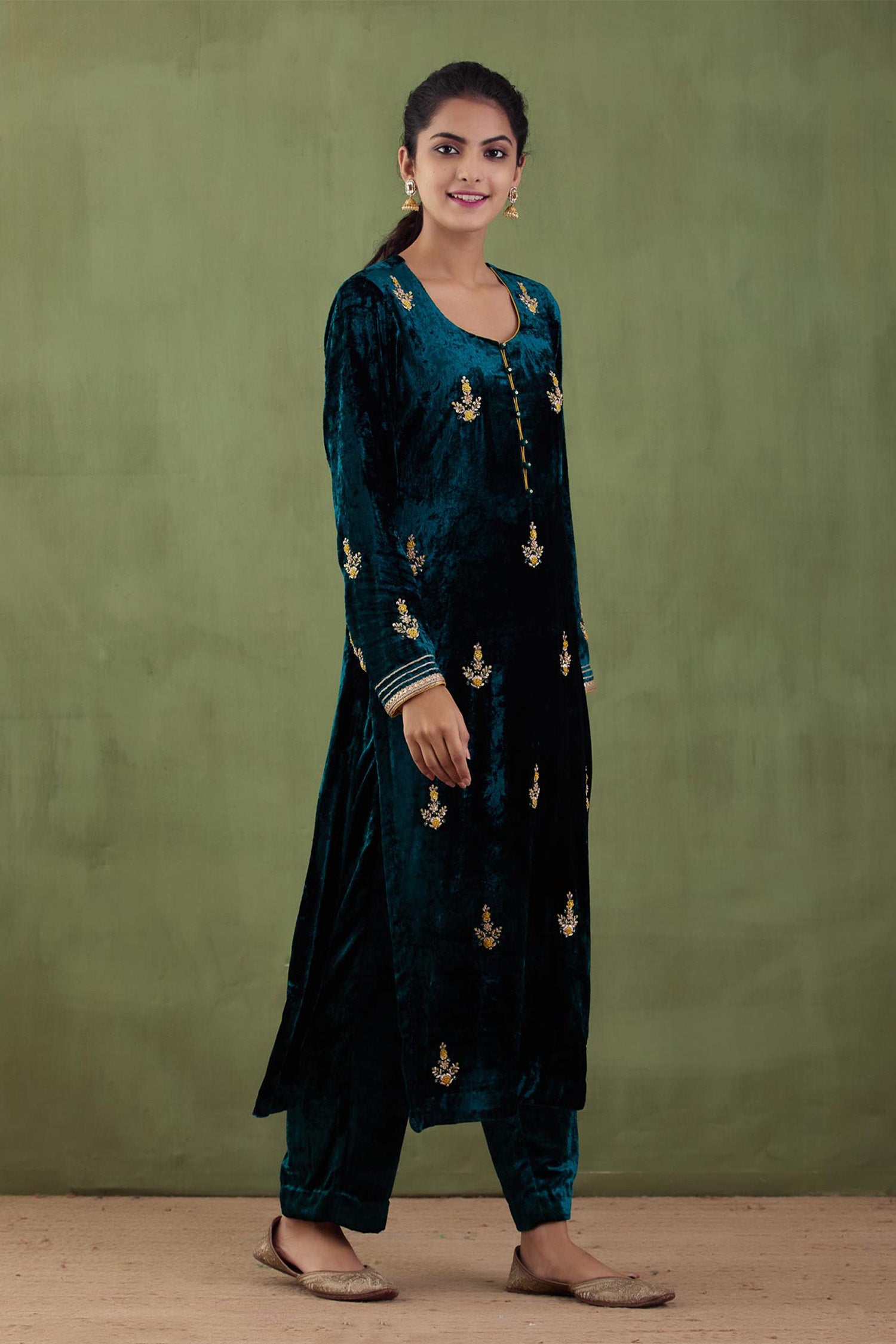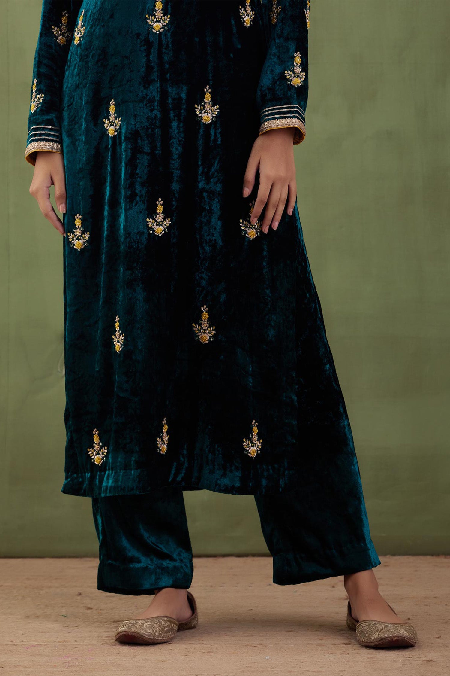 Emerald Green Velvet Straight Zardosi Work Kurta And Plain Pant