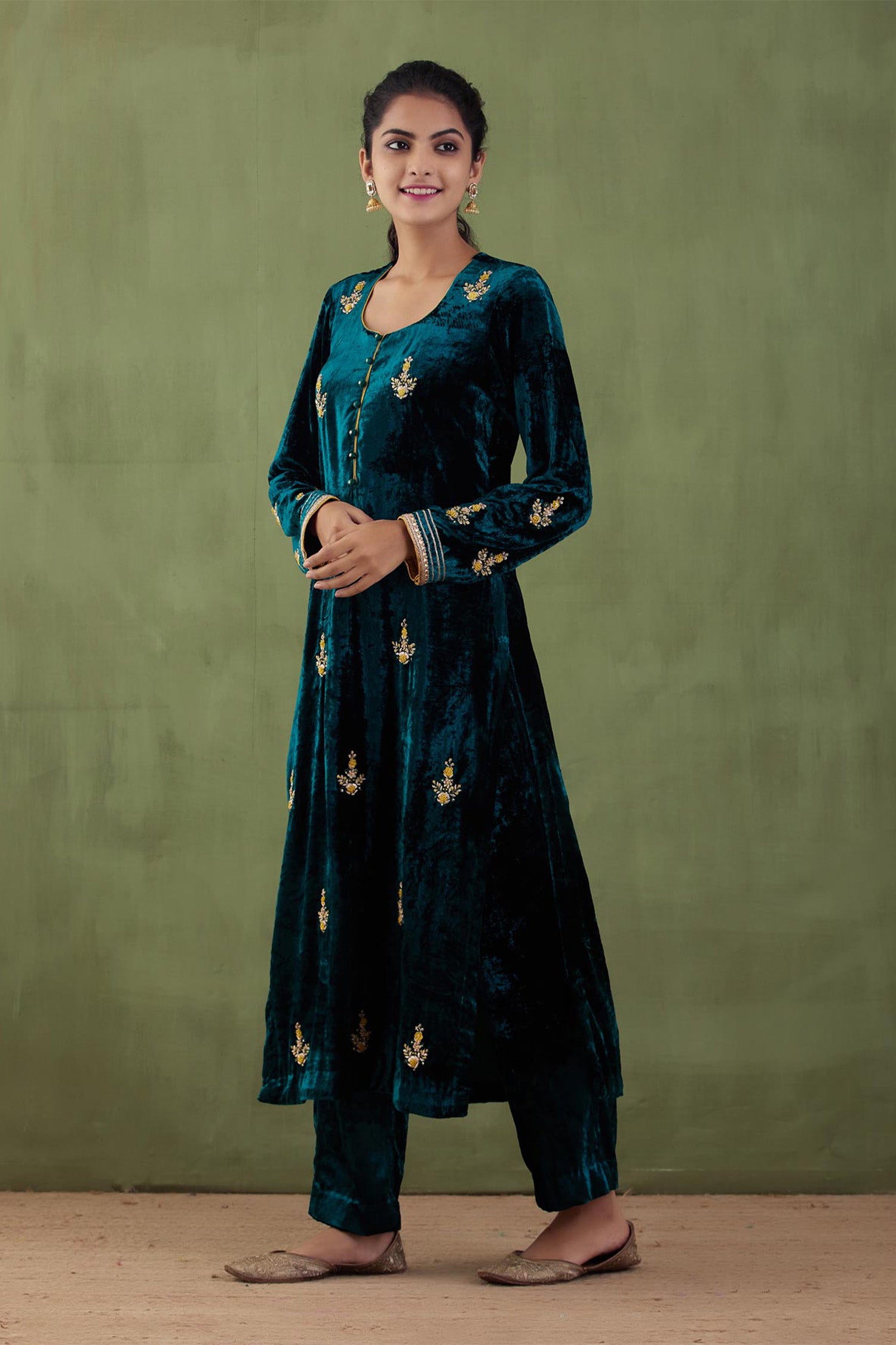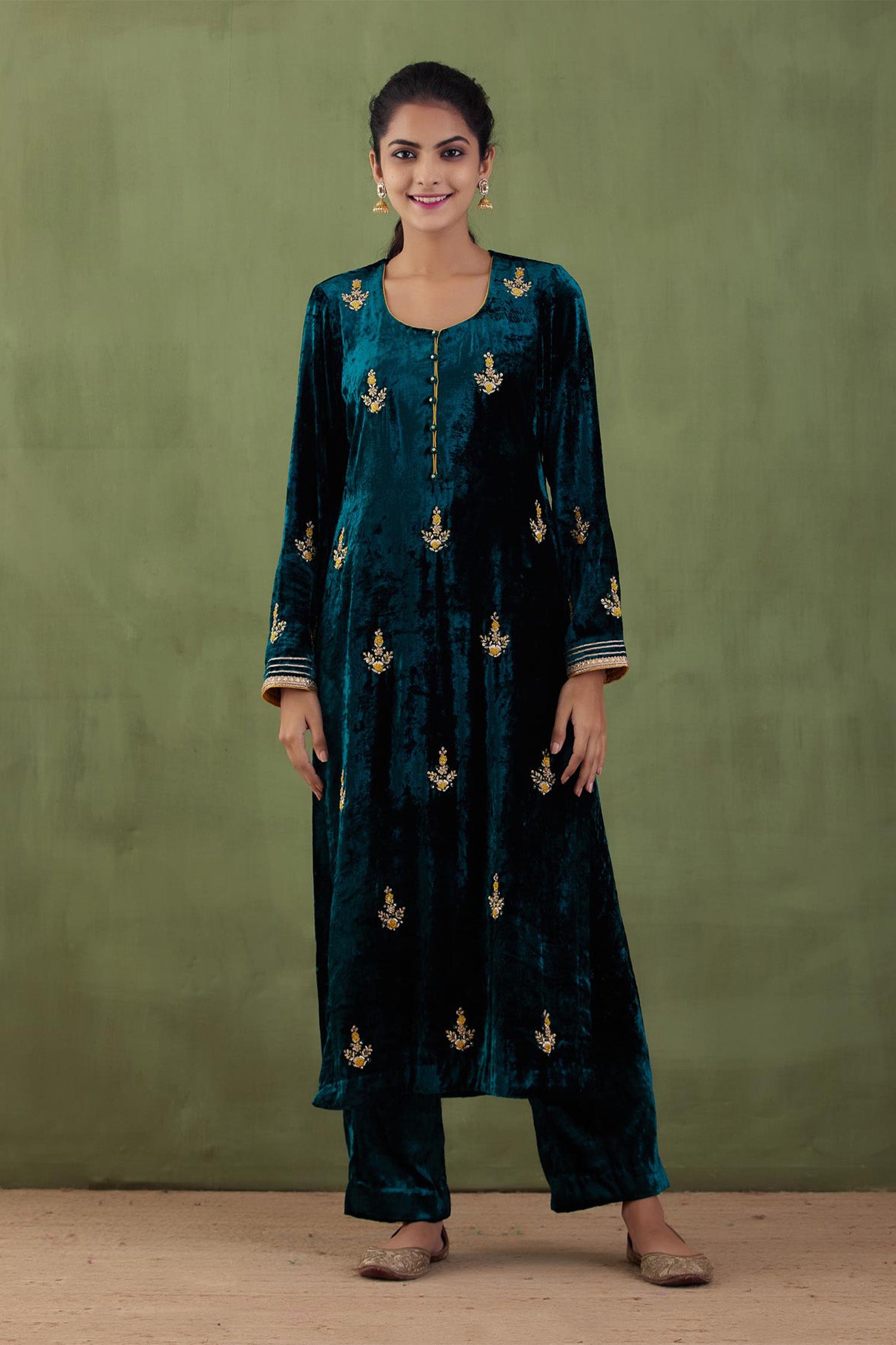 The emerald green velvet straight zardosi work kurta and plain pant with gotta Work for a rich and elegant look.