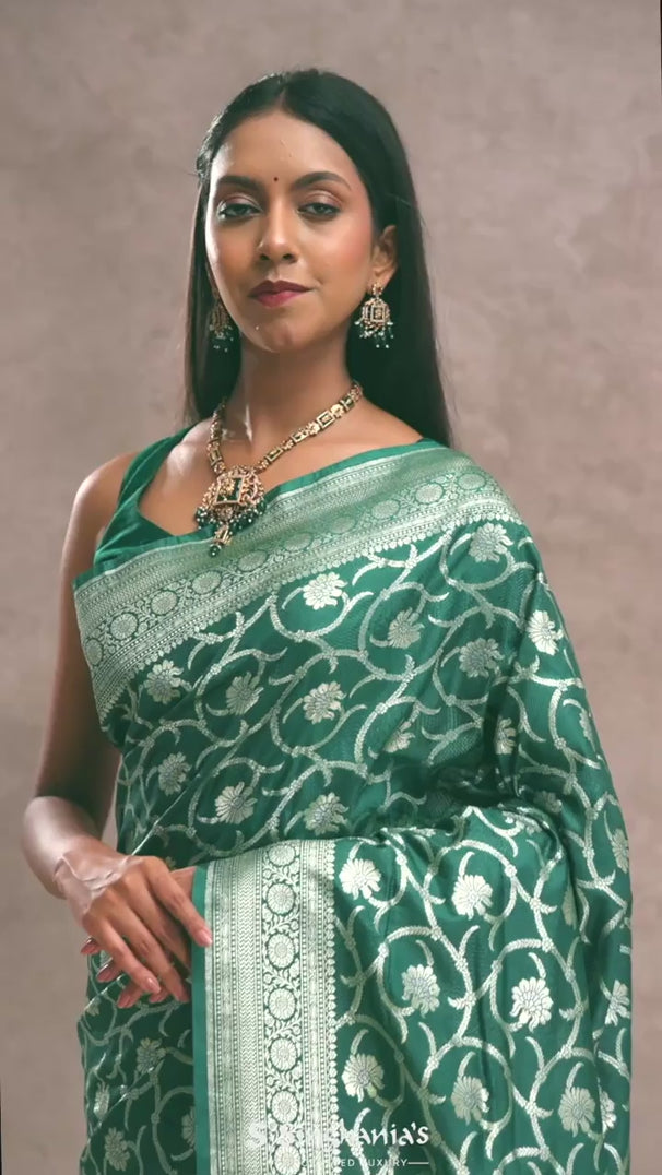 This green Banarasi silk saree presents a rich jaal body with amazing woven patterns. The silver zari border adds a subtle yet elegant shine, making it perfect for festive occasions. The blend of lush green and shimmering silver emits timeless beauty and traditional charm.