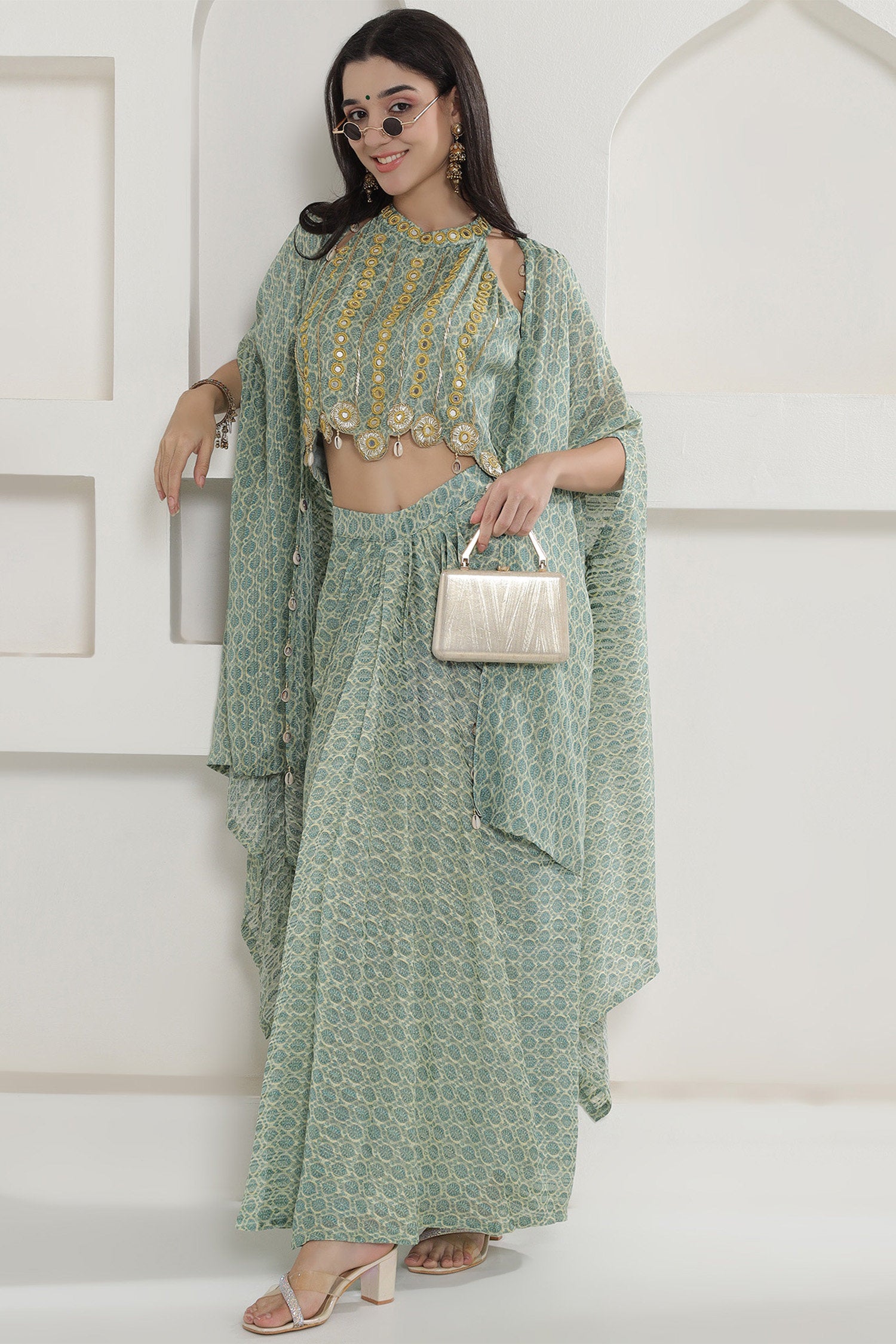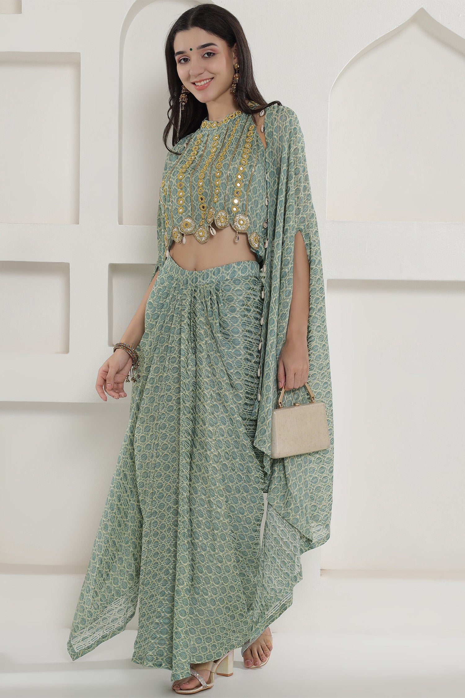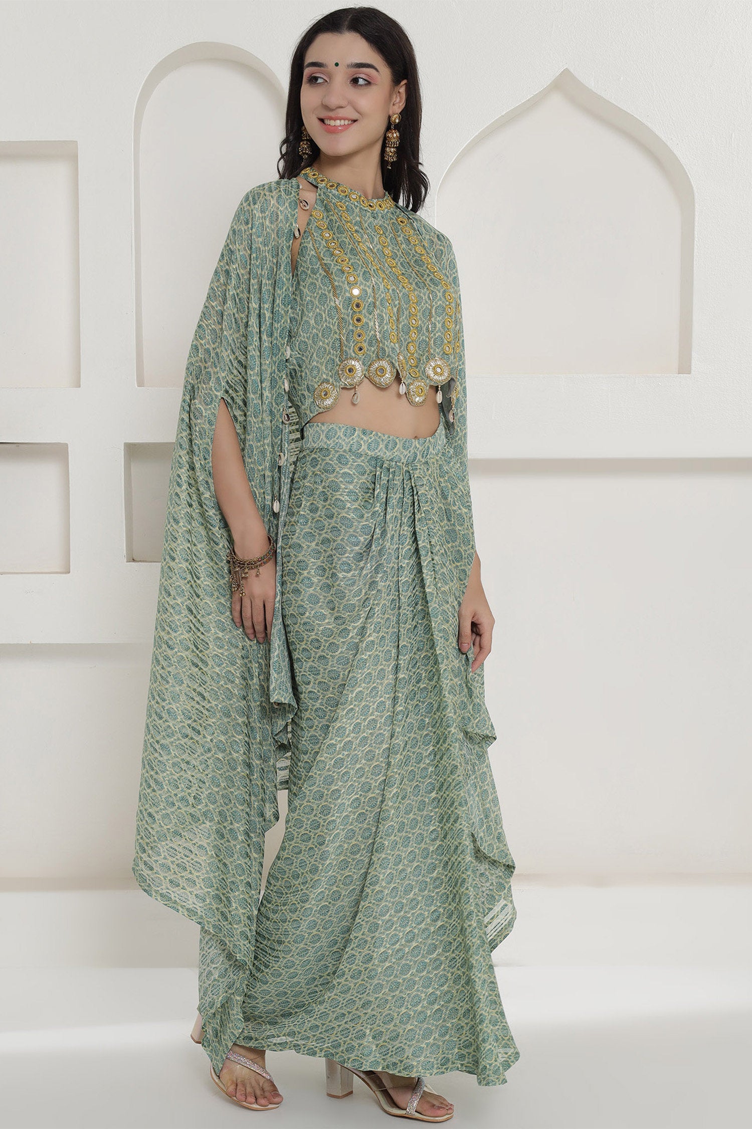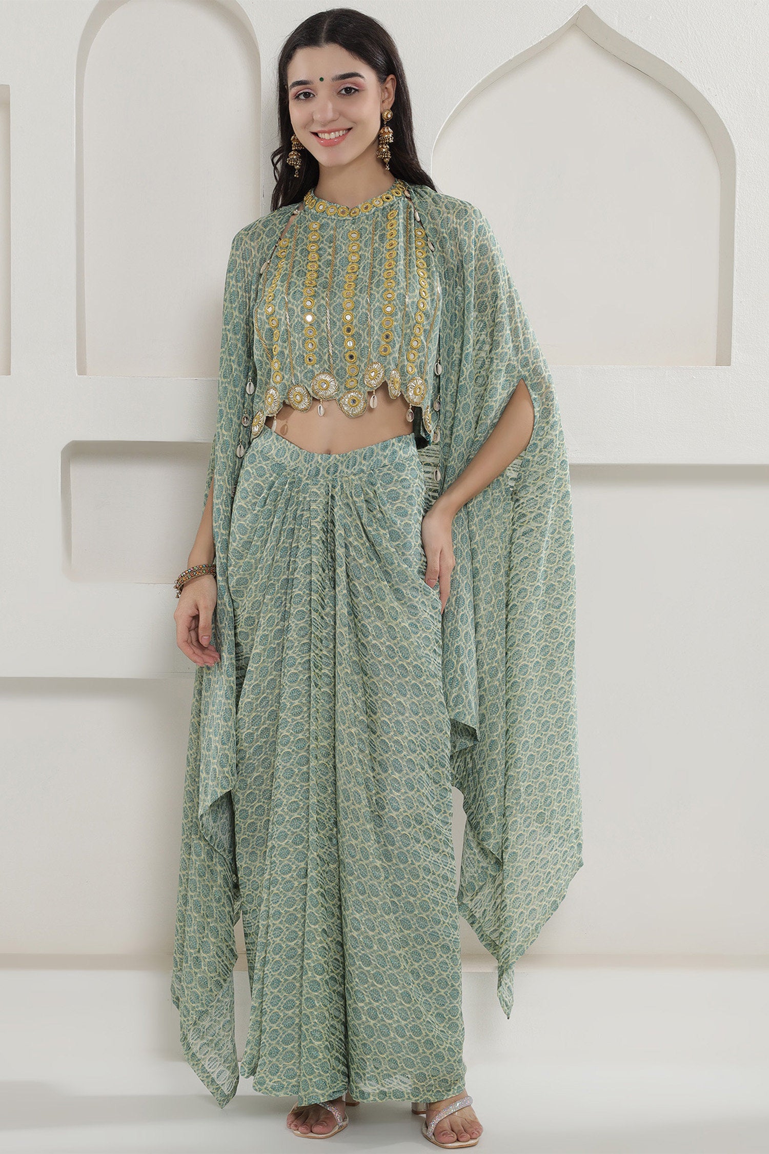 This green georgette cape inner and dhoti set is beautifully adorn with the shells.Top has some mirror work with halter neck and paired with shrug style jacket which makes it perfect for special events and for holidays