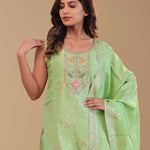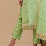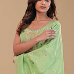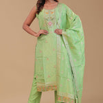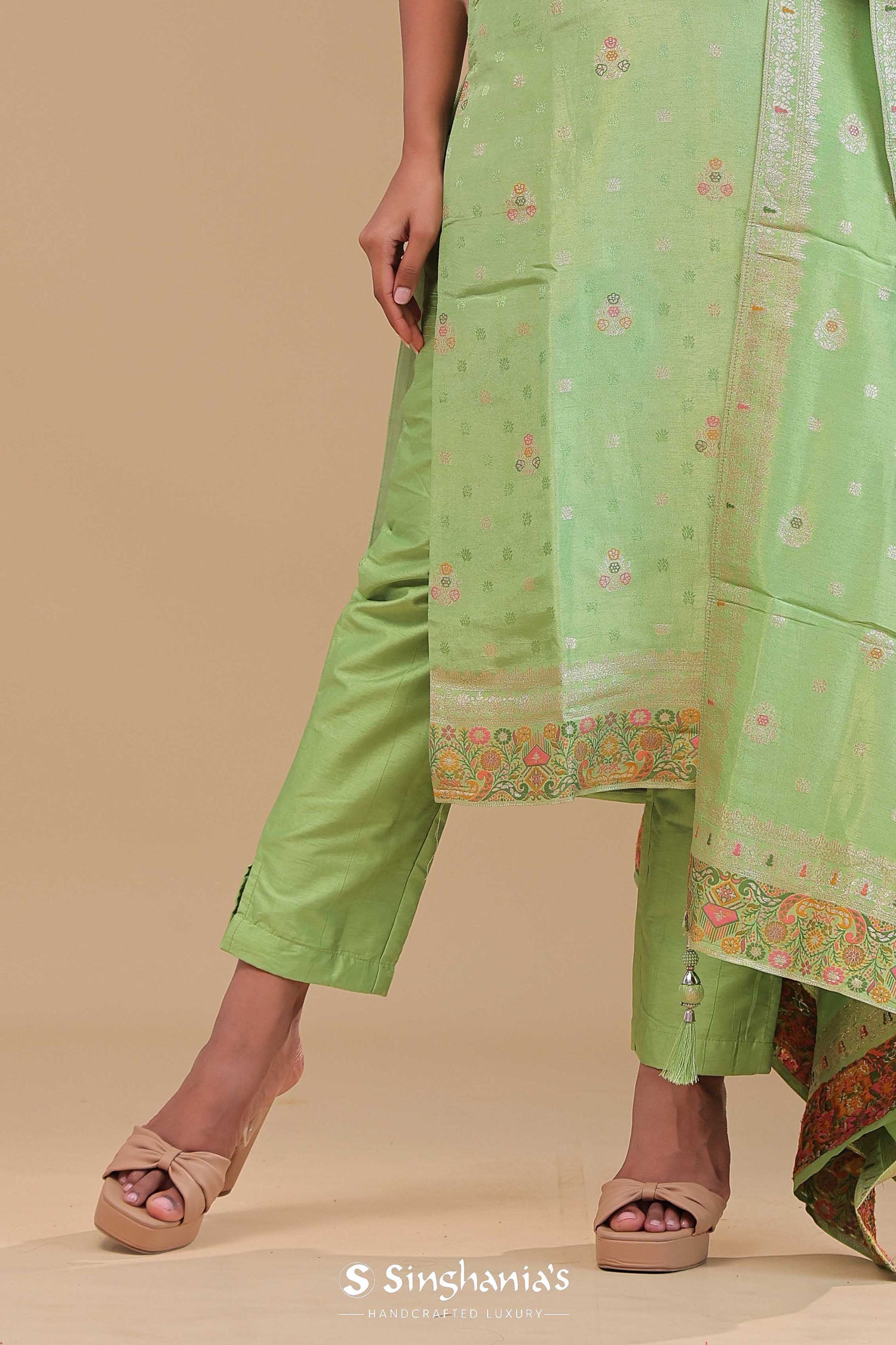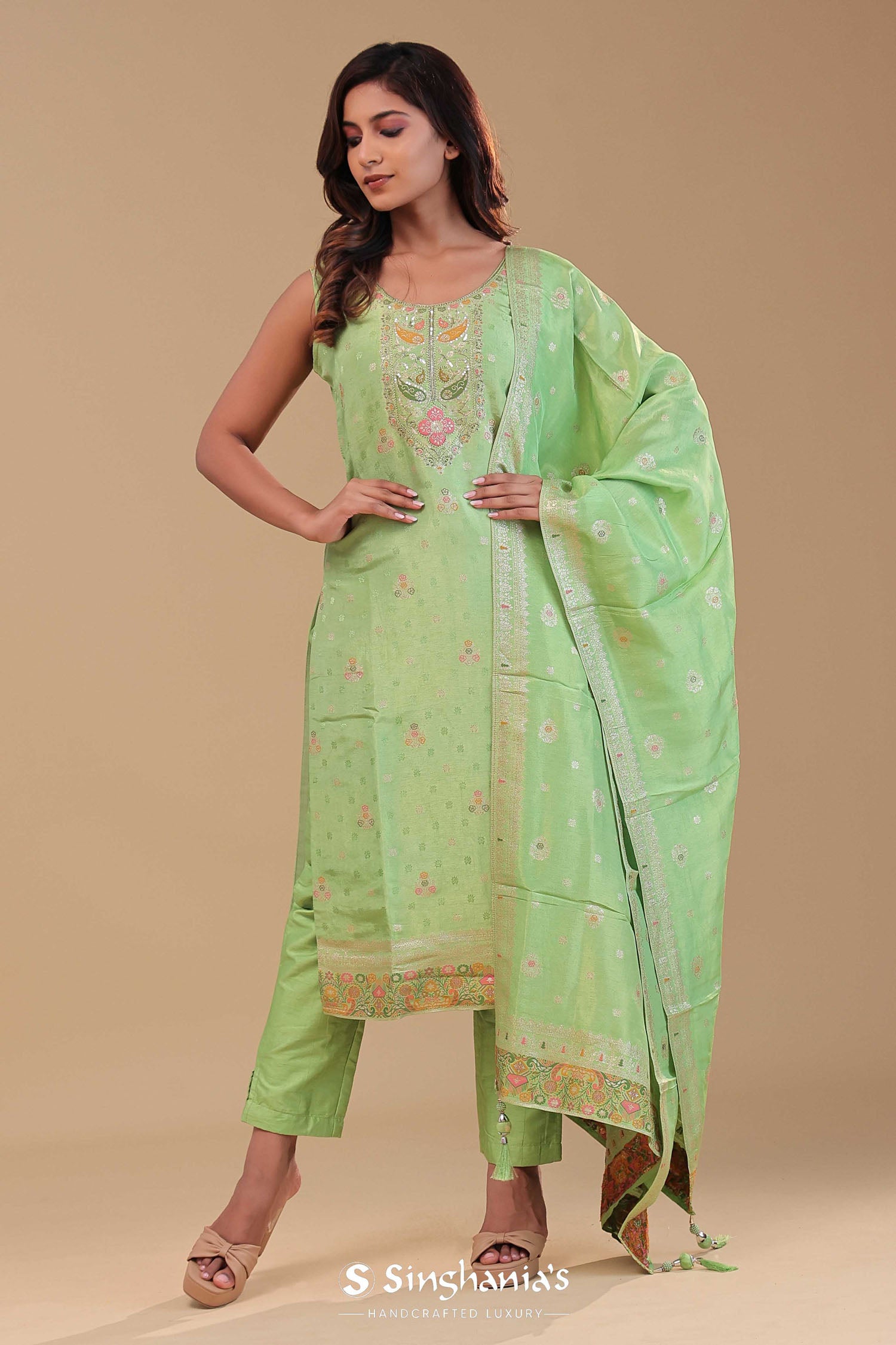 Pista green tissue banarasi kurta set features round neck and sleeveless kurta adorned with woven design along with dupatta with similar pattern. The silk straight pant adds the finishing touch to the entire garment