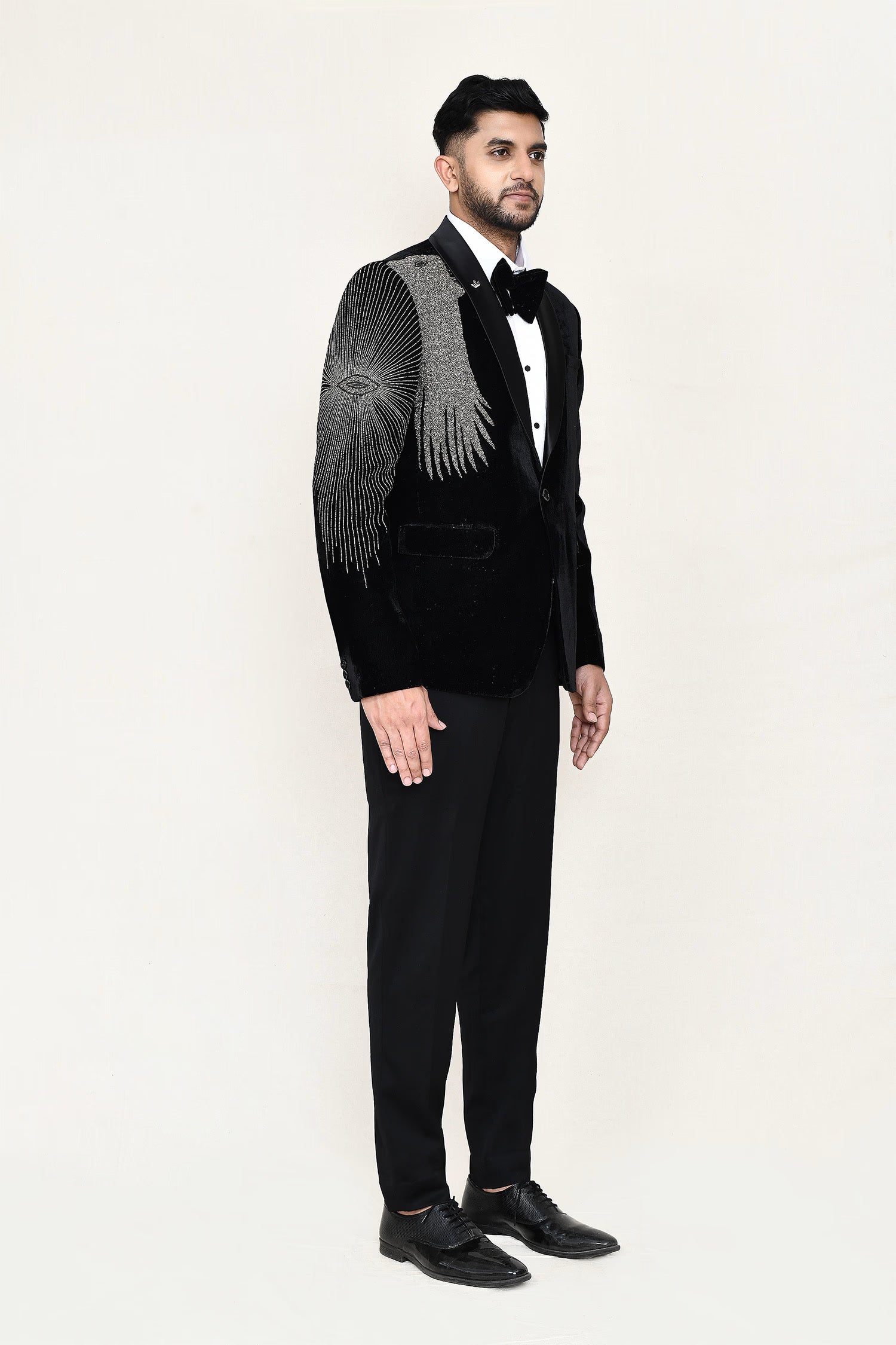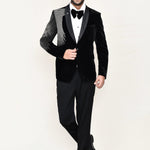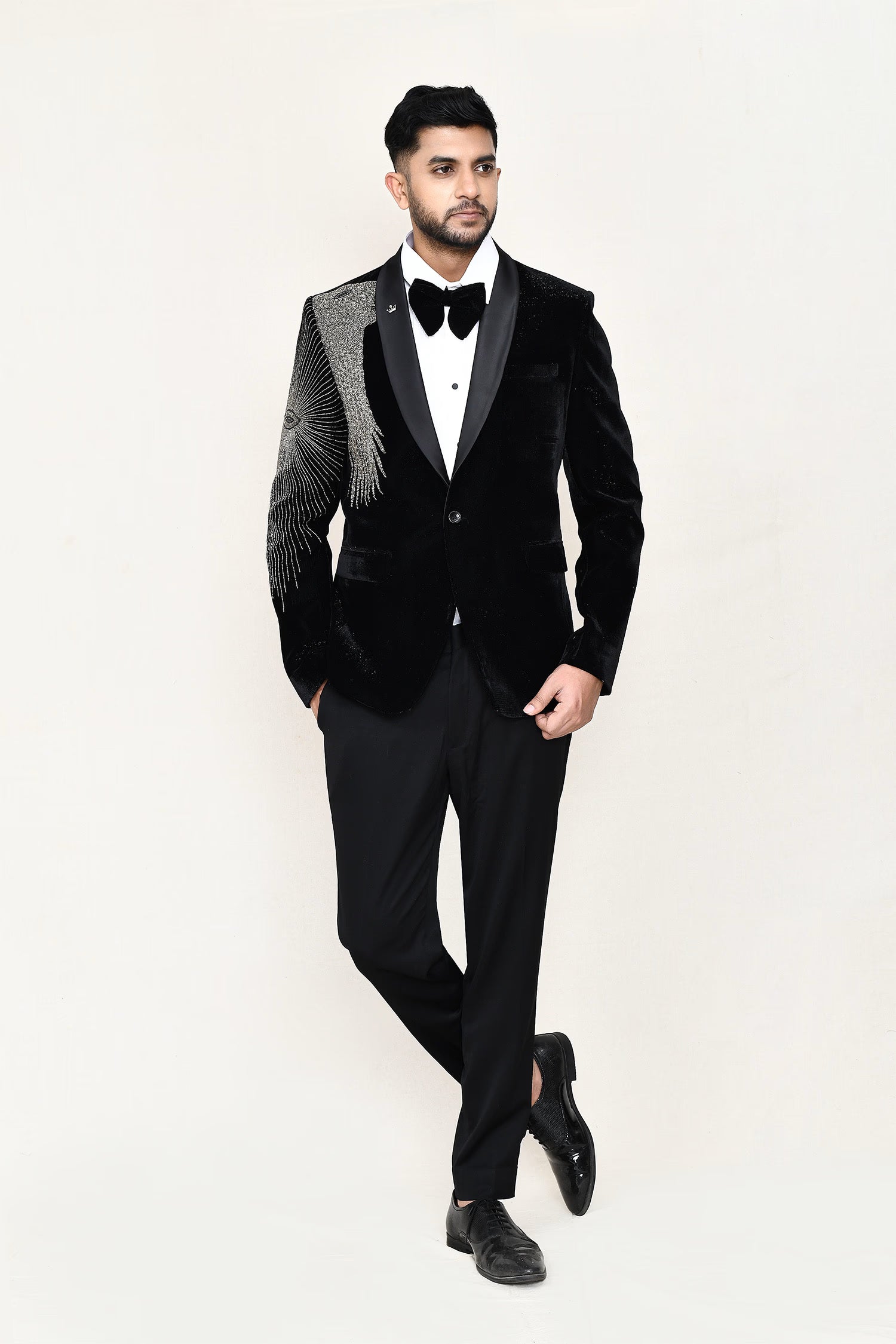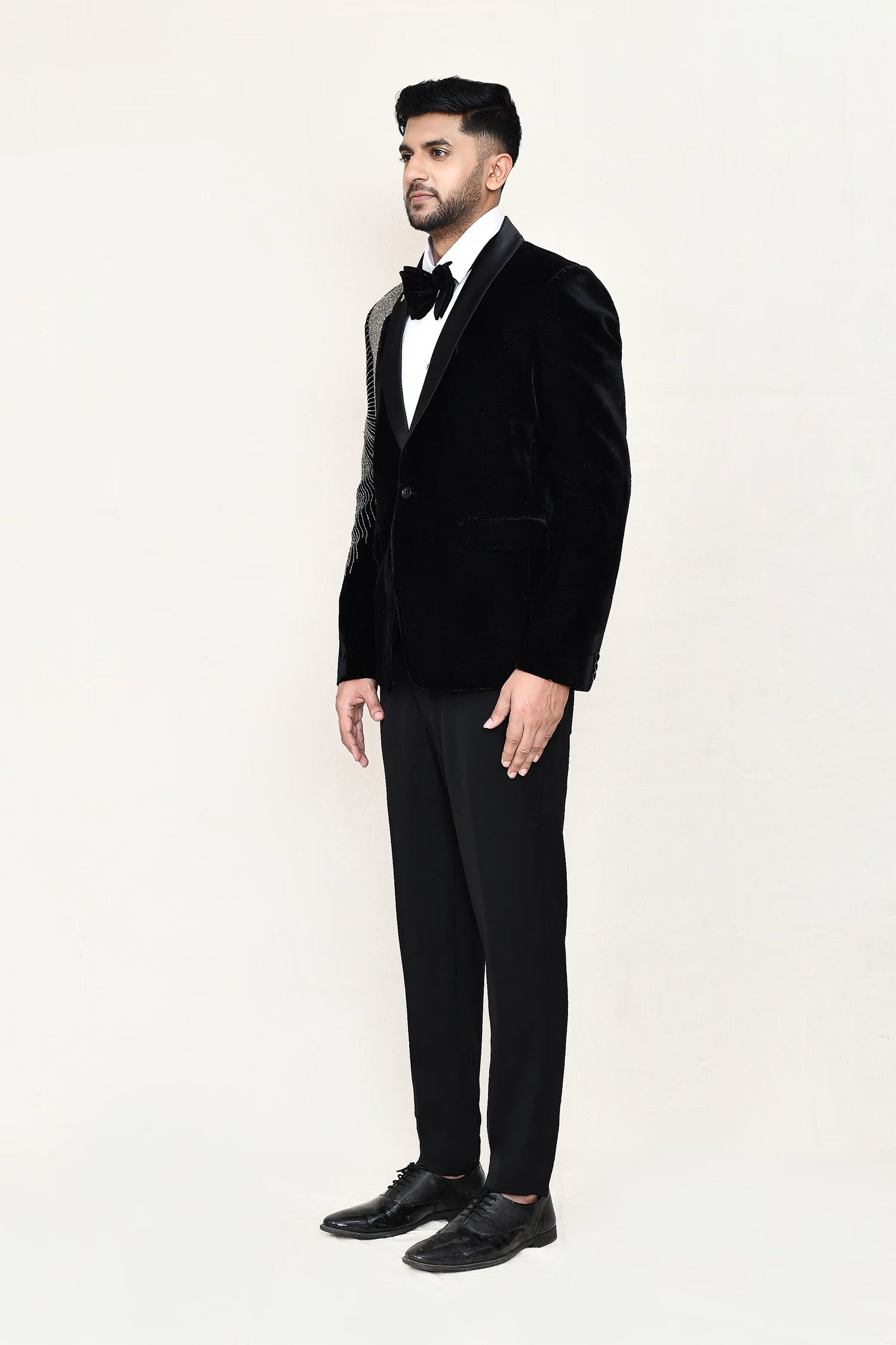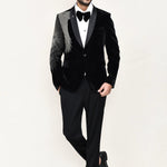 This black velvet three piece suit set has white shirt , black velvet jacket which has embroidery work on the right side of the shoulder paired with black pant, makes it simple and graceful to wear it at any formal occasion with a bow.