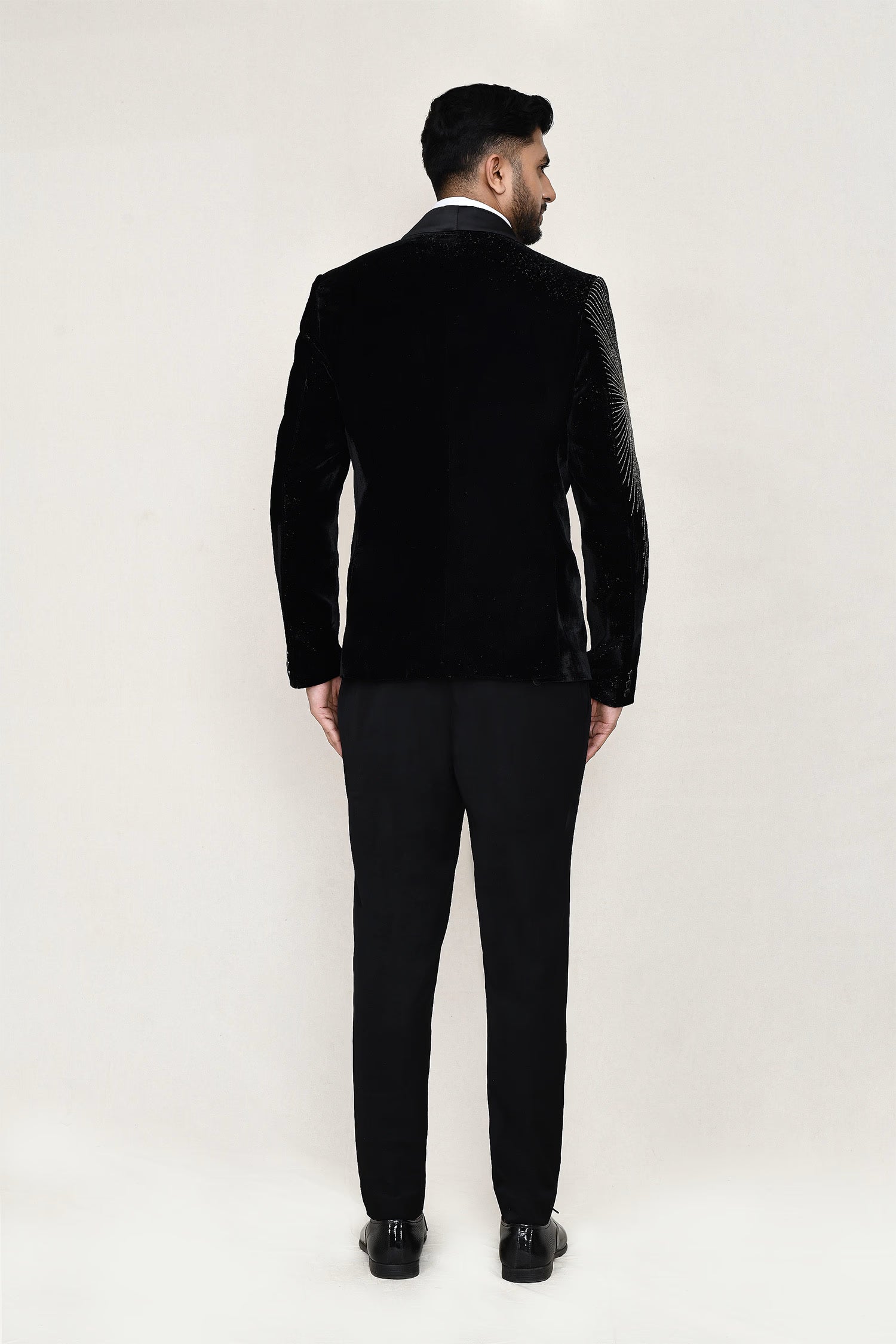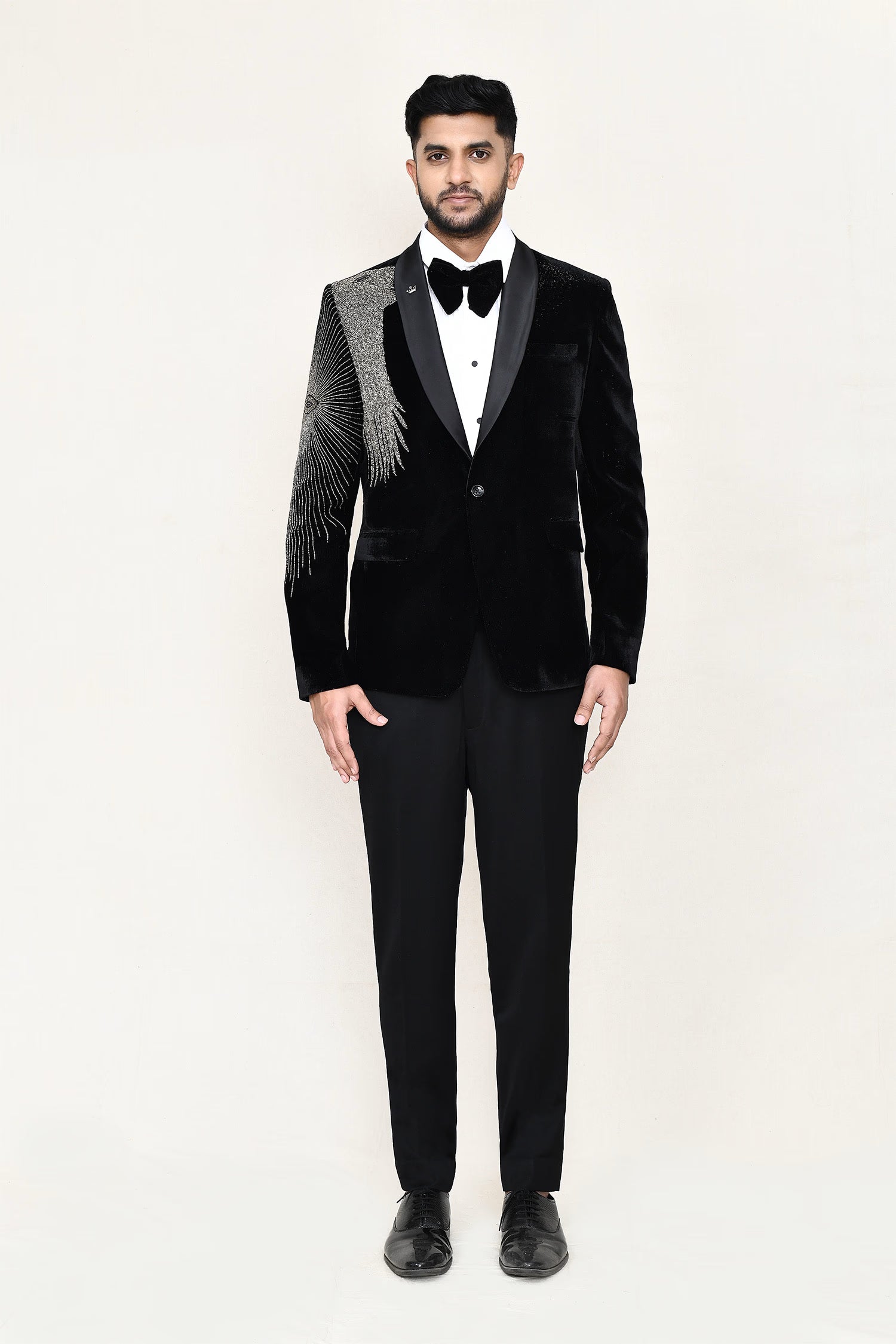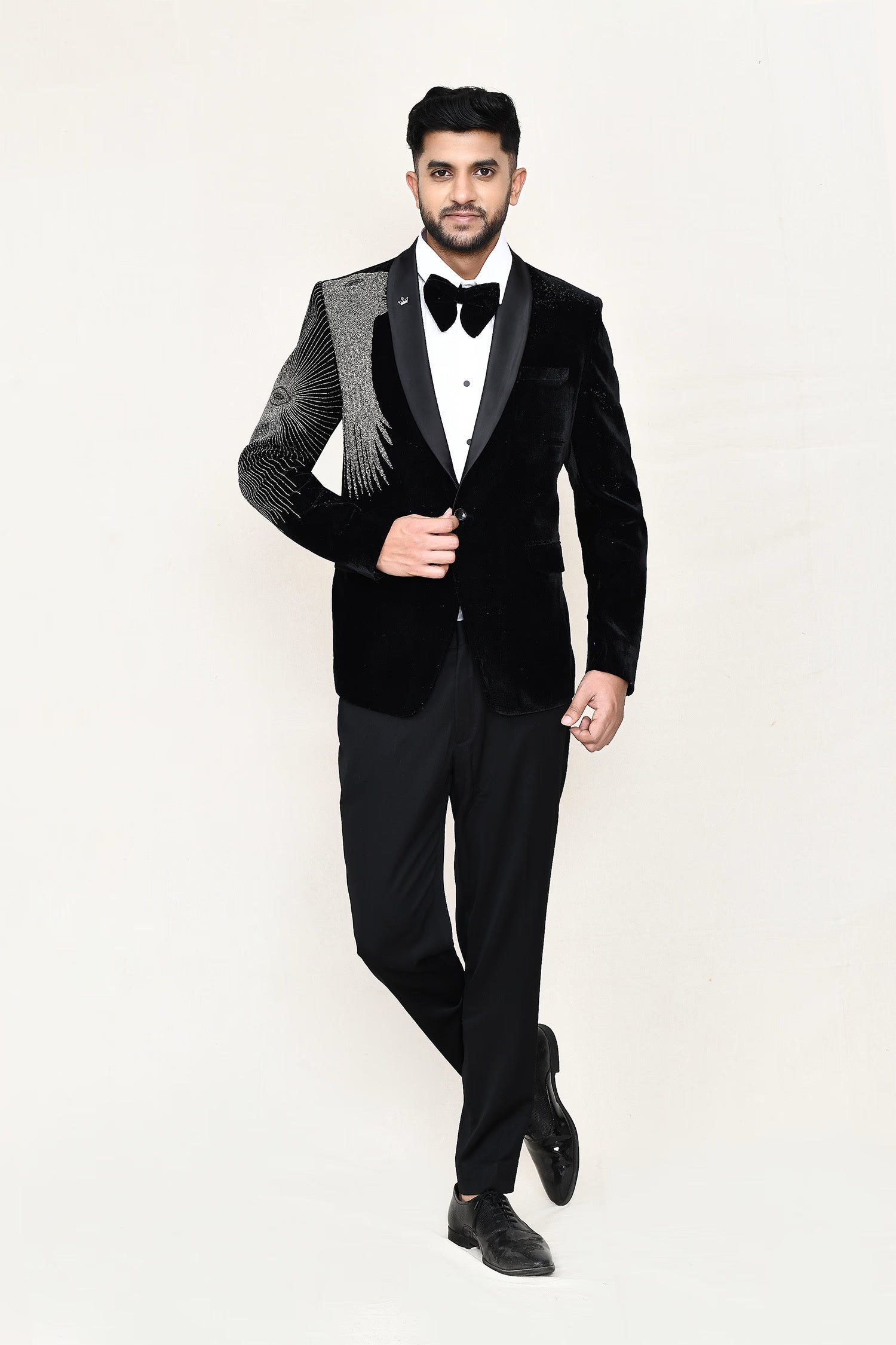 This black velvet three piece suit set has white shirt , black velvet jacket which has embroidery work on the right side of the shoulder paired with black pant, makes it simple and graceful to wear it at any formal occasion with a bow.