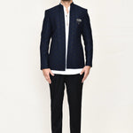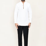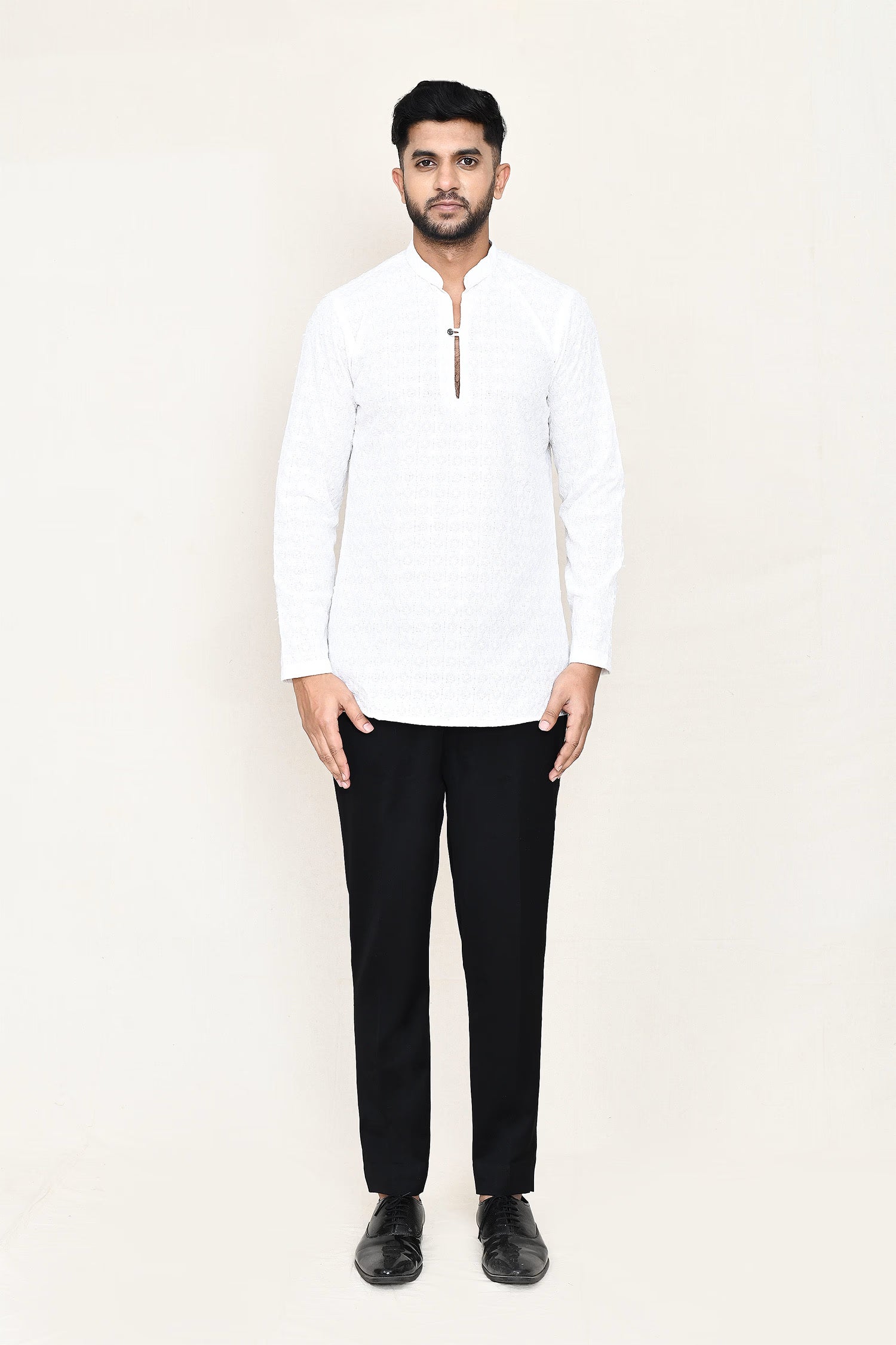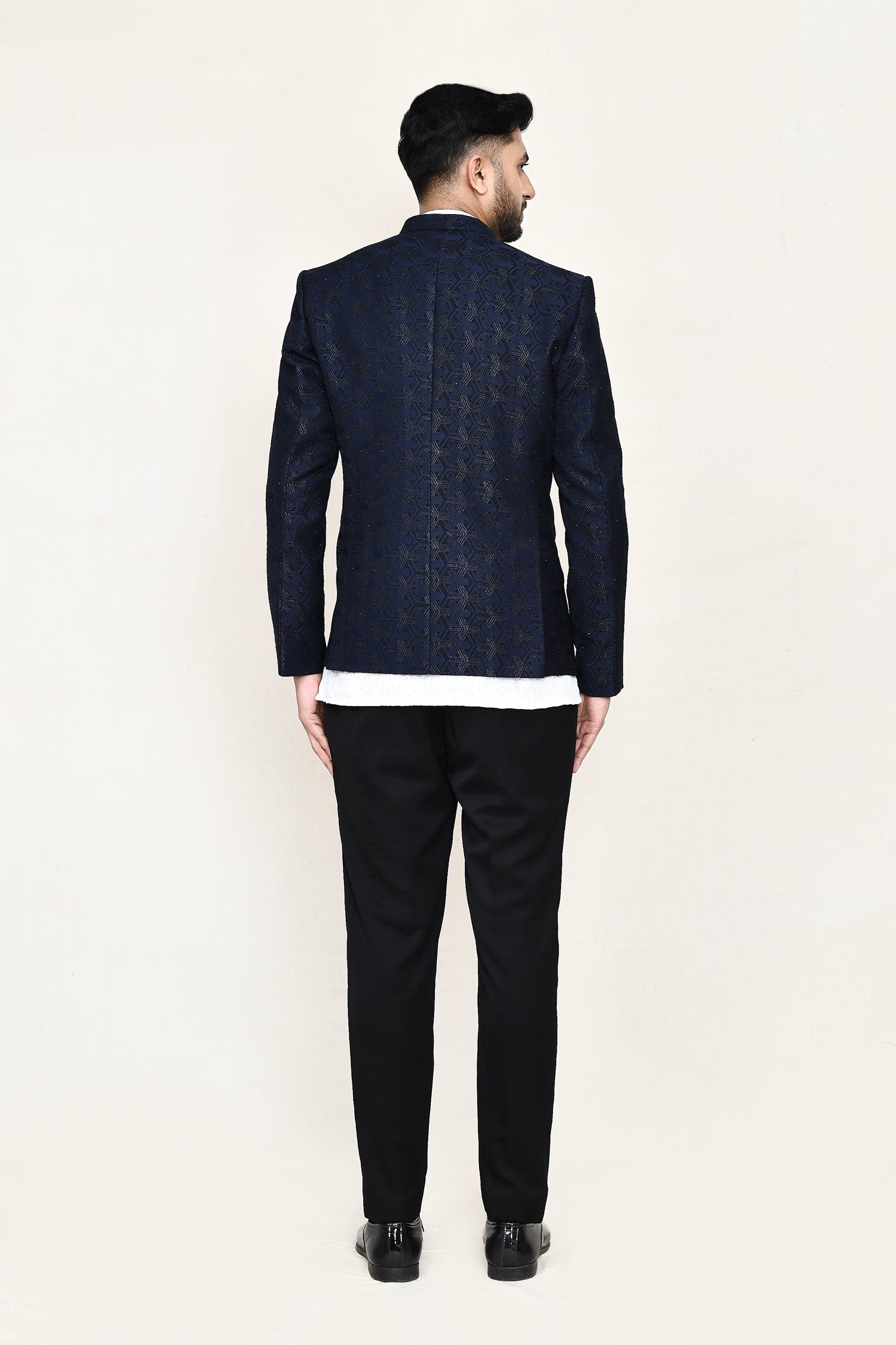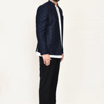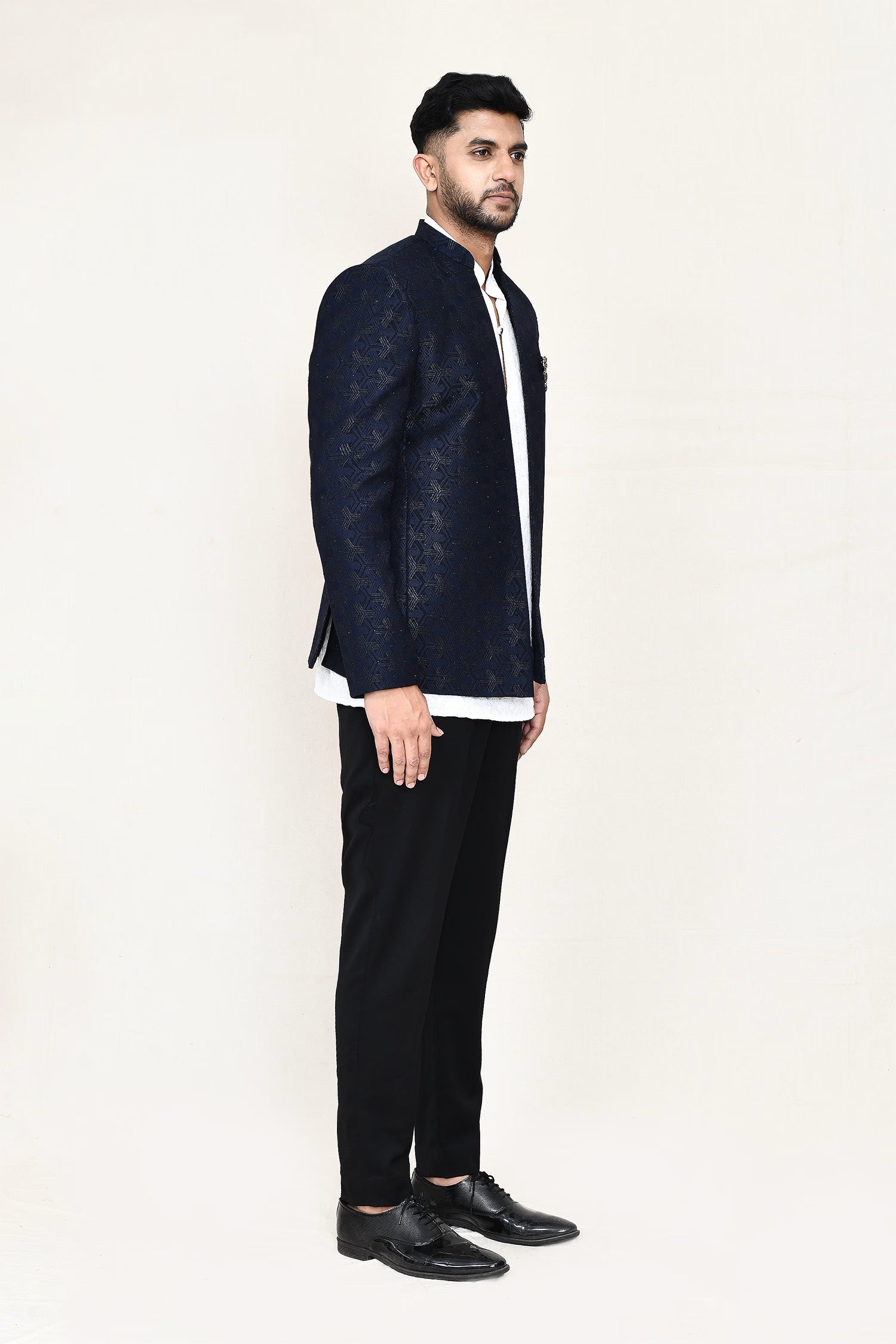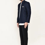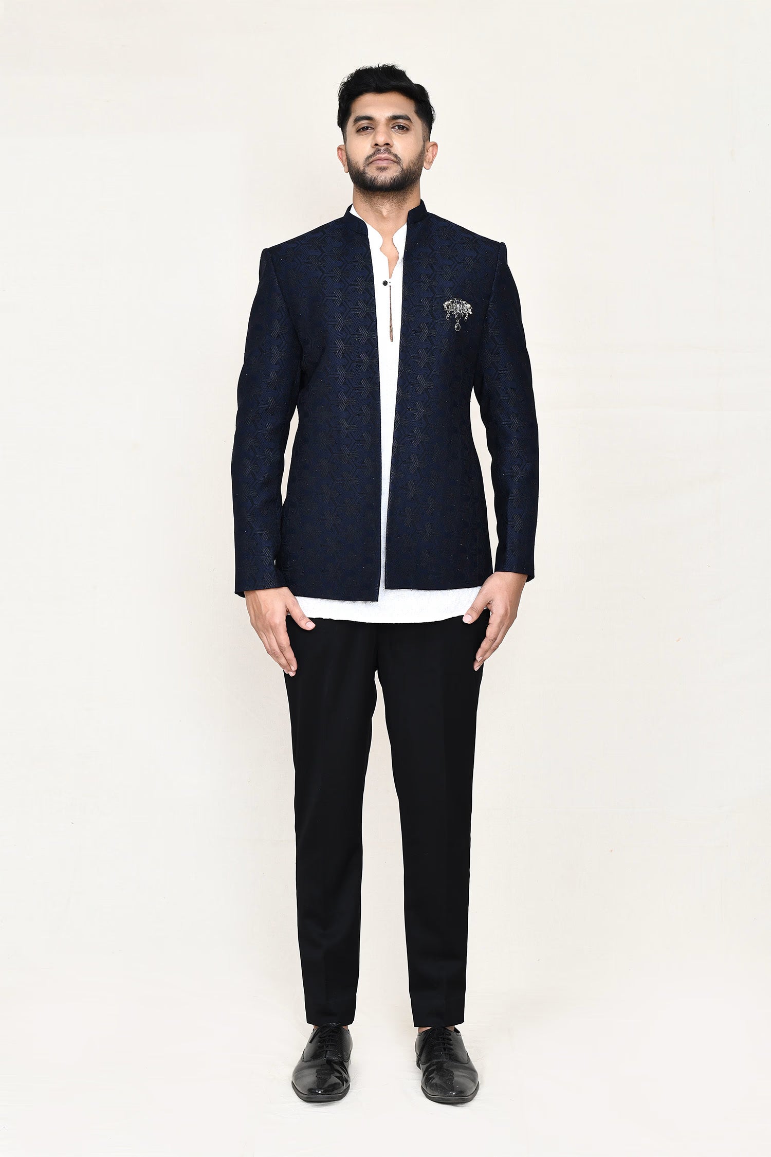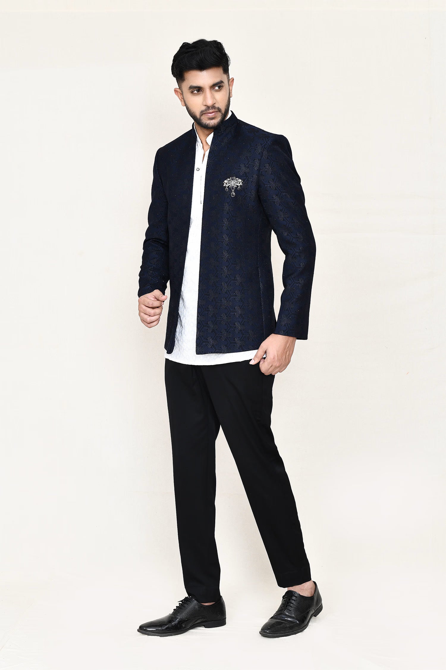 This jacquard suit set has white shirt, cotton open prince coat adorned with embroidery work which resembles chikankari ,paired with black pant, makes it simple and graceful to wear it at any occasion.