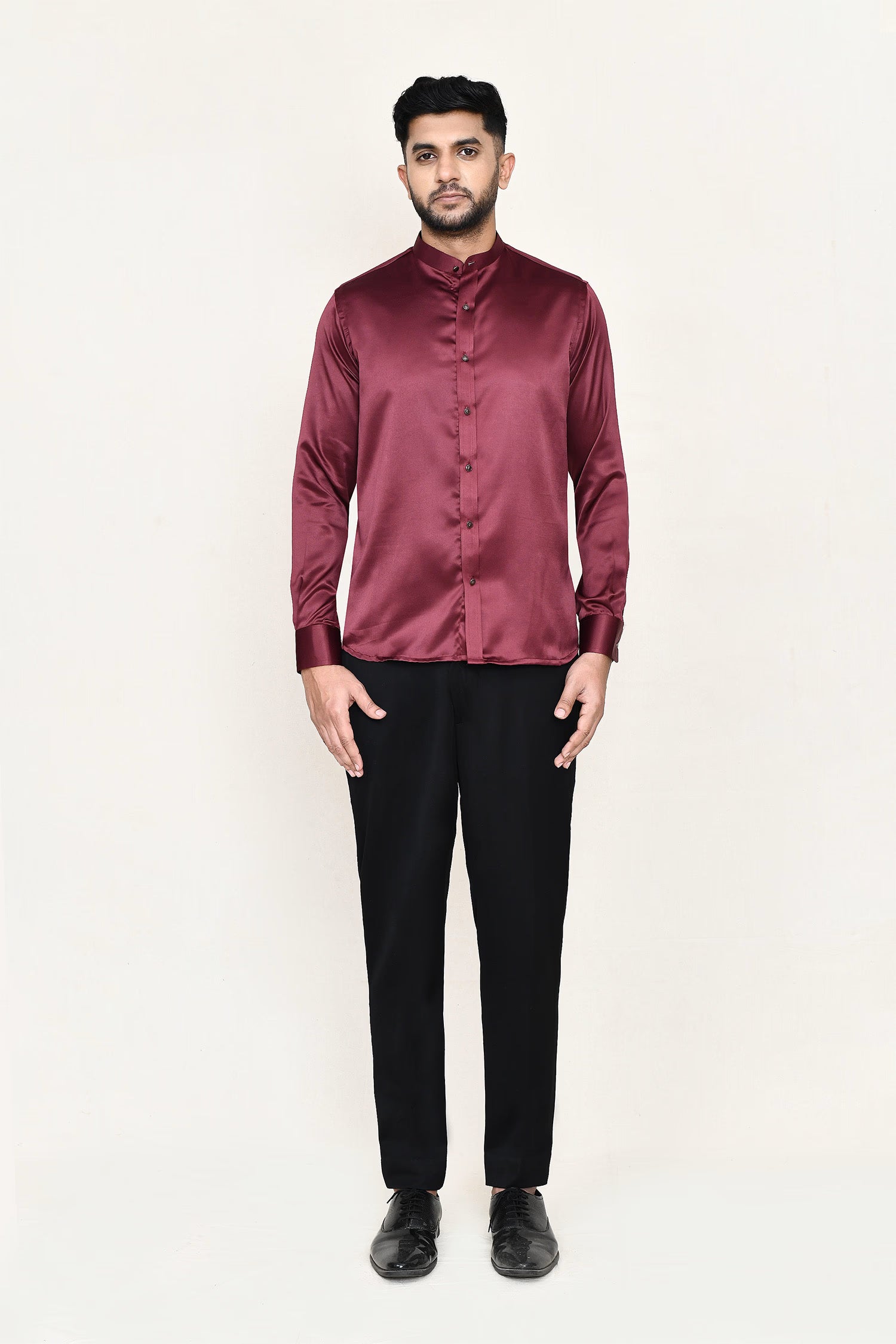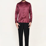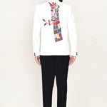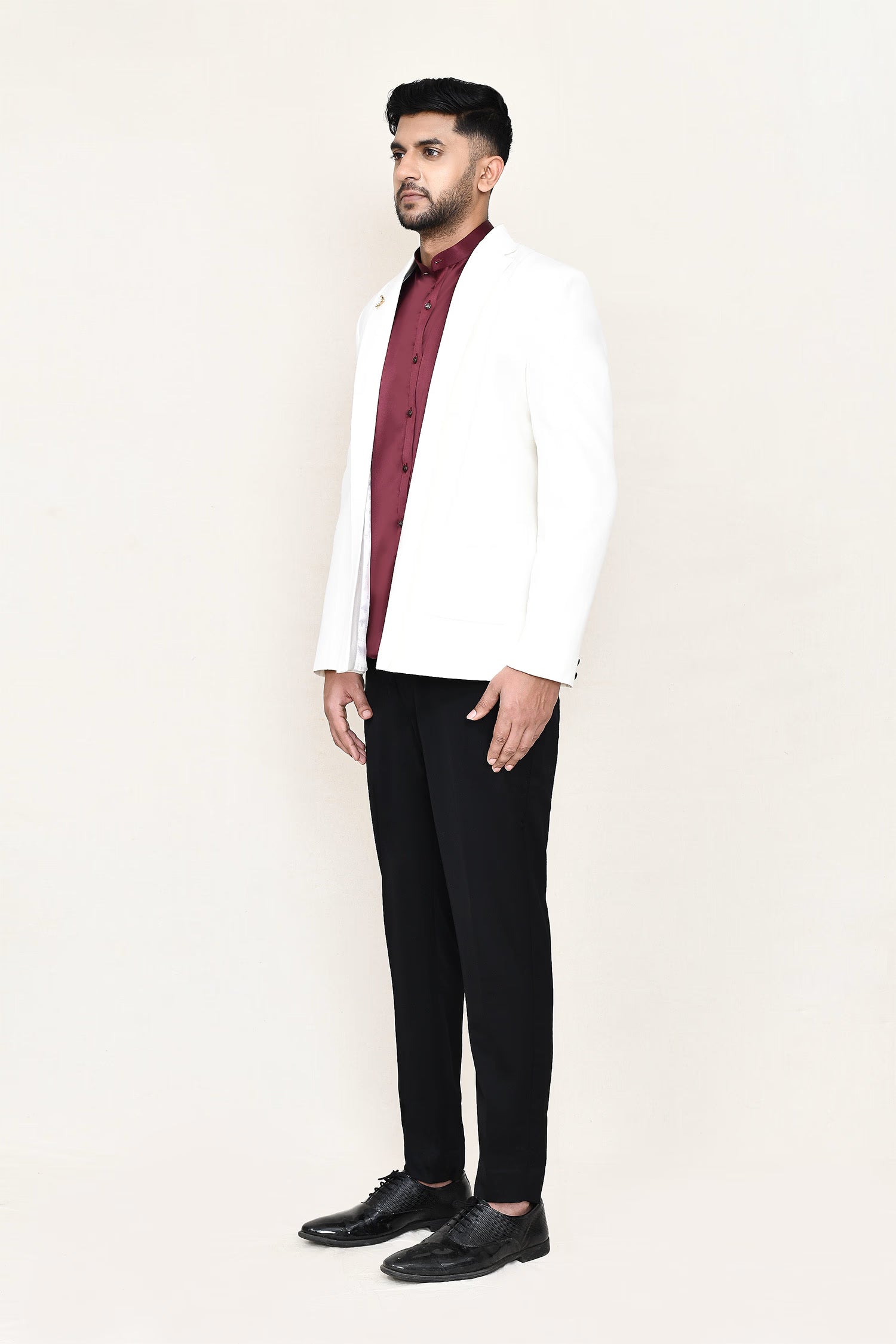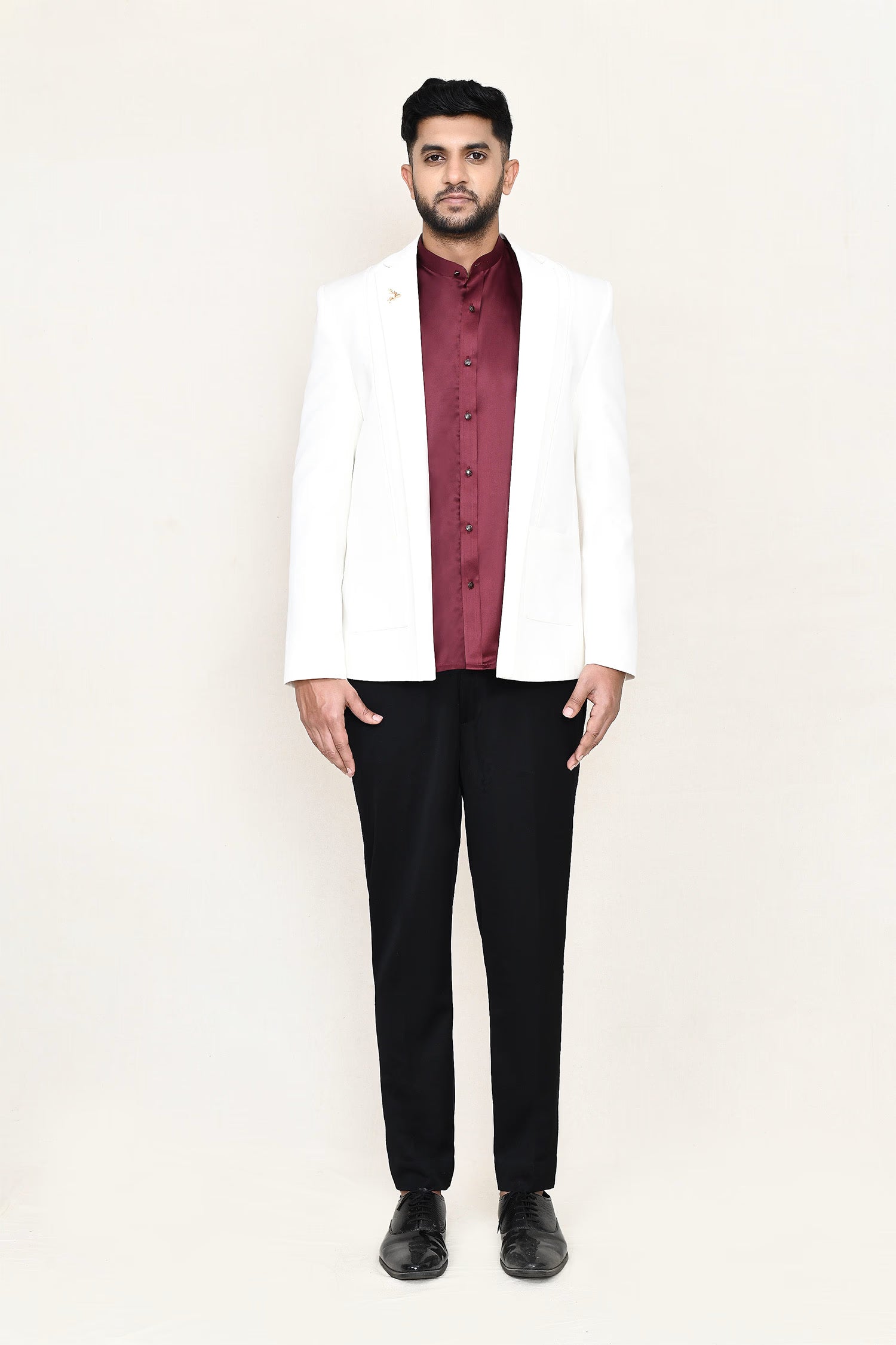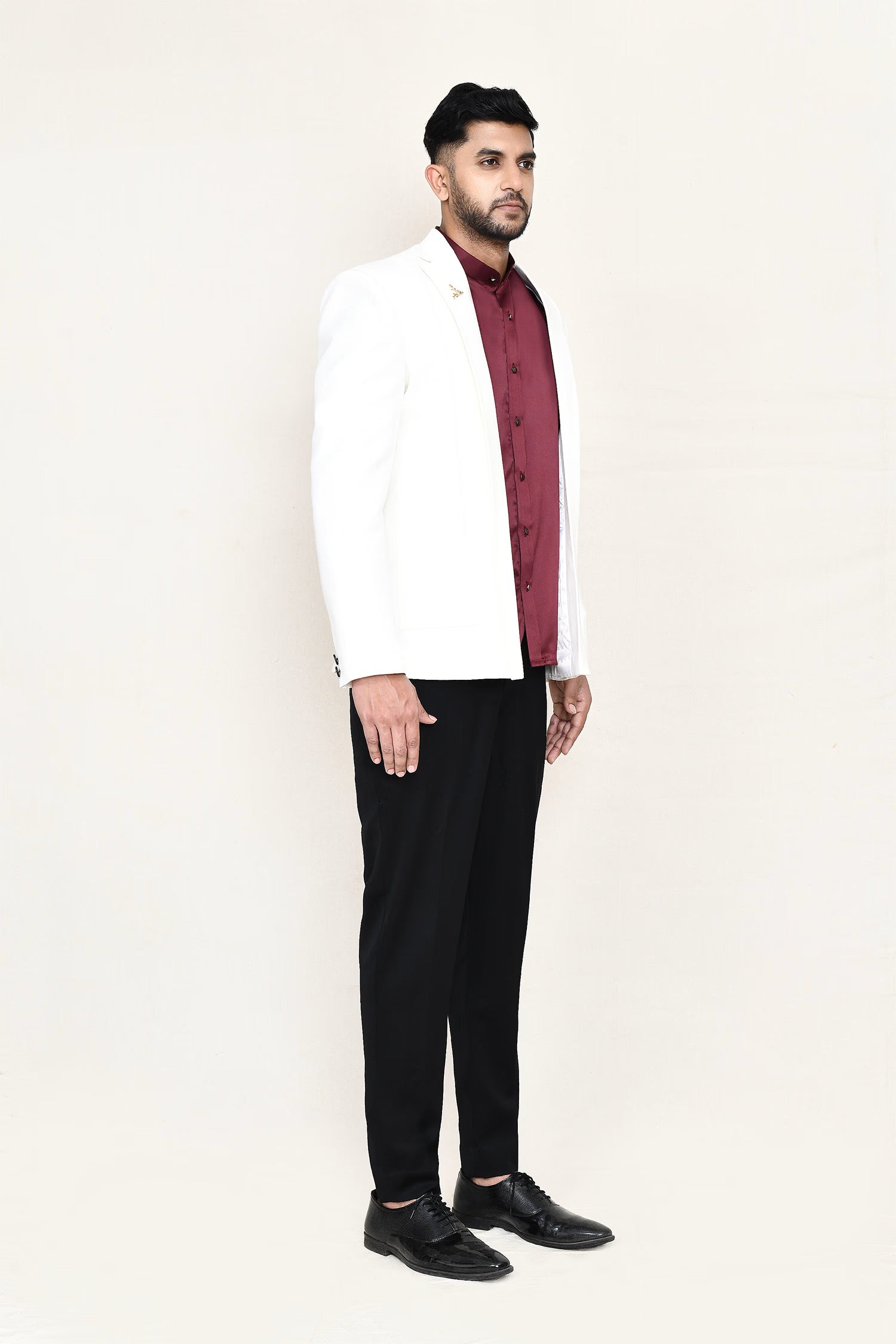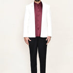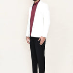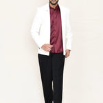 This maroon three piece suit set has polyester shirt, satin silk white jacket paired with black pant, makes it simple and graceful to wear it at any formal or informal occasion.