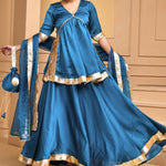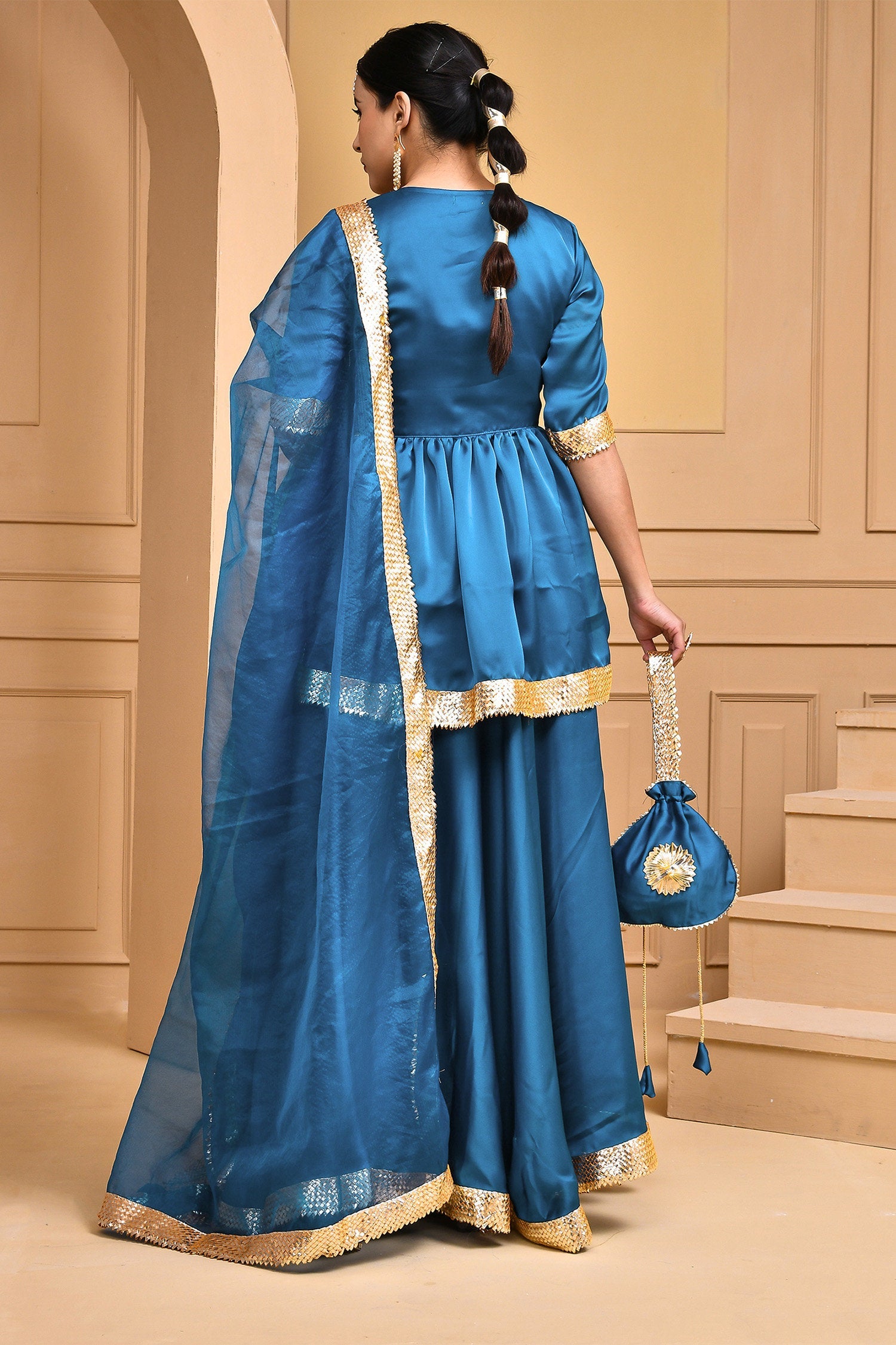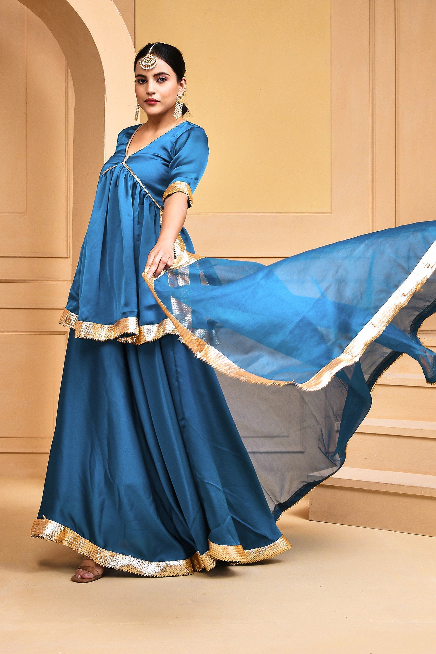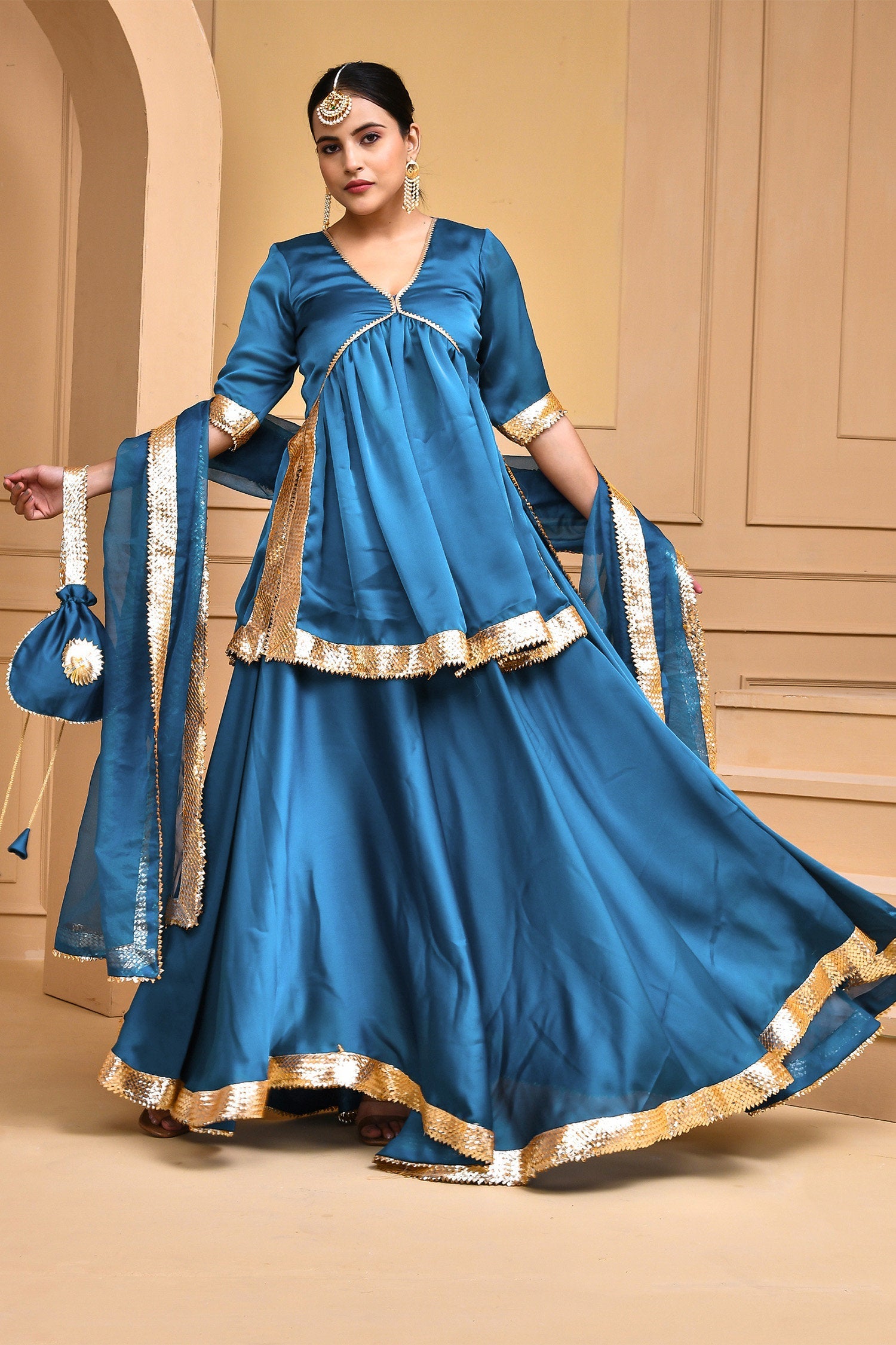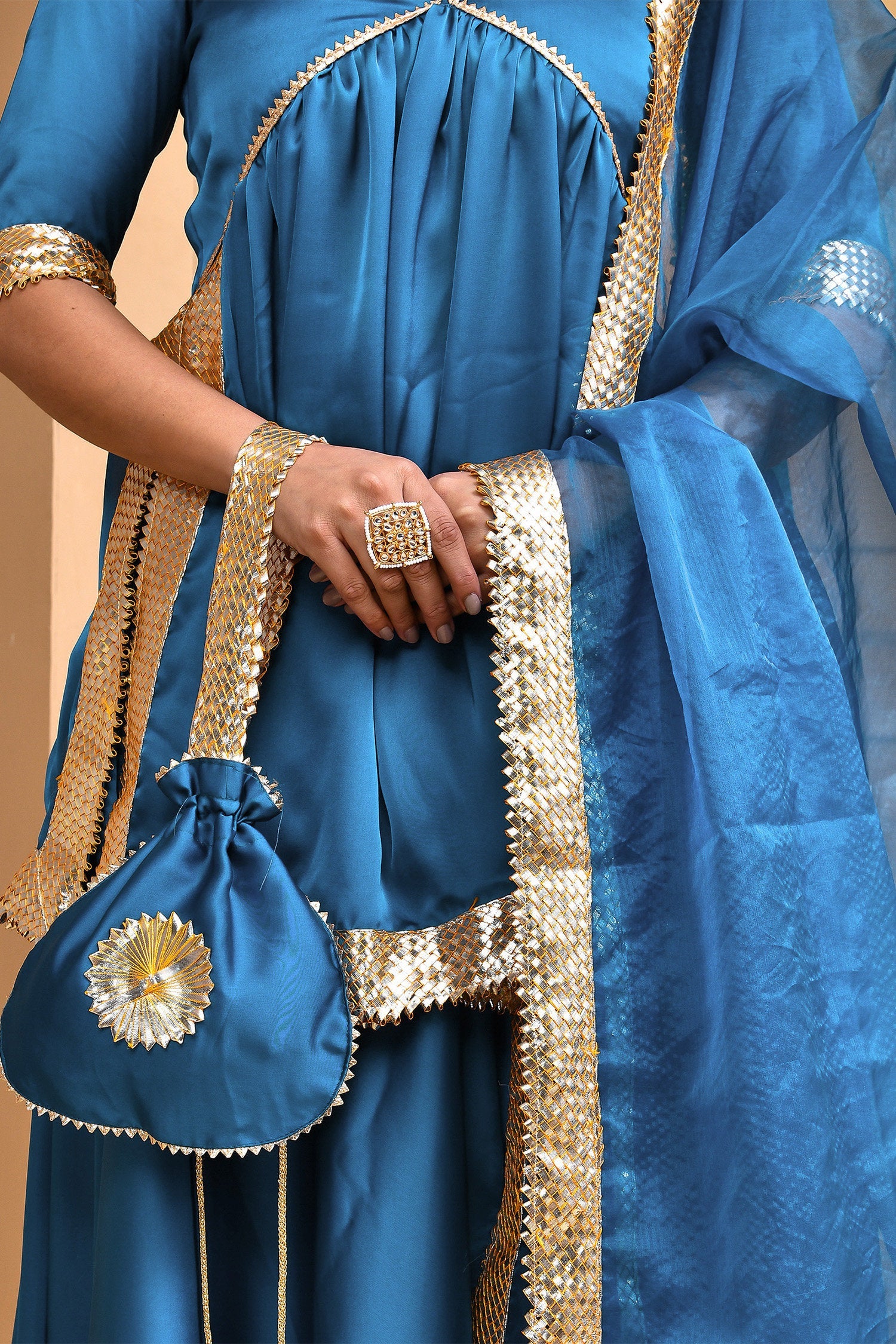 A perfect choice for the wedding includes Denim blue satin lehenga set adorned with elegant lace work on top, dupatta and lehenga .The potli adds the finishing touch to the entire garment.