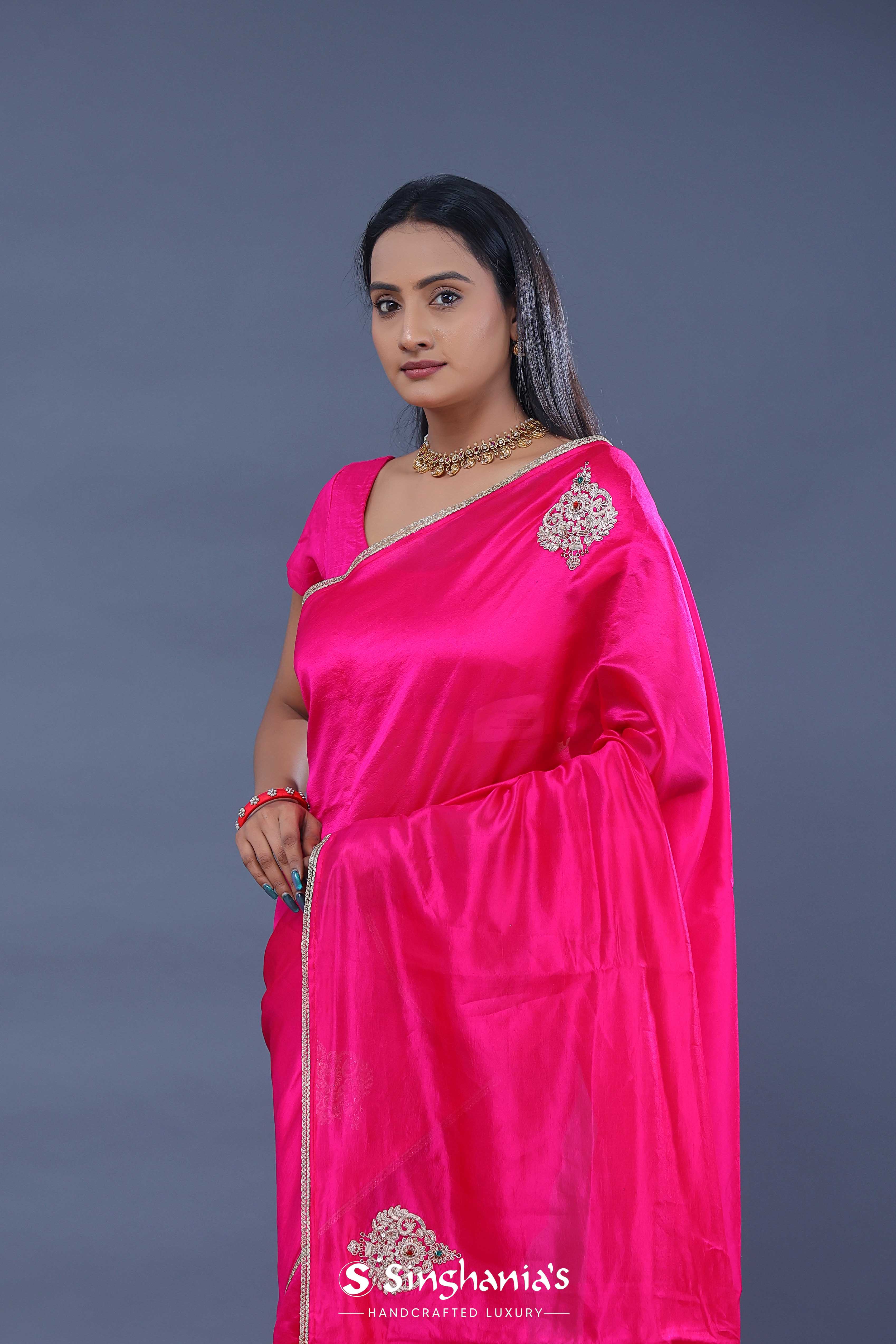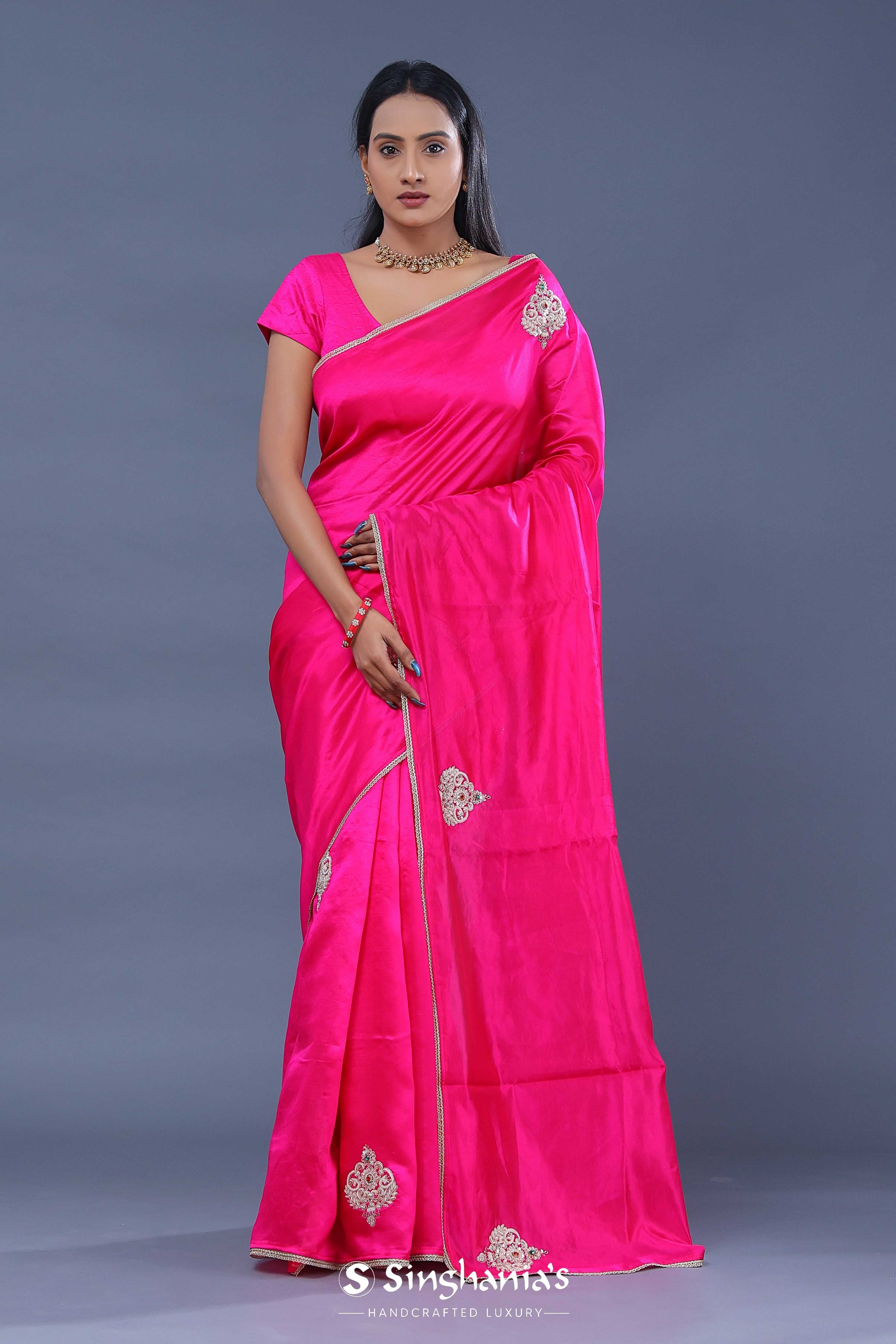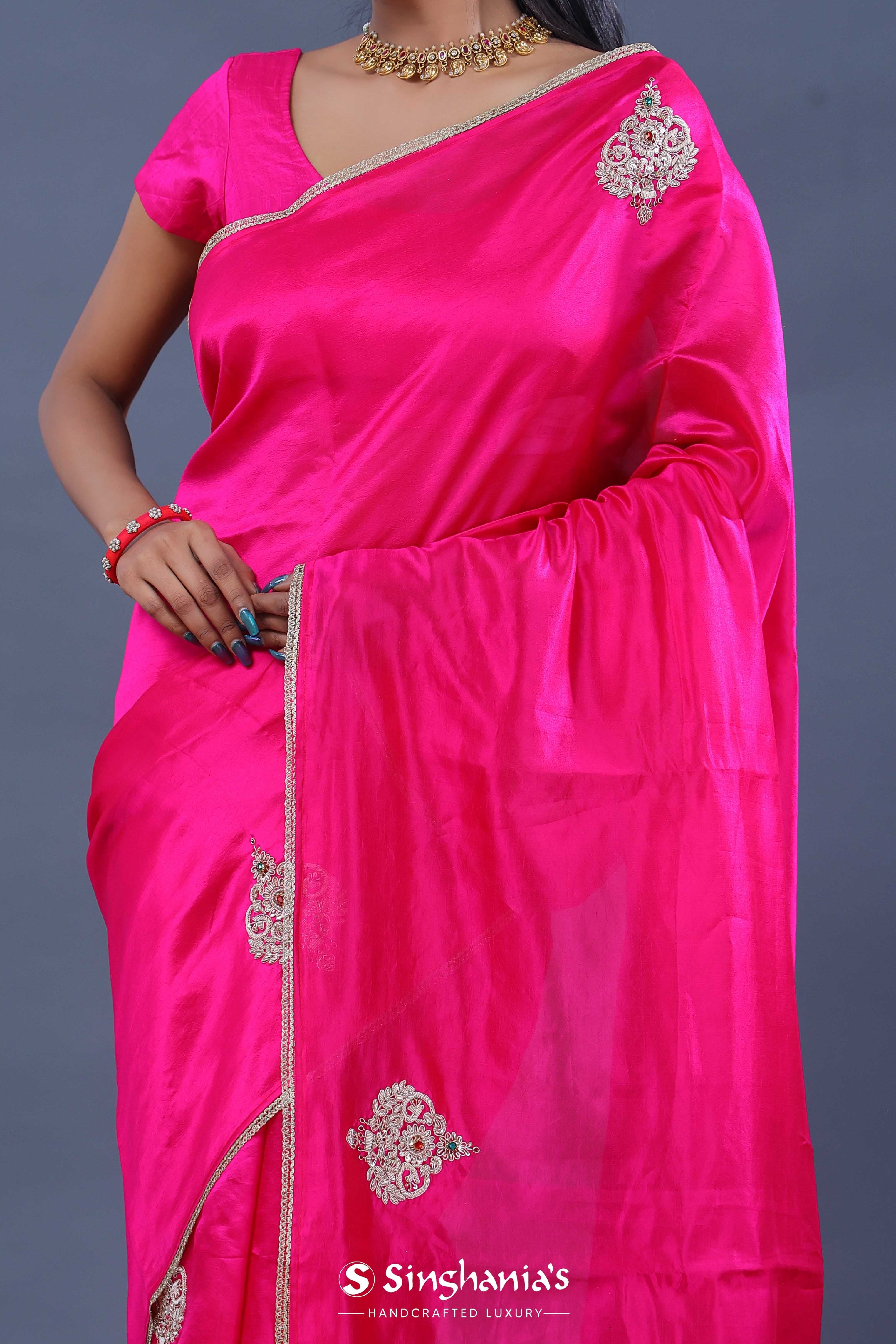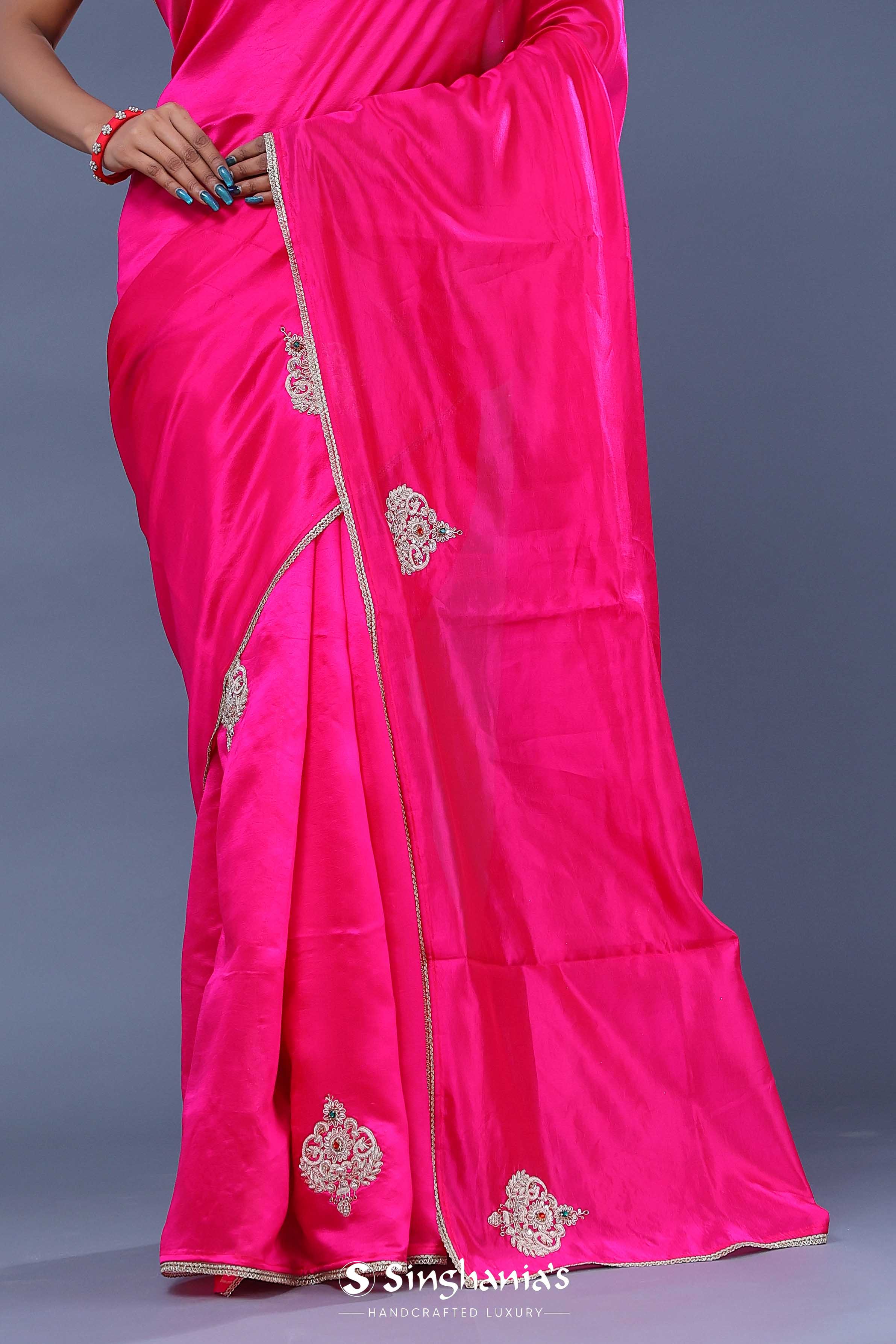 The smooth punch pink satin crepe plain saree embellished with butta's formed by zardosi work, green and red gems placed at the centre of the design accompanied with the border which is braided lace with an interlocking pattern.
