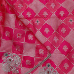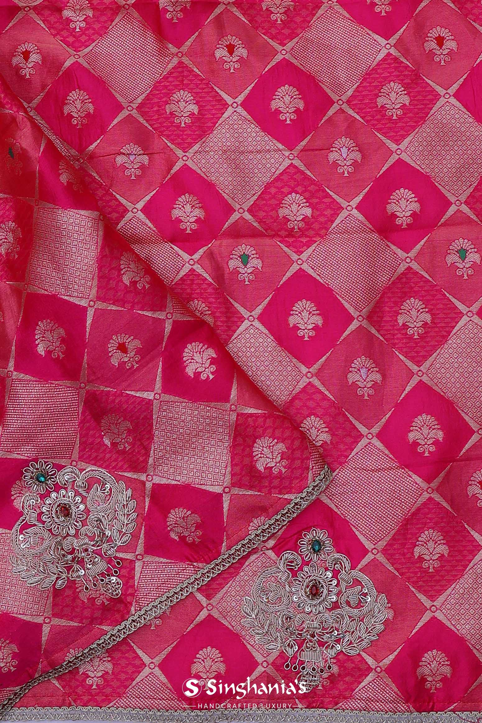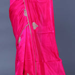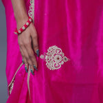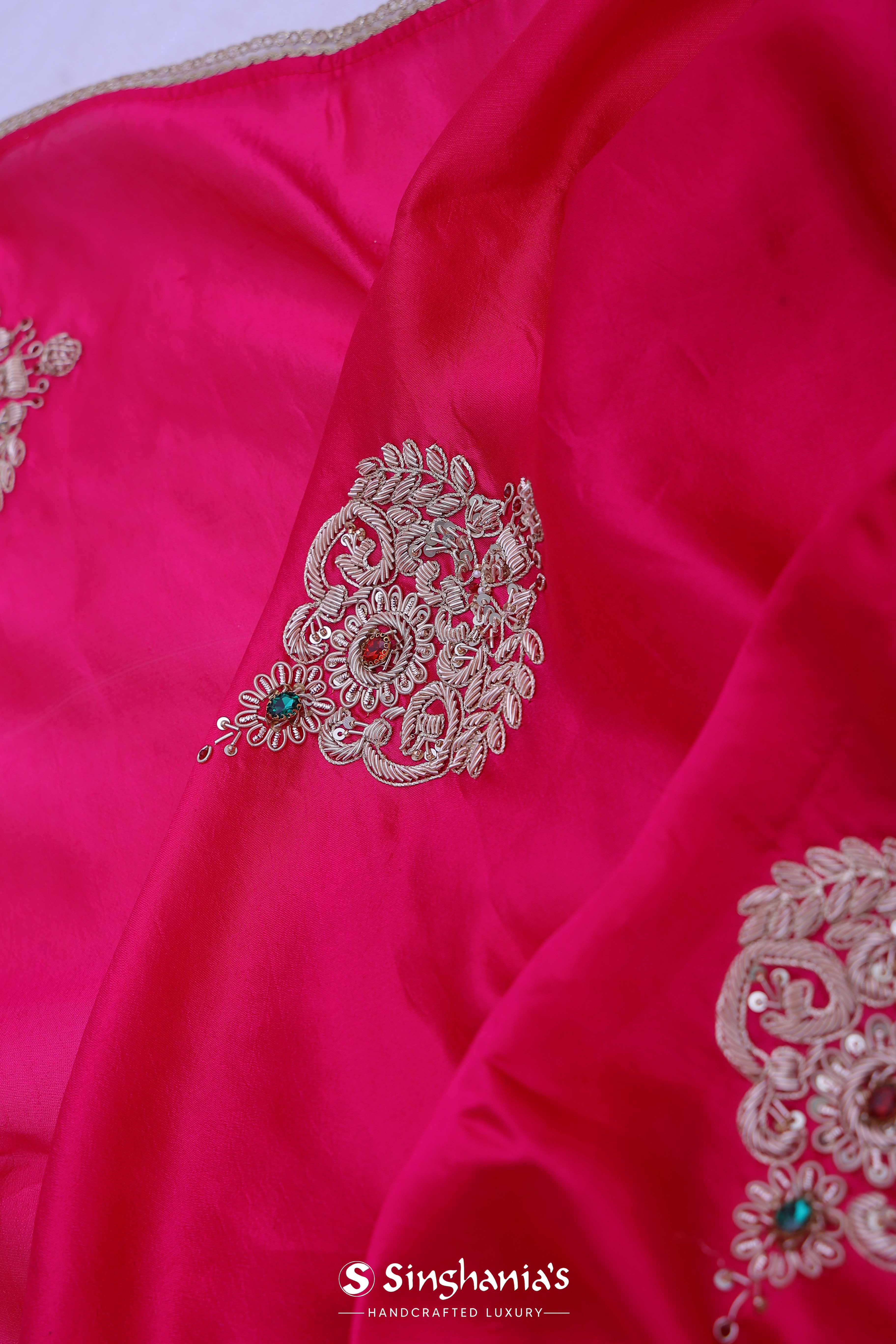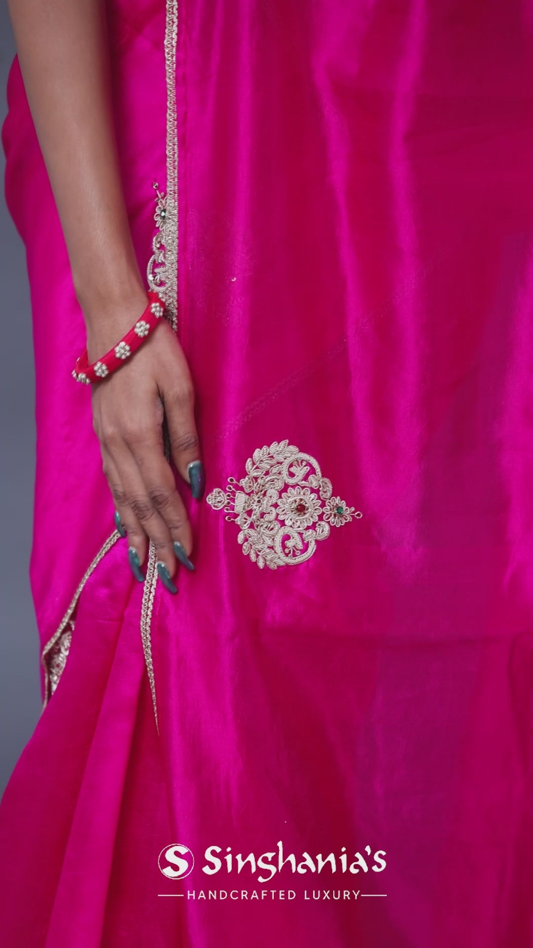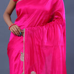 The smooth punch pink satin crepe plain saree embellished with butta's formed by zardosi work, green and red gems placed at the centre of the design accompanied with the border which is braided lace with an interlocking pattern.