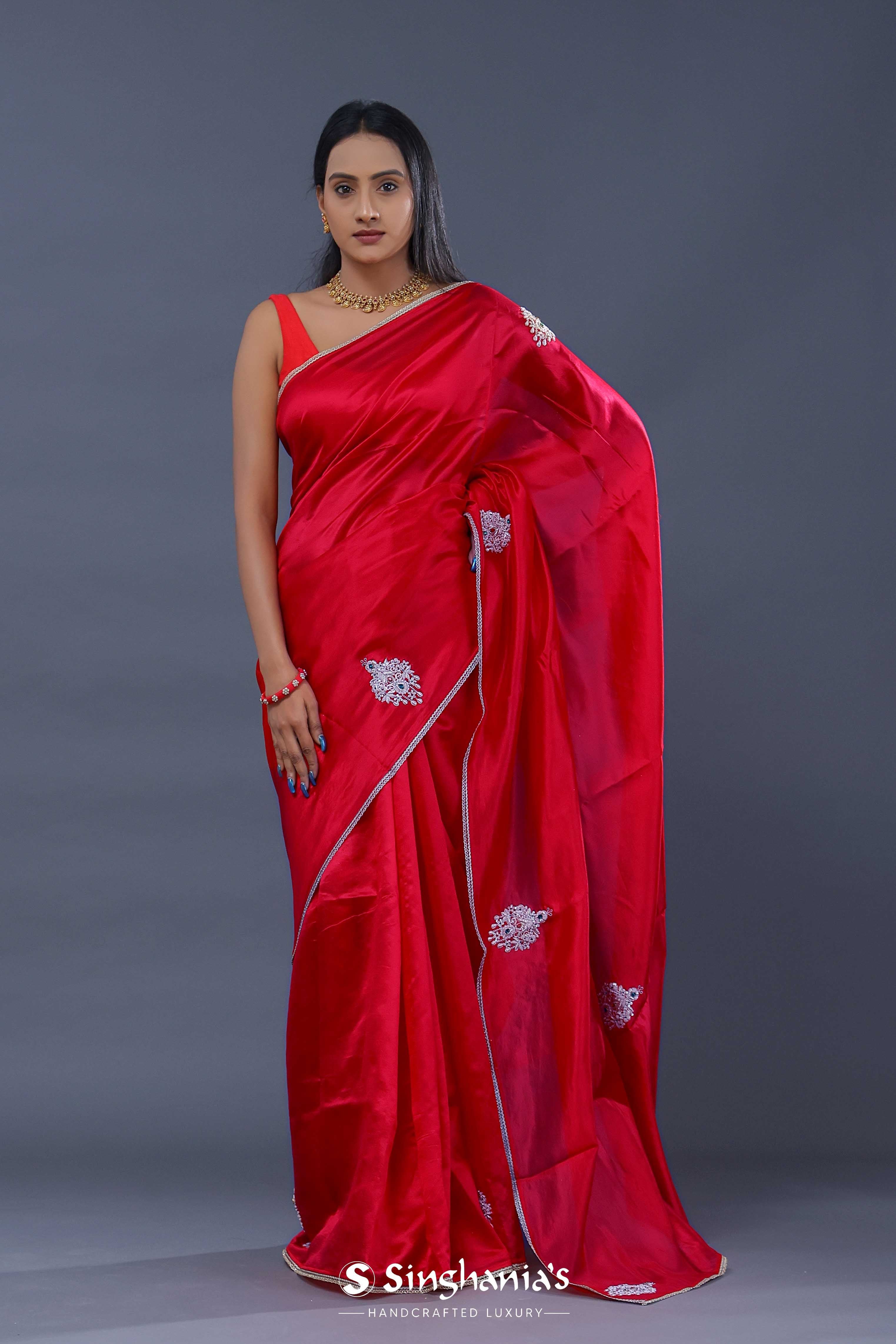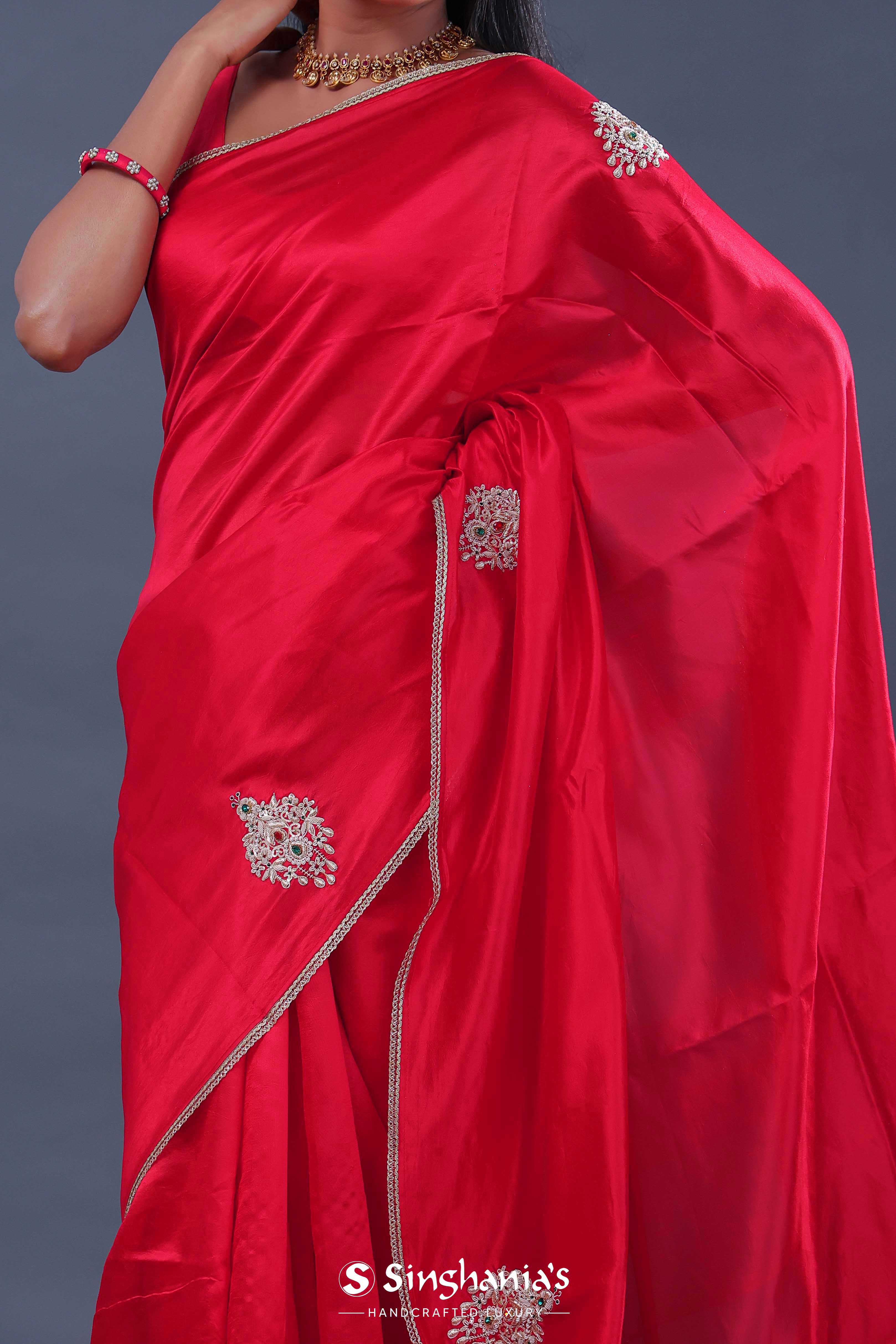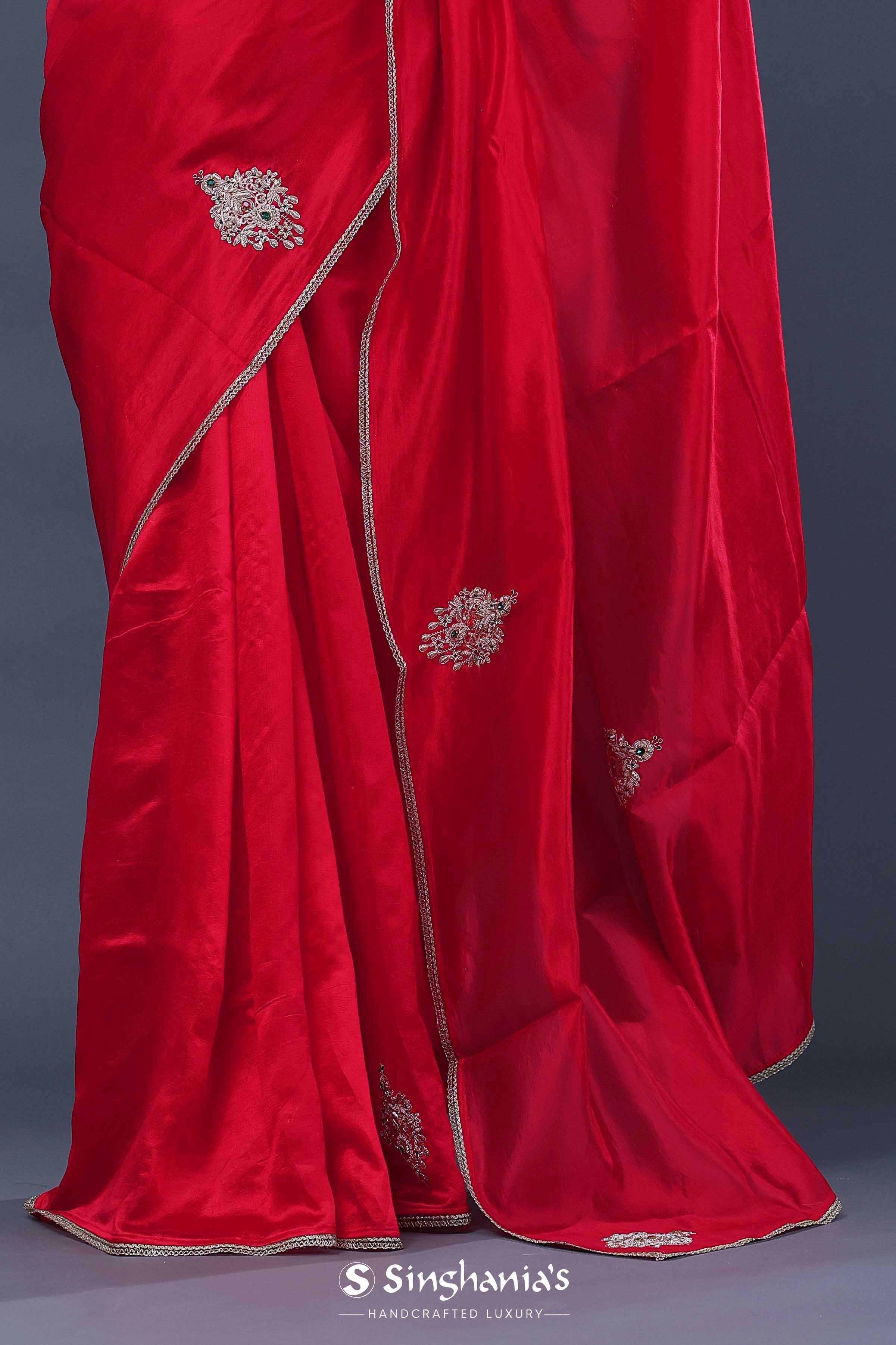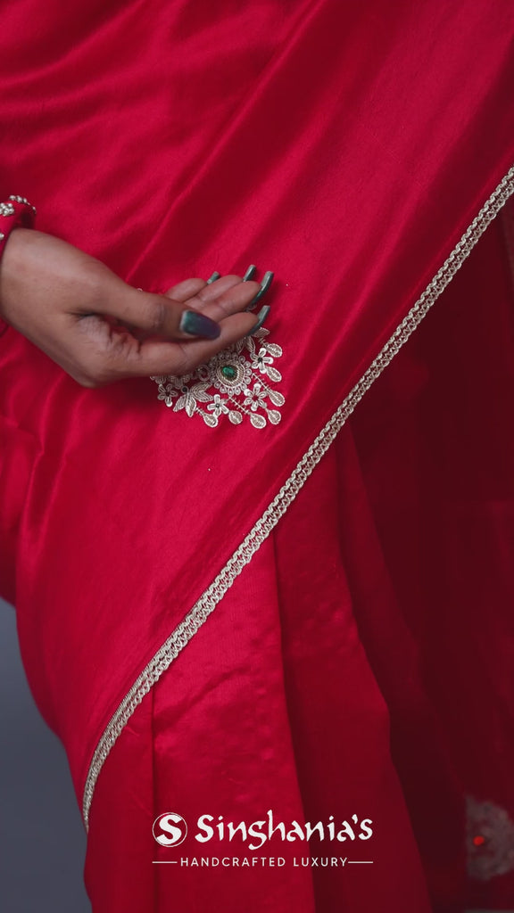 The smooth red satin crepe plain saree embellished with butta's formed by silver zardosi work, green and red gems placed at the centre of the design accompanied with the border which is braided lace with an interlocking pattern.