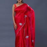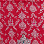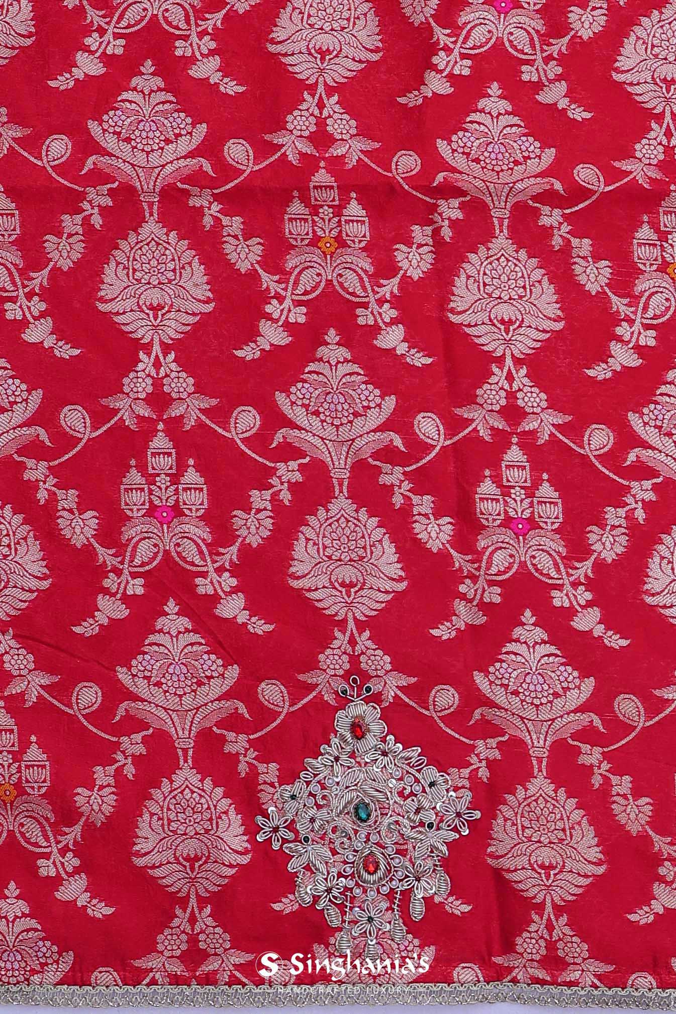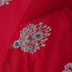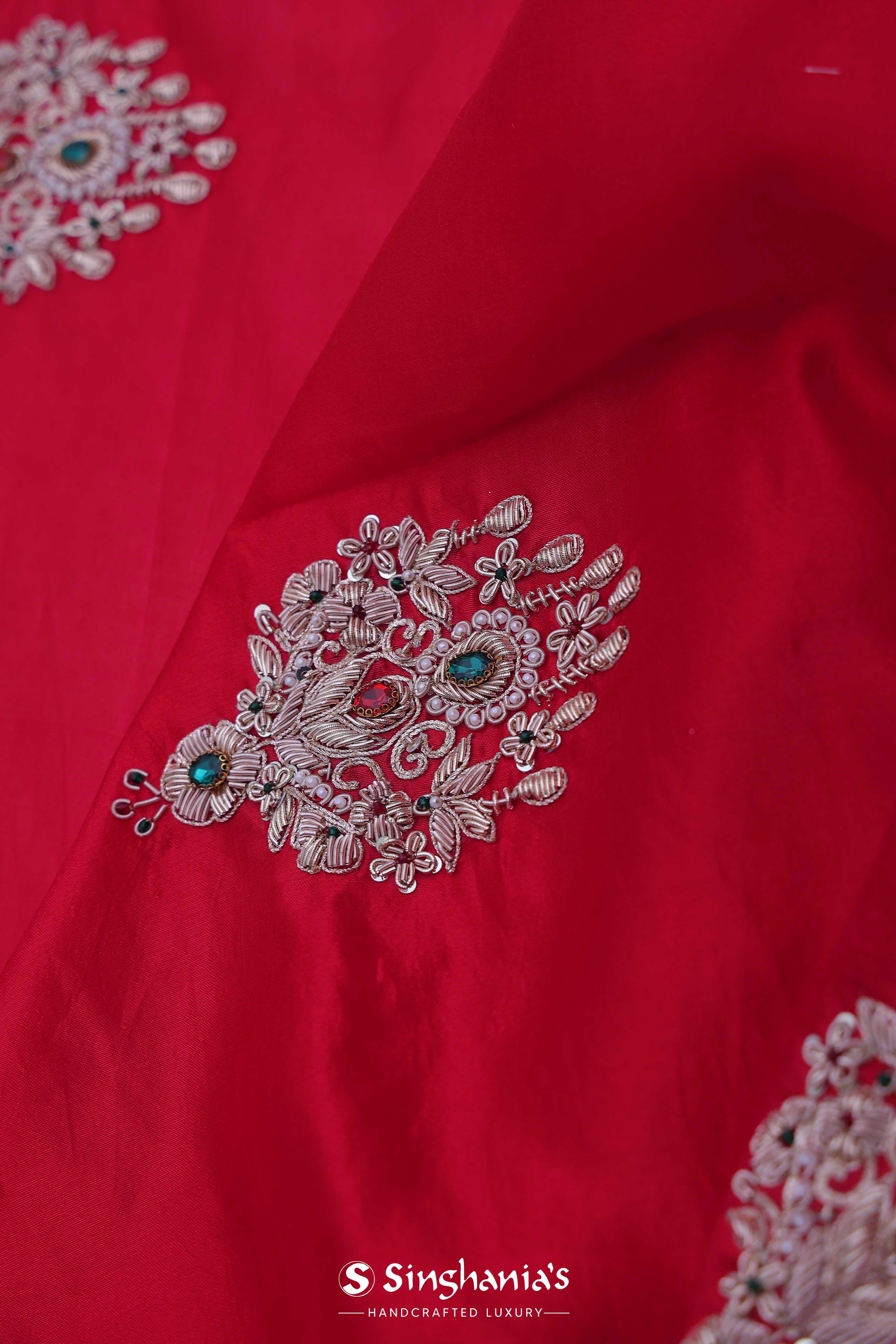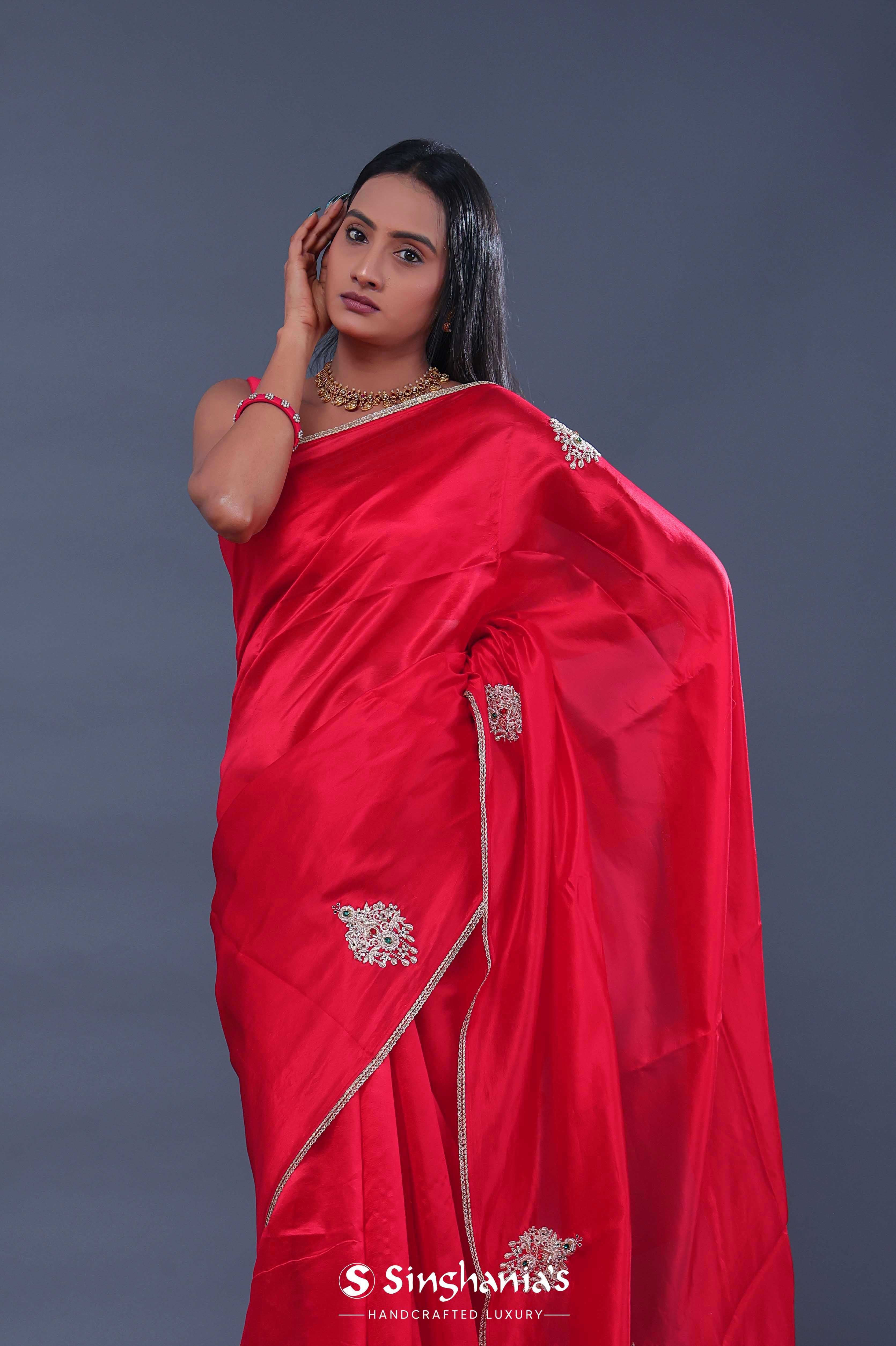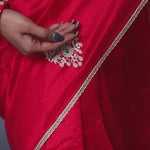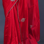 The smooth red satin crepe plain saree embellished with butta's formed by silver zardosi work, green and red gems placed at the centre of the design accompanied with the border which is braided lace with an interlocking pattern.