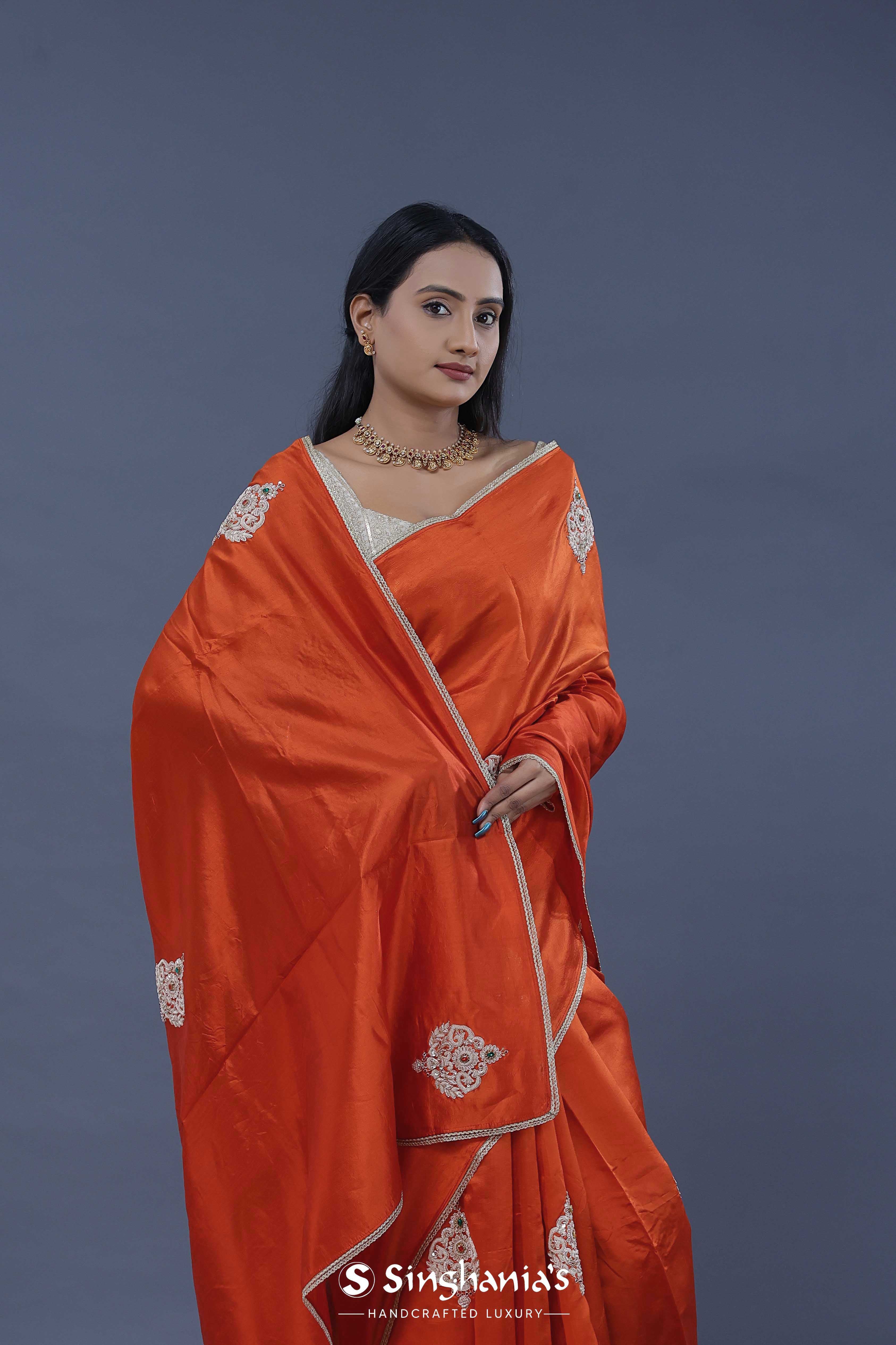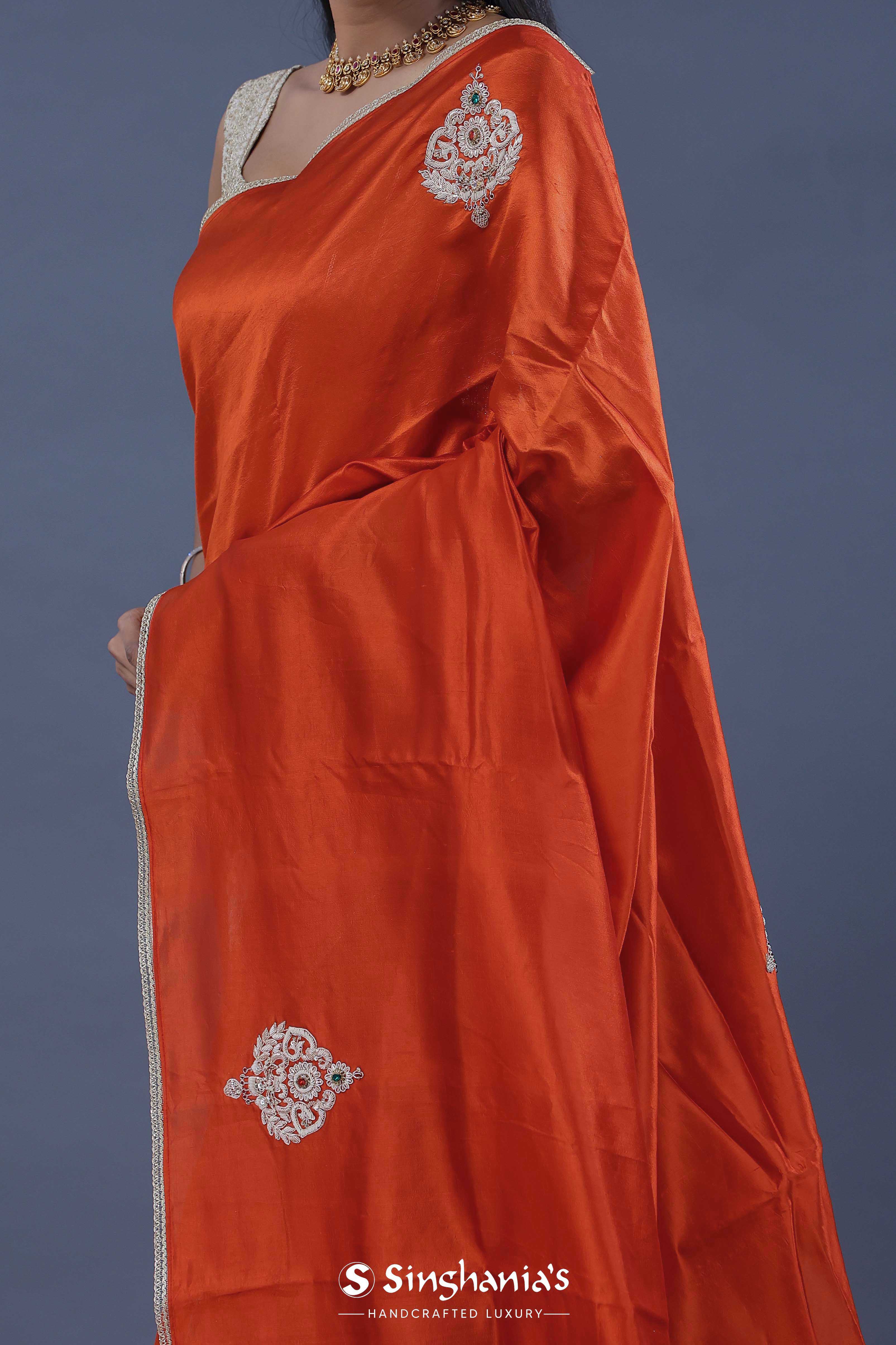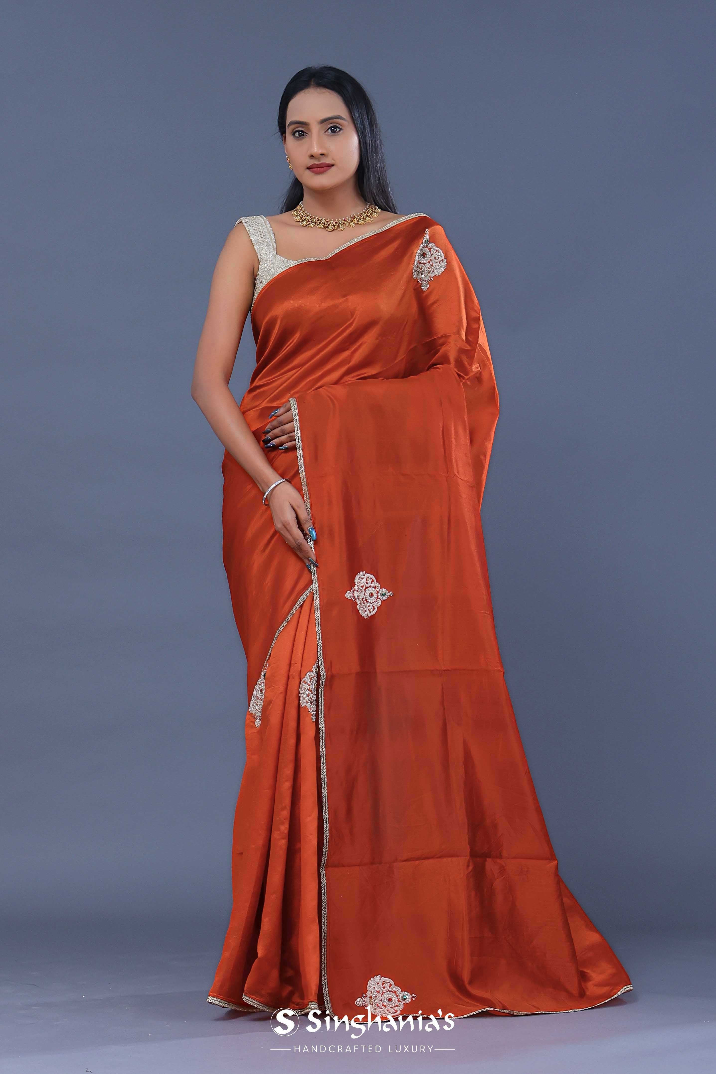 The smooth Rusty orange colour satin crepe plain saree embellished with butta's formed by zardosi work, green and red gems placed at the centre of the design accompanied with the border which is braided lace with an interlocking pattern.