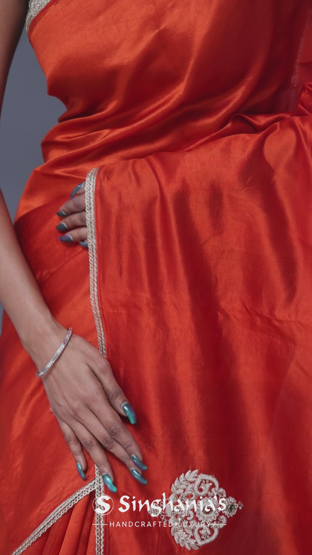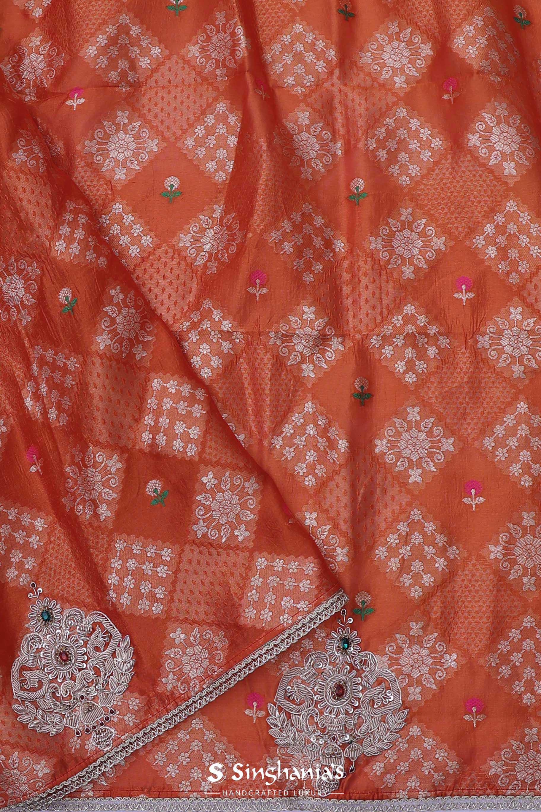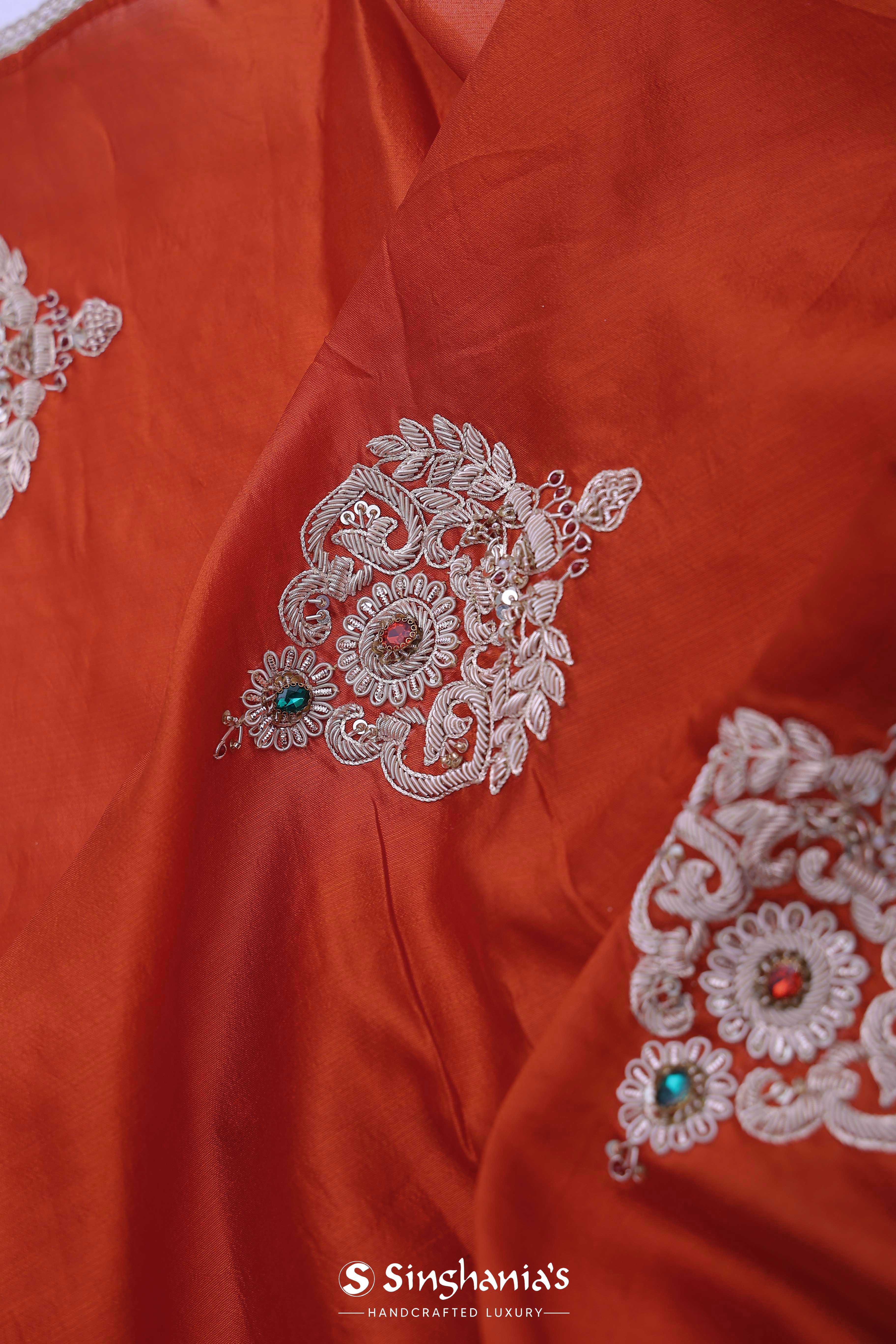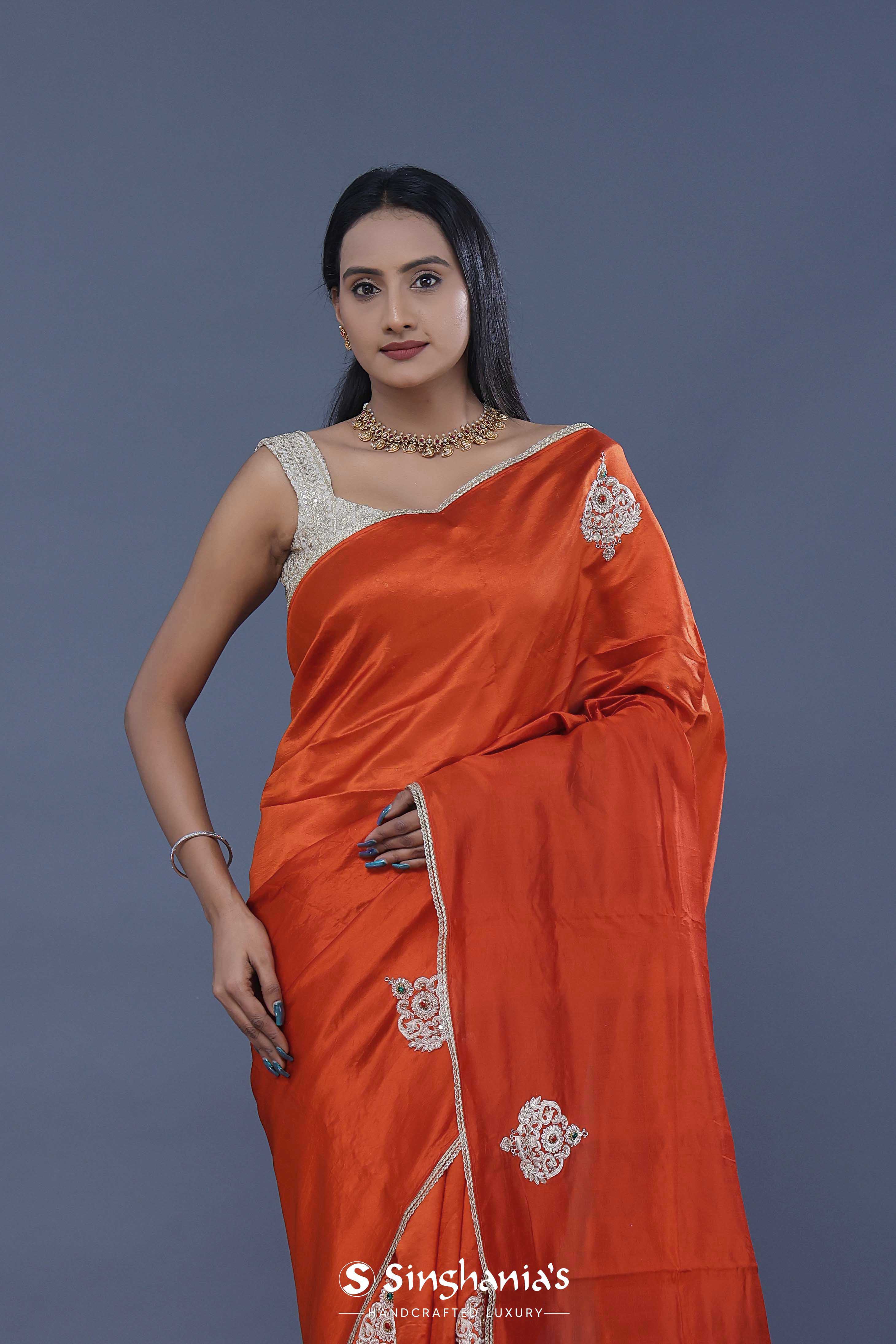 The smooth Rusty orange colour satin crepe plain saree embellished with butta's formed by zardosi work, green and red gems placed at the centre of the design accompanied with the border which is braided lace with an interlocking pattern.